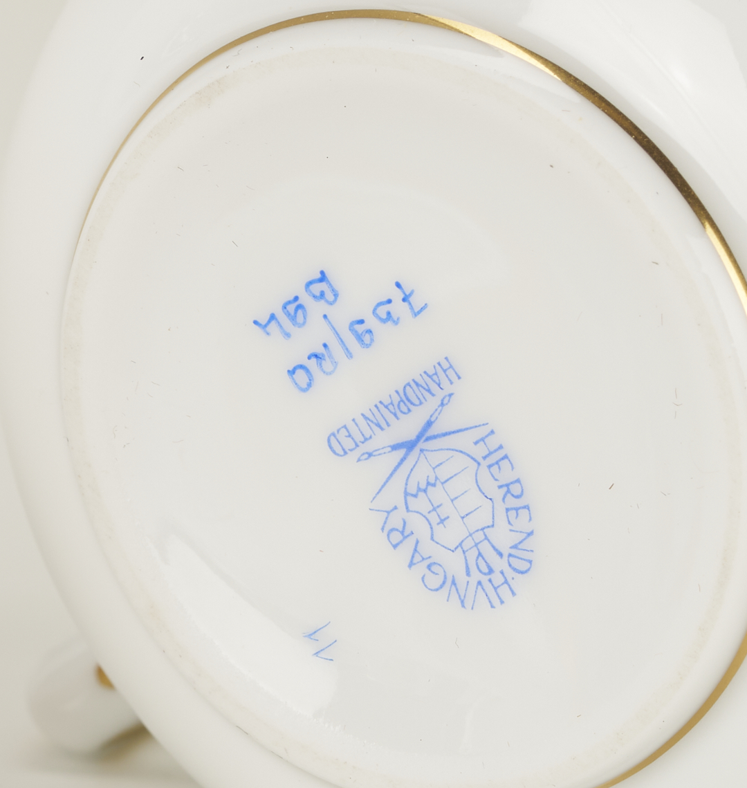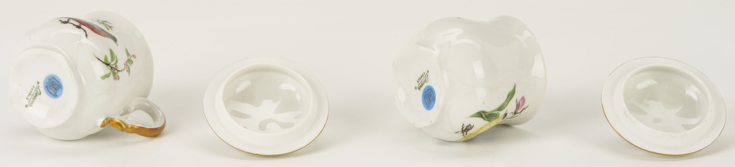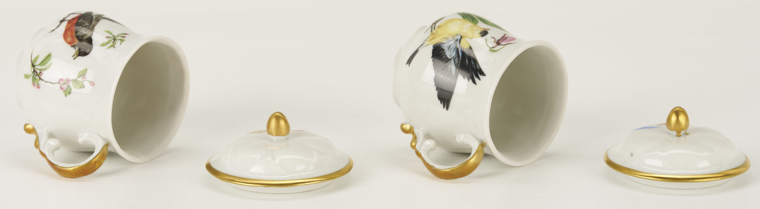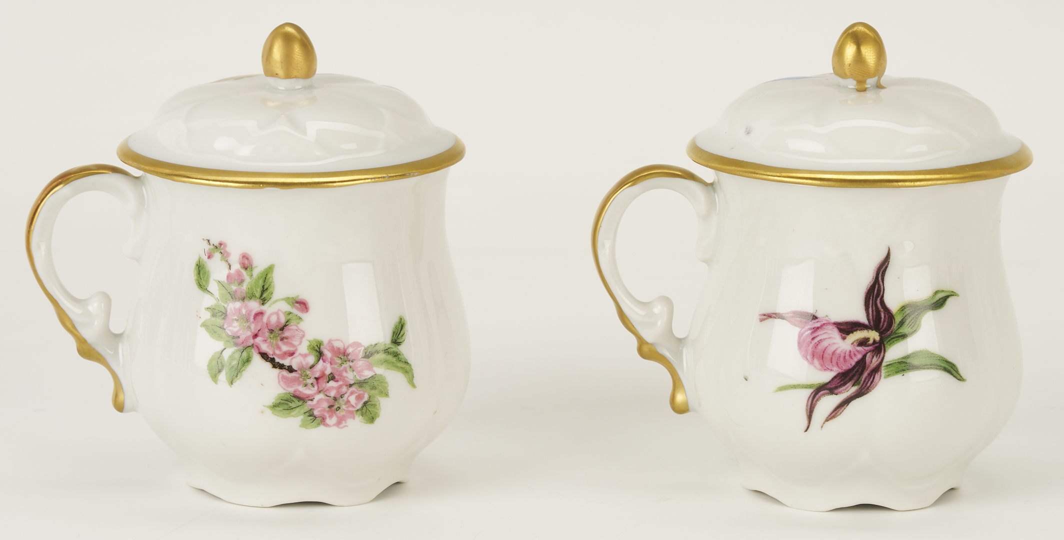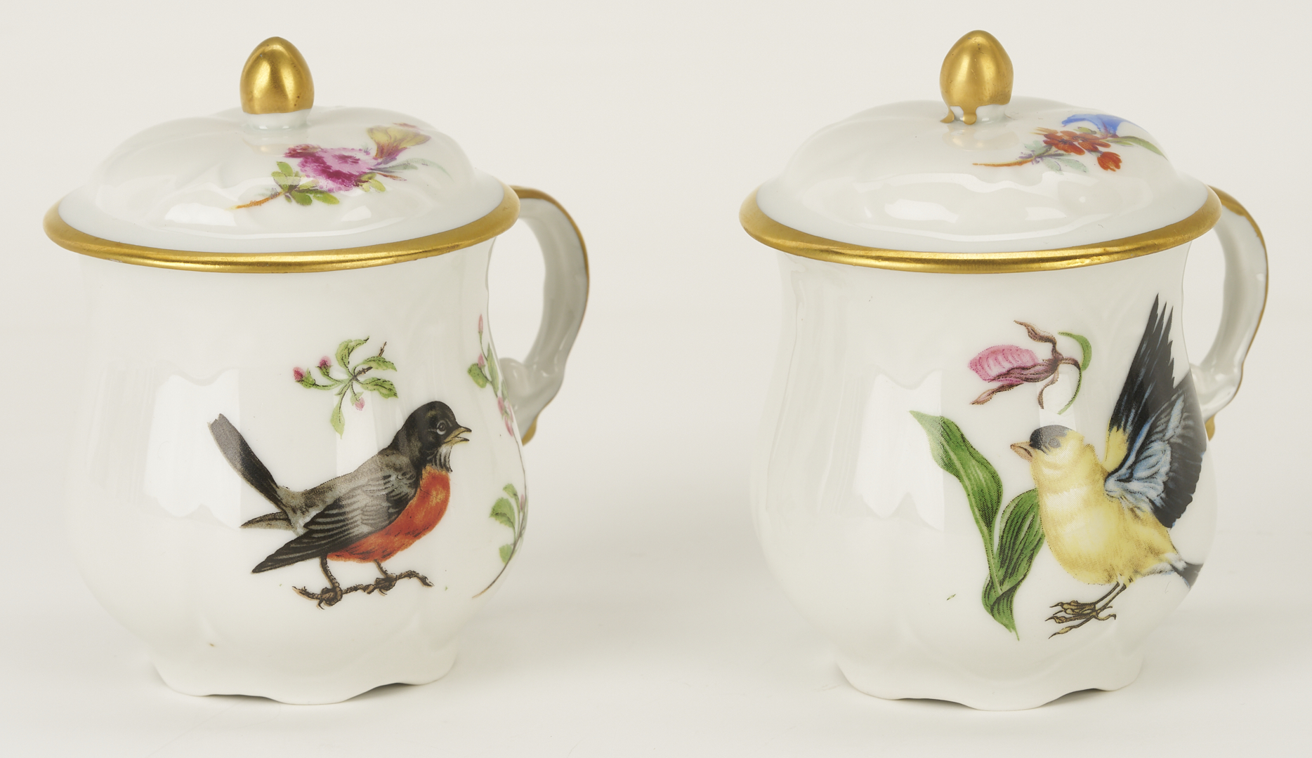 Grouping of seven (7) porcelain pots de creme from various makers. 1st – 2nd Items: Herend cups with covers, each hand-painted, one in rust-colored “Chinese Bouquet” pattern, marked with Herend stamp and 739/AOG, the other in their “Rothschild Bird” pattern with bird finial, marked 739/RO B94. 3rd – 4th Items: Pair of Limoges cups with covers, in bird and flowers motif, with gilt accents. Marked Limoges, France and with a “J” stamp in blue; 5th -6th Items: Pair of unmarked cups with covers, in a flower and garland design, each with gilt accents to handles and lids; 7th Item: Mottahedeh cup with cover in their Duke of Gloucester pattern, with fruit and insect motif, topped with a berry finial. Items range in size from 3 to 3 1/2 in H.