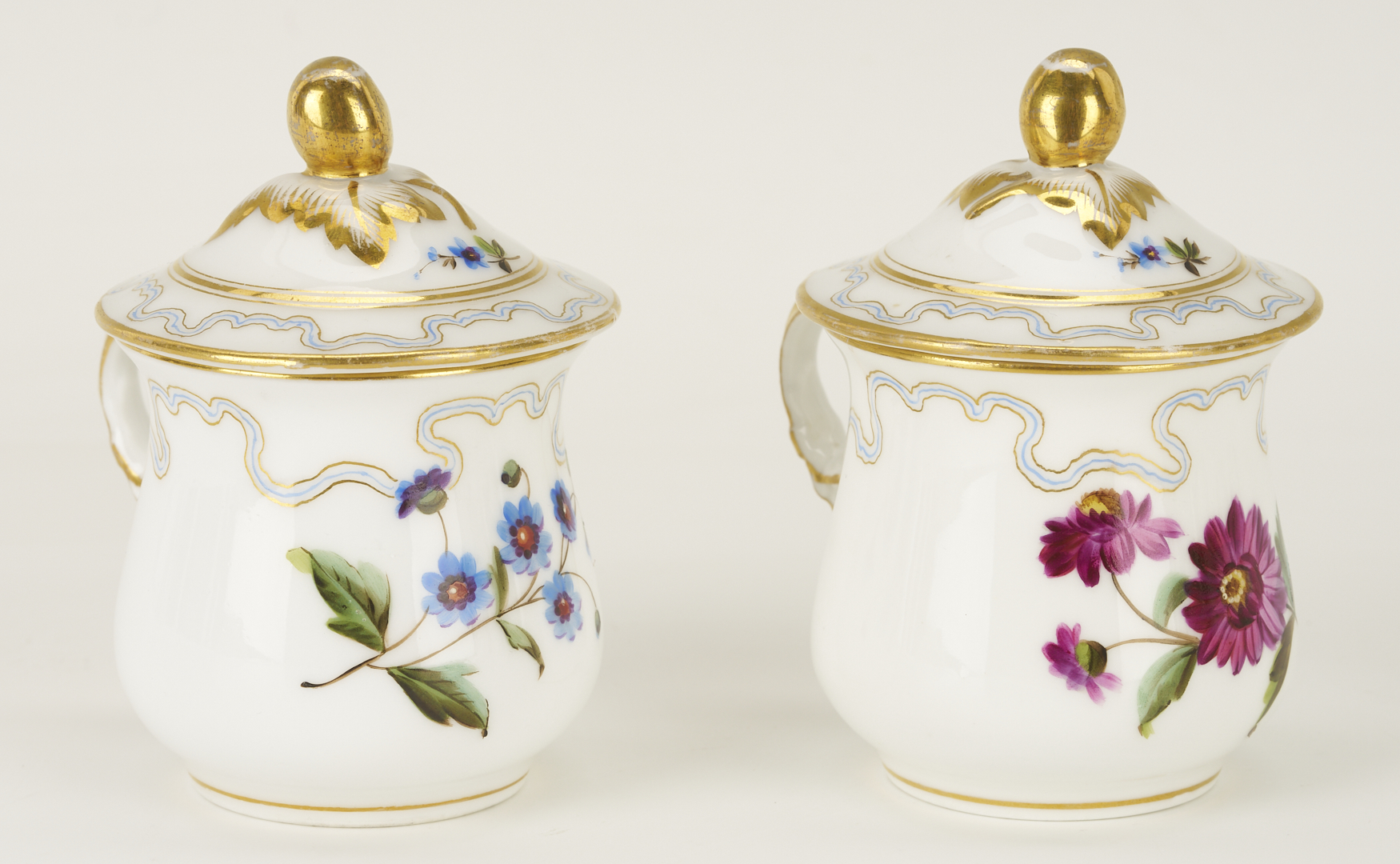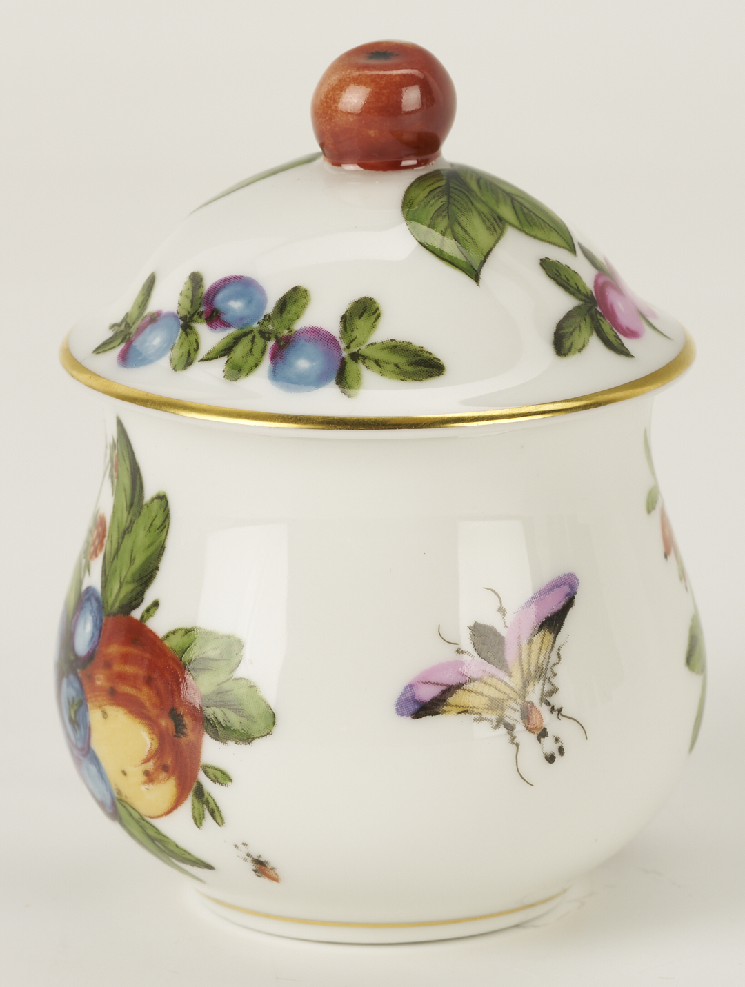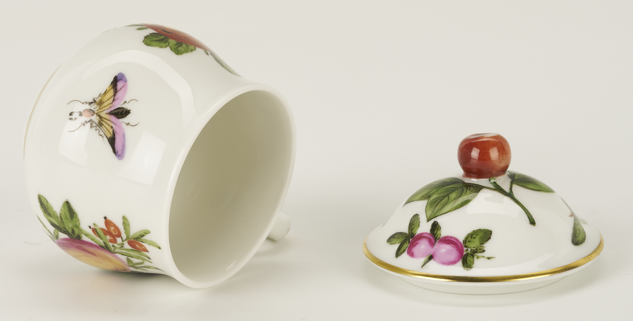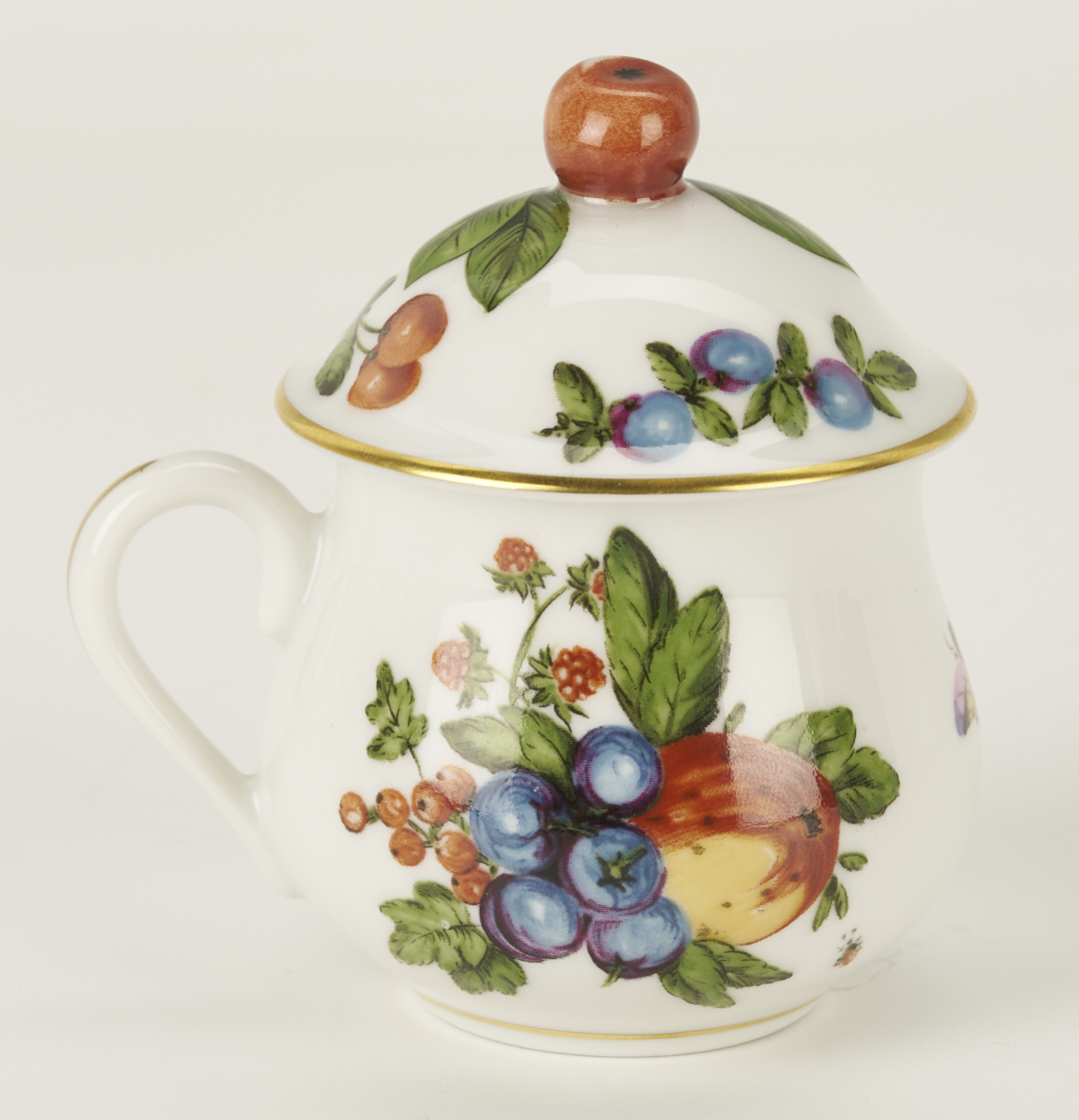 Grouping of seven (7) porcelain pots de creme from various makers. 1st – 2nd Items: Herend cups with covers, each hand-painted, one in rust-colored “Chinese Bouquet” pattern, marked with Herend stamp and 739/AOG, the other in their “Rothschild Bird” pattern with bird finial, marked 739/RO B94. 3rd – 4th Items: Pair of Limoges cups with covers, in bird and flowers motif, with gilt accents. Marked Limoges, France and with a “J” stamp in blue; 5th -6th Items: Pair of unmarked cups with covers, in a flower and garland design, each with gilt accents to handles and lids; 7th Item: Mottahedeh cup with cover in their Duke of Gloucester pattern, with fruit and insect motif, topped with a berry finial. Items range in size from 3 to 3 1/2 in H.