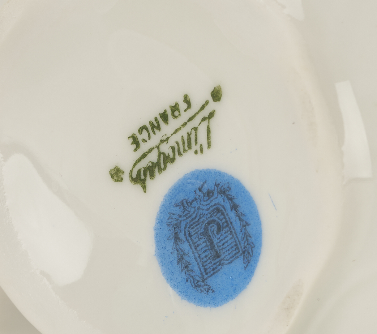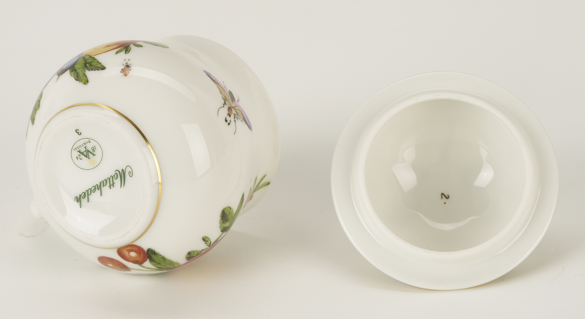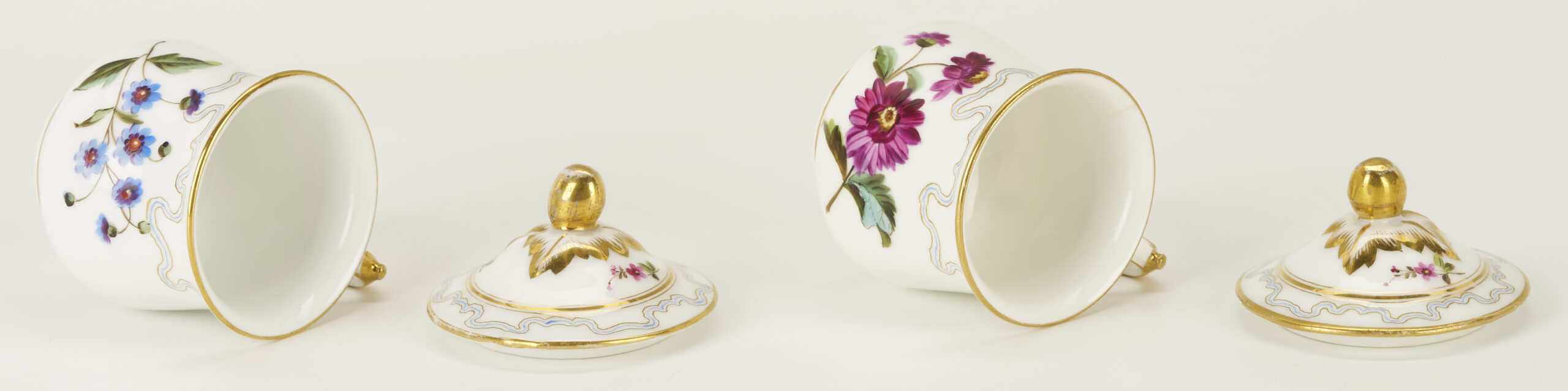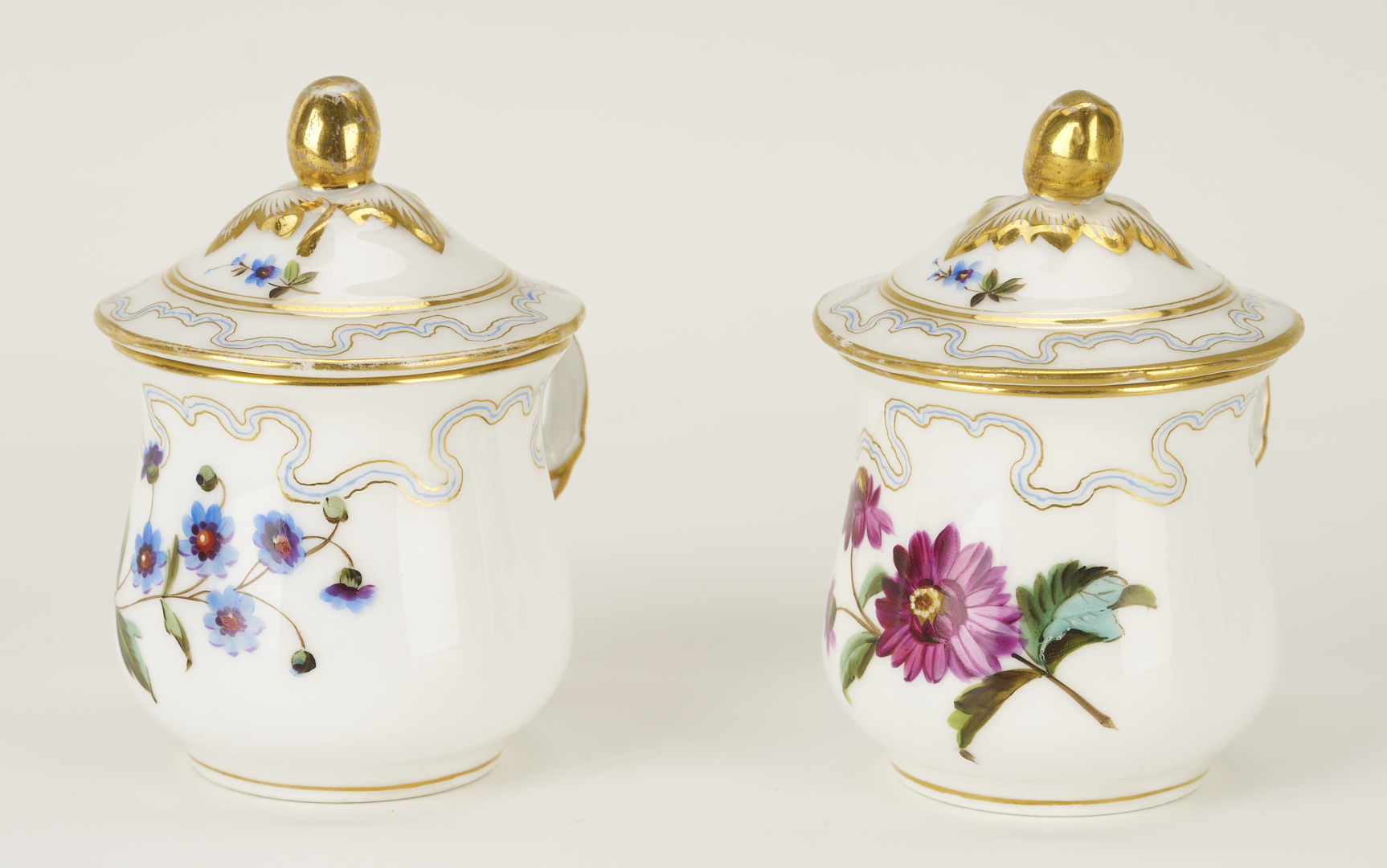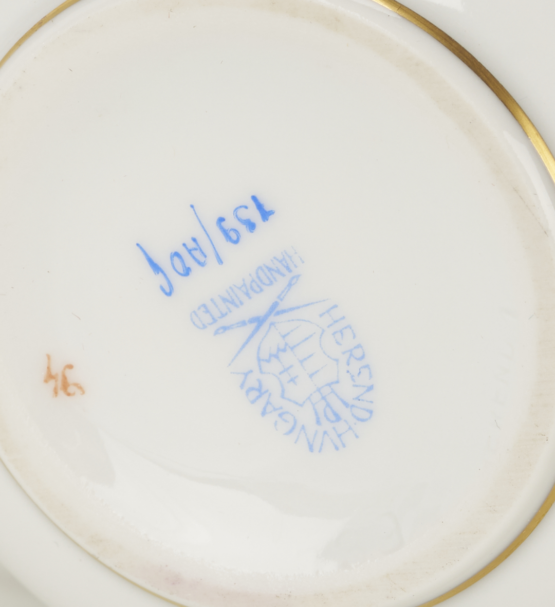 Grouping of seven (7) porcelain pots de creme from various makers. 1st – 2nd Items: Herend cups with covers, each hand-painted, one in rust-colored “Chinese Bouquet” pattern, marked with Herend stamp and 739/AOG, the other in their “Rothschild Bird” pattern with bird finial, marked 739/RO B94. 3rd – 4th Items: Pair of Limoges cups with covers, in bird and flowers motif, with gilt accents. Marked Limoges, France and with a “J” stamp in blue; 5th -6th Items: Pair of unmarked cups with covers, in a flower and garland design, each with gilt accents to handles and lids; 7th Item: Mottahedeh cup with cover in their Duke of Gloucester pattern, with fruit and insect motif, topped with a berry finial. Items range in size from 3 to 3 1/2 in H.