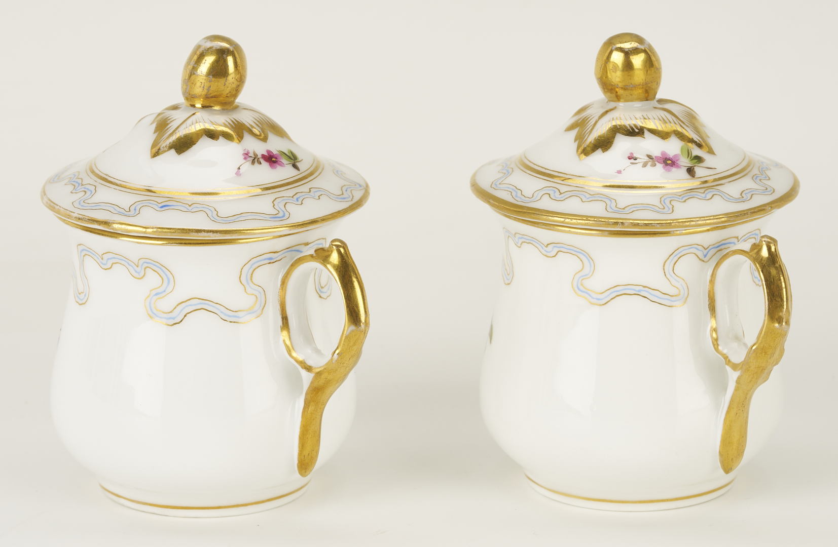 Each in excellent condition with slight gilt loss, one unmarked cup with 1/4″ crack to rim.