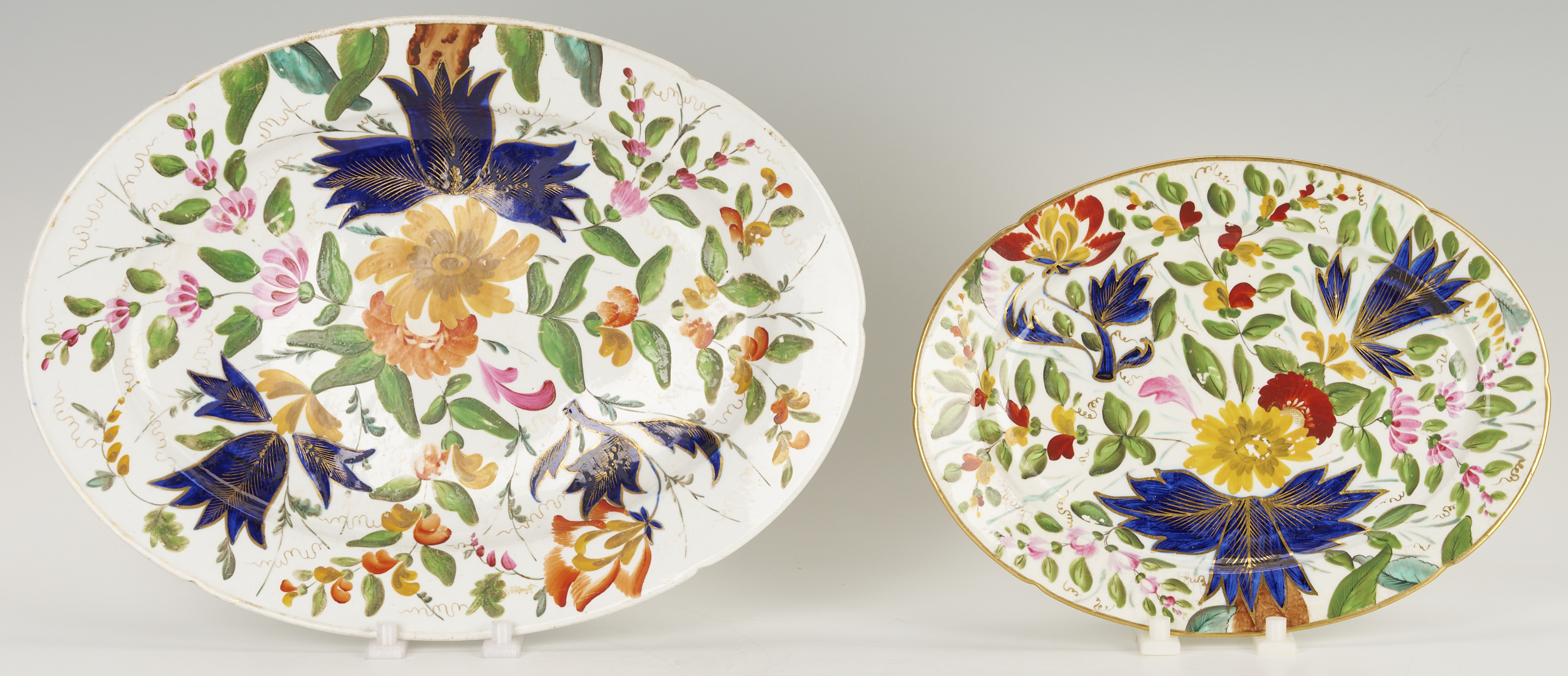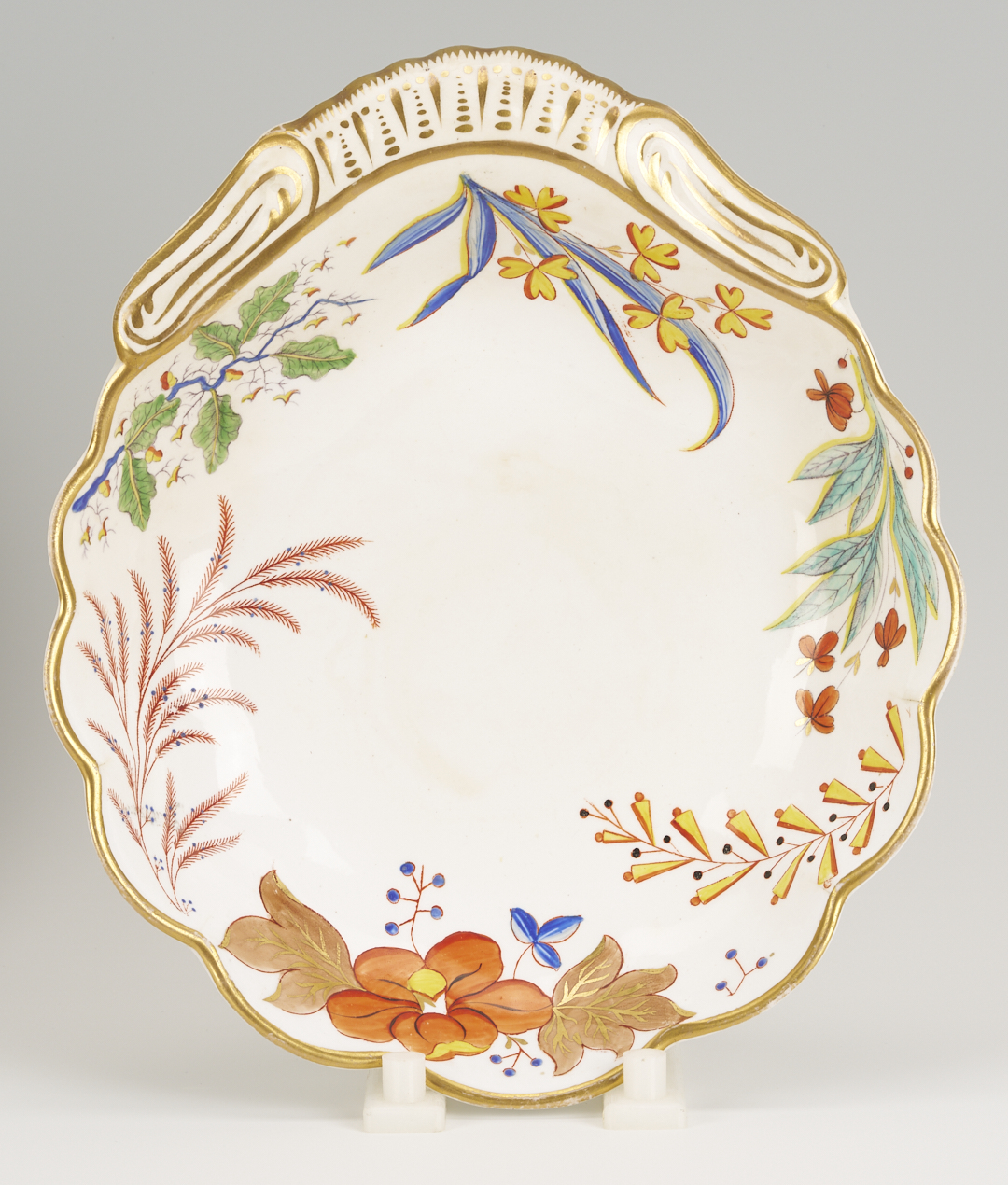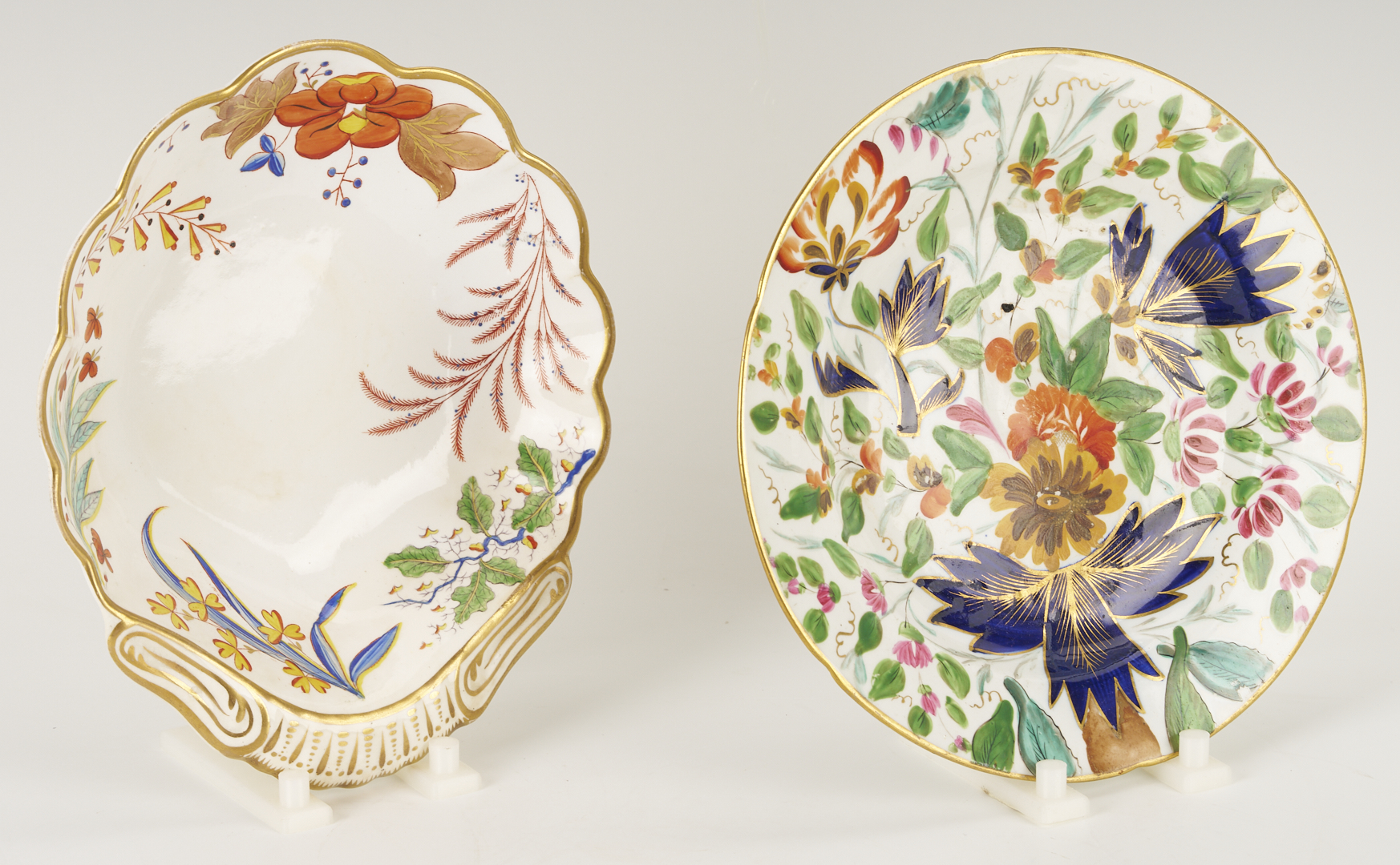 Five (5) English porcelain items, including 2 Coalport platters and 1 Coalport plate having shaped rims and polychrome with gilt floral decoration; 1 relief molded pitcher with leaf and berry decoration and silver lustre rim, possibly Spode; and a Spode shell form porcelain dish decorated in the Japanese Imari style. Ranging in size from 1 1/4 in. H x 9 1/2 in. dia. to 1 3/4 in. H x 16 3/8 in. W. All pieces early 19th-century.