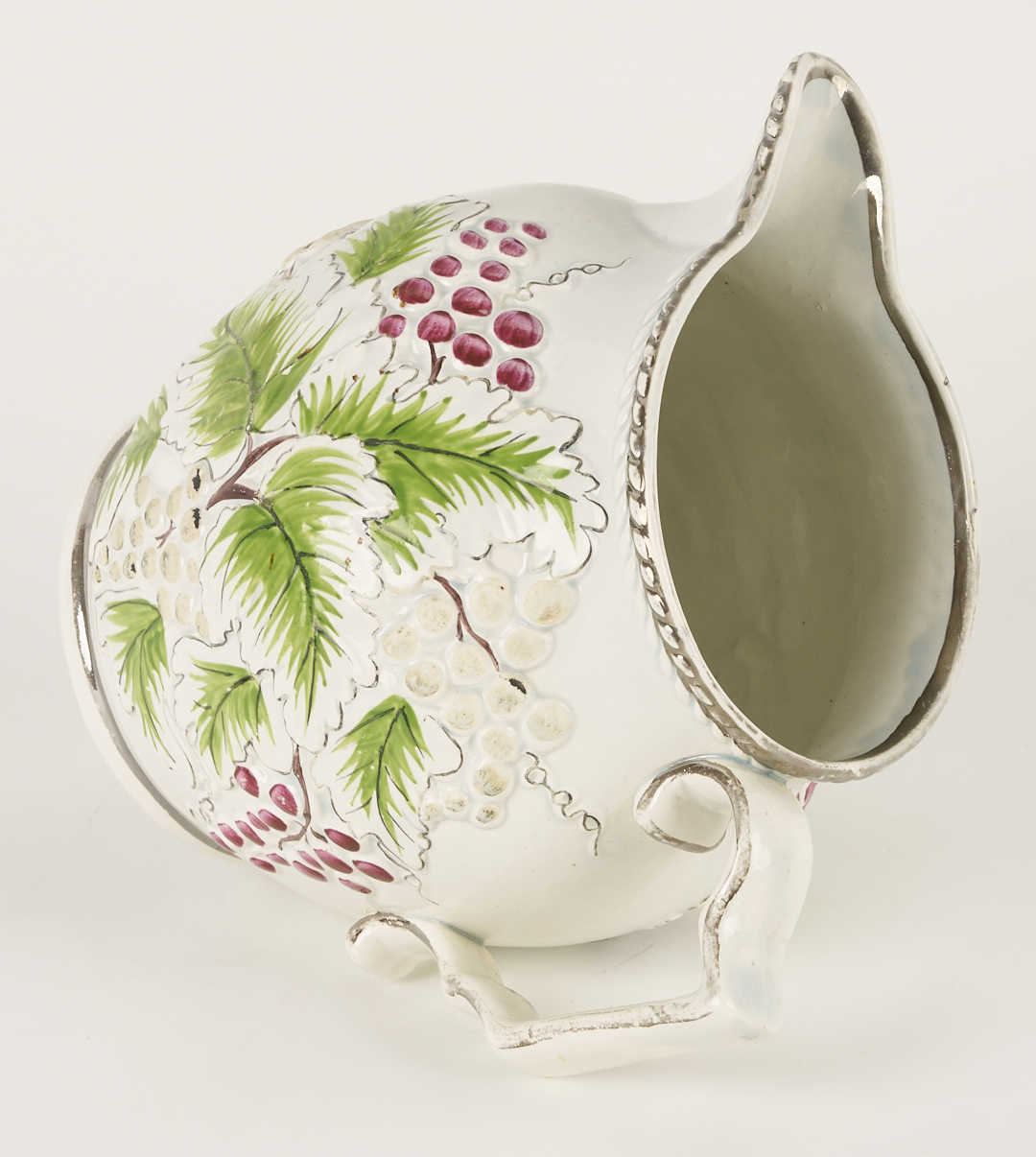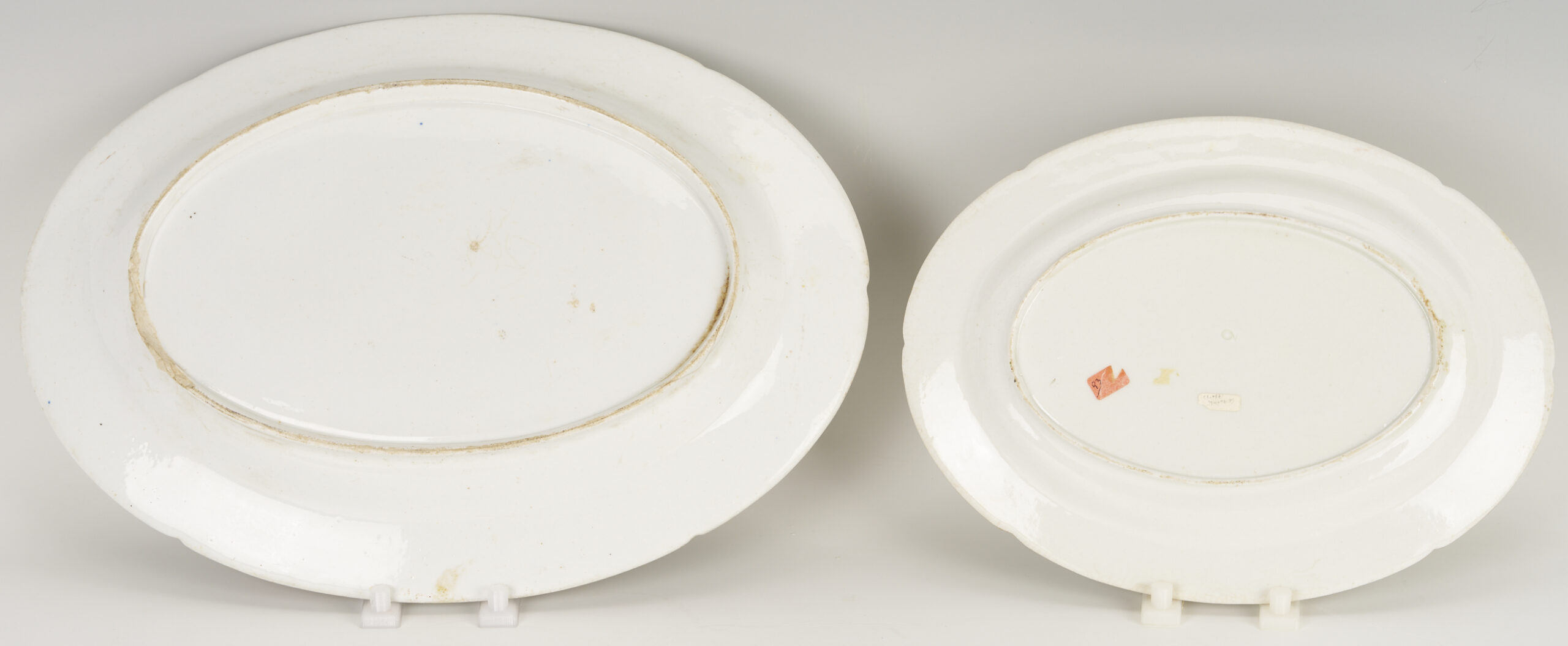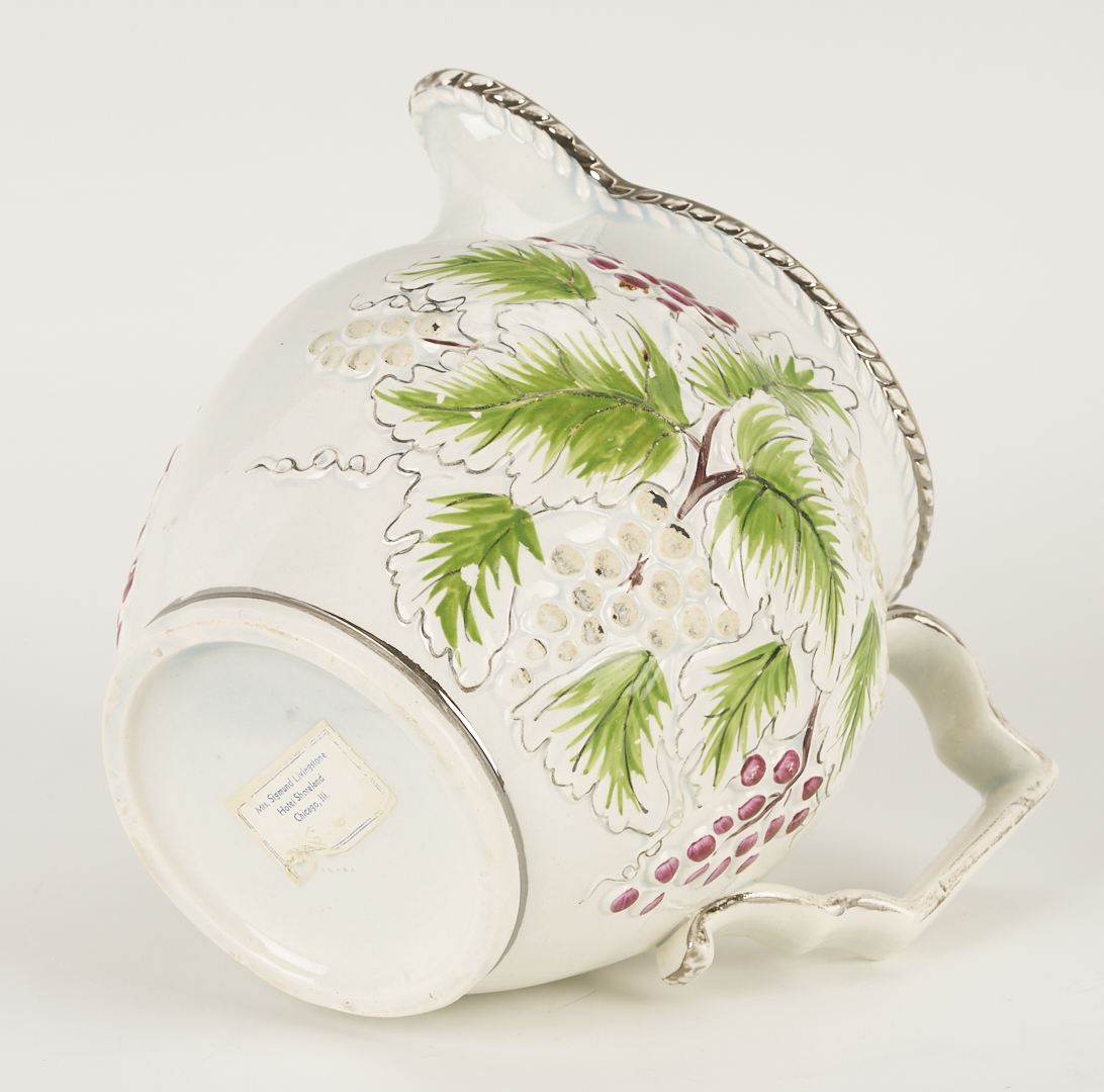 Large platter and pitcher with scattered wear to polychrome decoration. Smaller platter with one area of wear to polycrome. Shell dish with some staining. Plate in very good condition.
