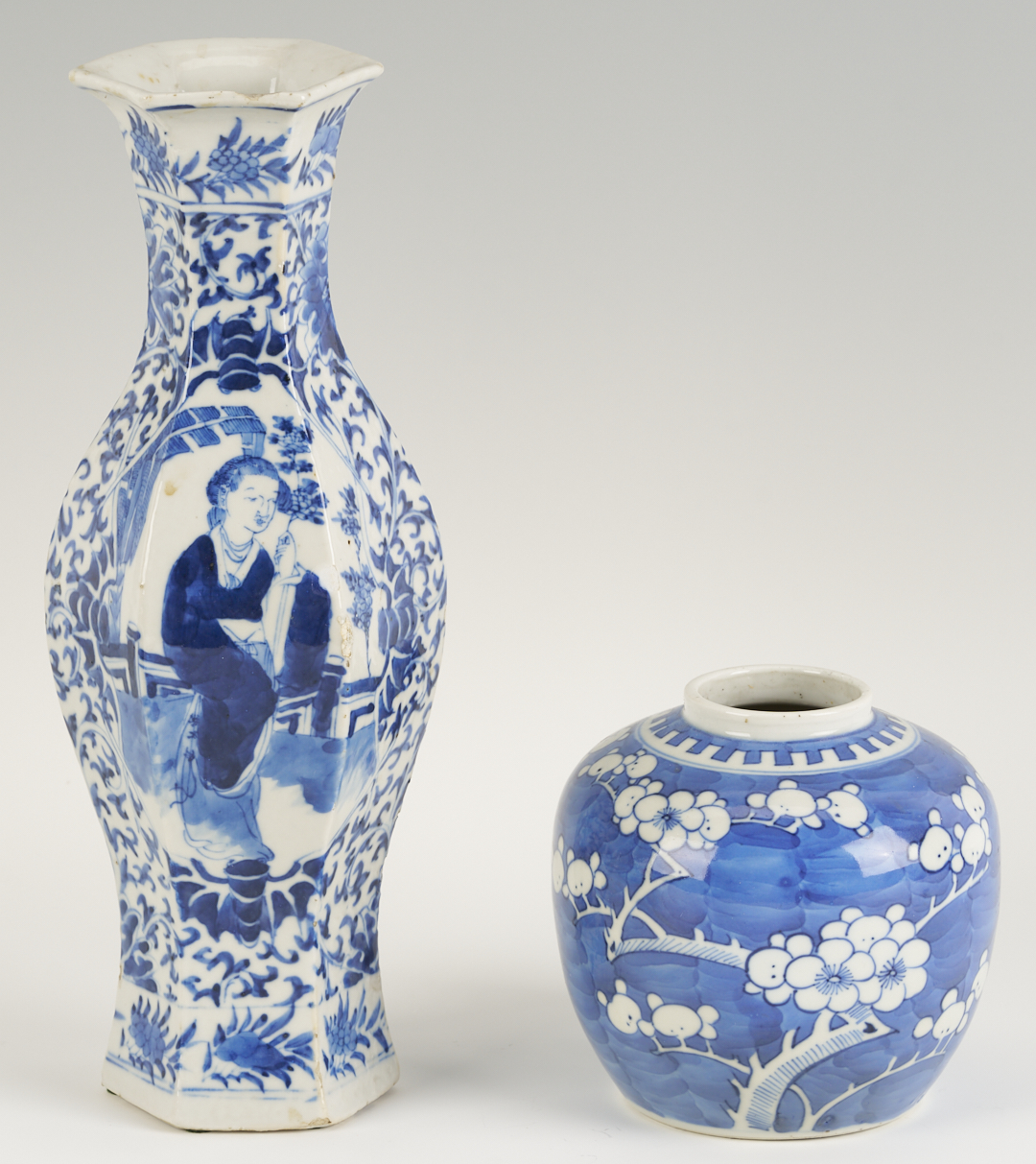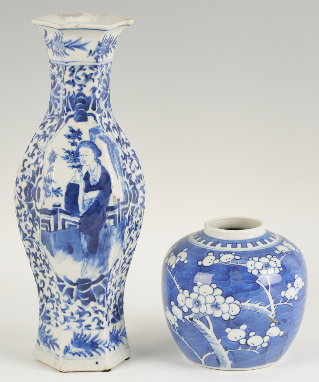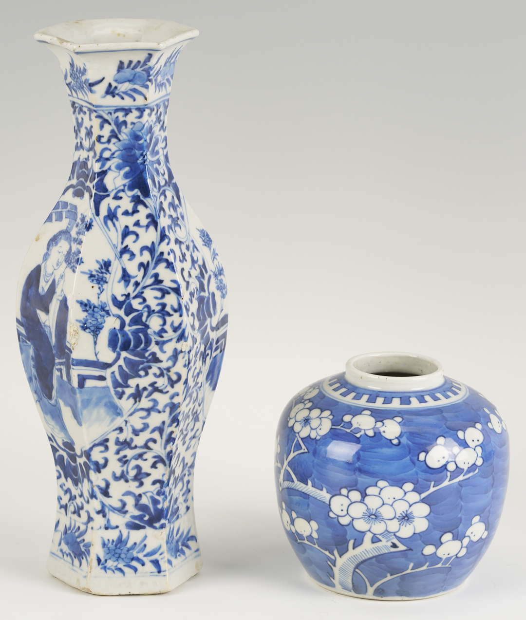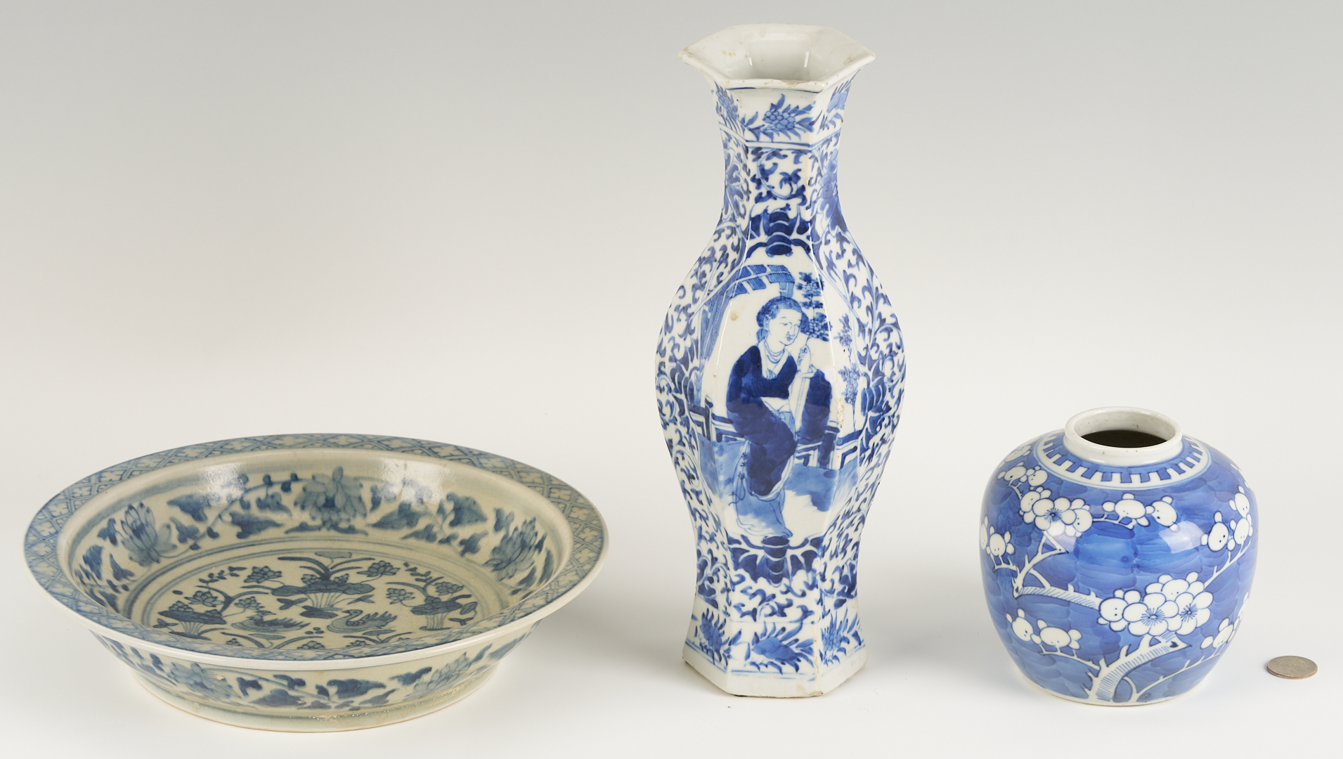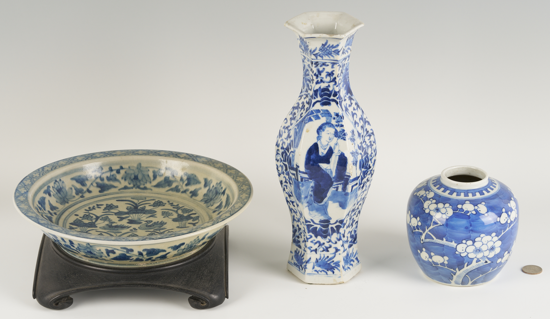 Three (3) Chinese blue and white porcelain items, including a Hawthorne ginger jar, a low bowl with foliate and duck decoration, and a hexagonal vase with figural vignettes on each side. Bowl fitted with a hardwood stand. All with blue character marks to the base. 5 in. H x 5 1/4 in. W x 2 1/2 in. H x 11 in. dia. & 12 1/4 in. H. Late 19th/Early 20th century.