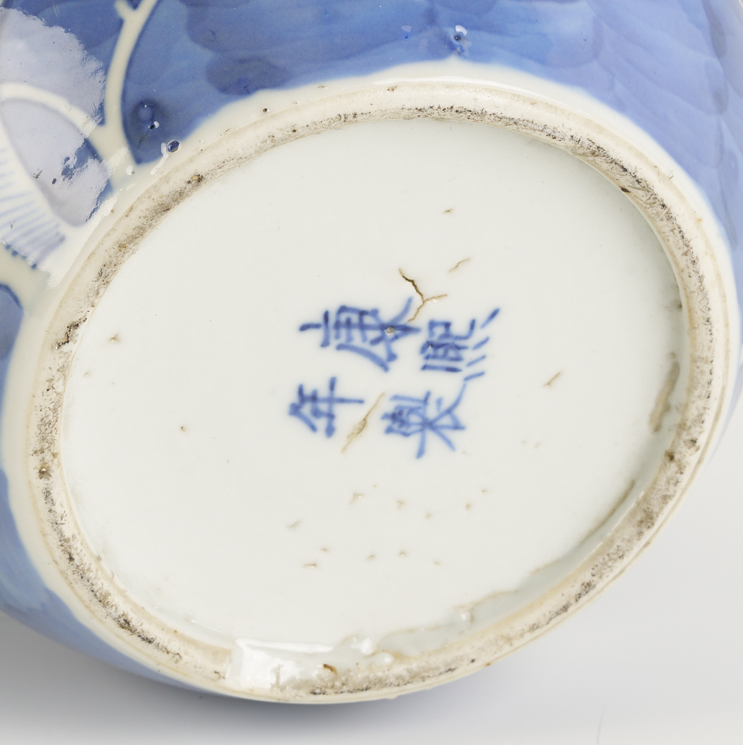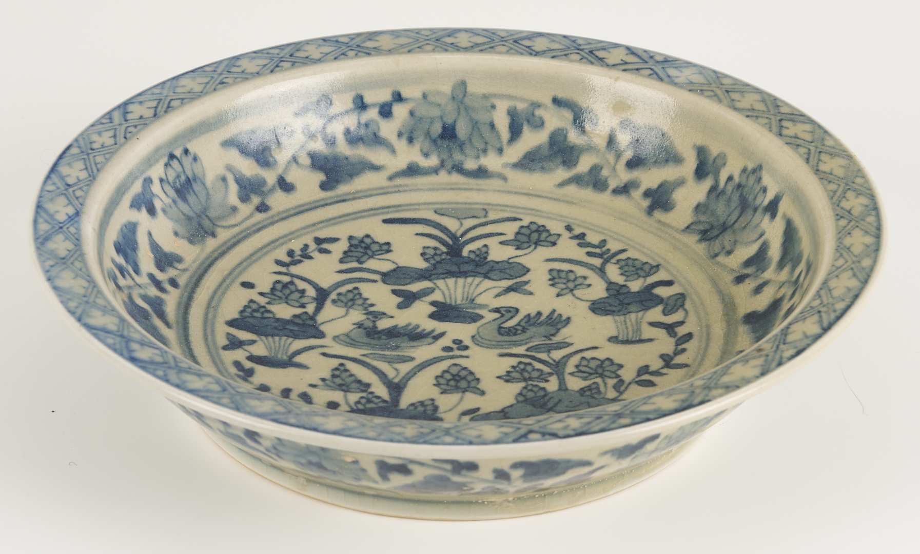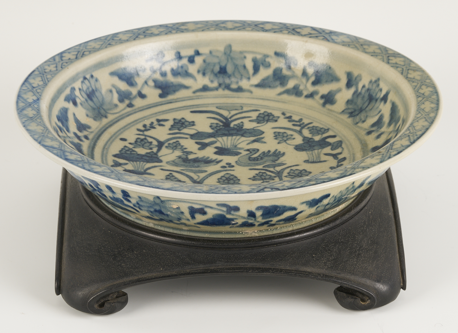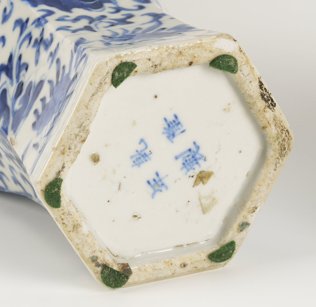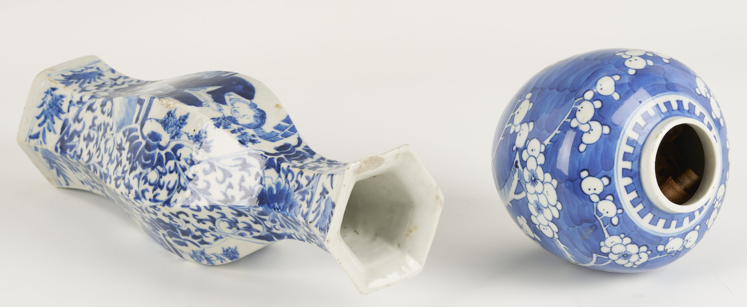 Three (3) Chinese blue and white porcelain items, including a Hawthorne ginger jar, a low bowl with foliate and duck decoration, and a hexagonal vase with figural vignettes on each side. Bowl fitted with a hardwood stand. All with blue character marks to the base. 5 in. H x 5 1/4 in. W x 2 1/2 in. H x 11 in. dia. & 12 1/4 in. H. Late 19th/Early 20th century.