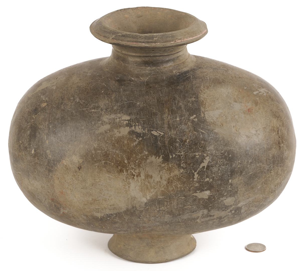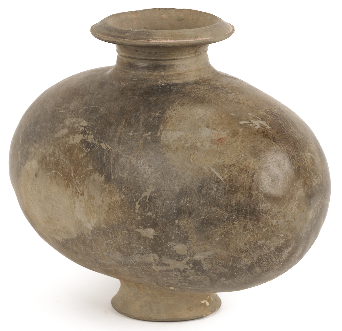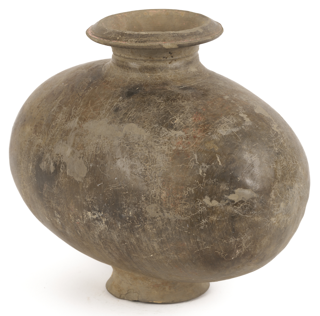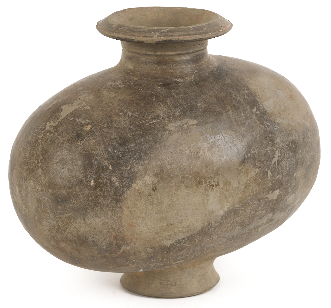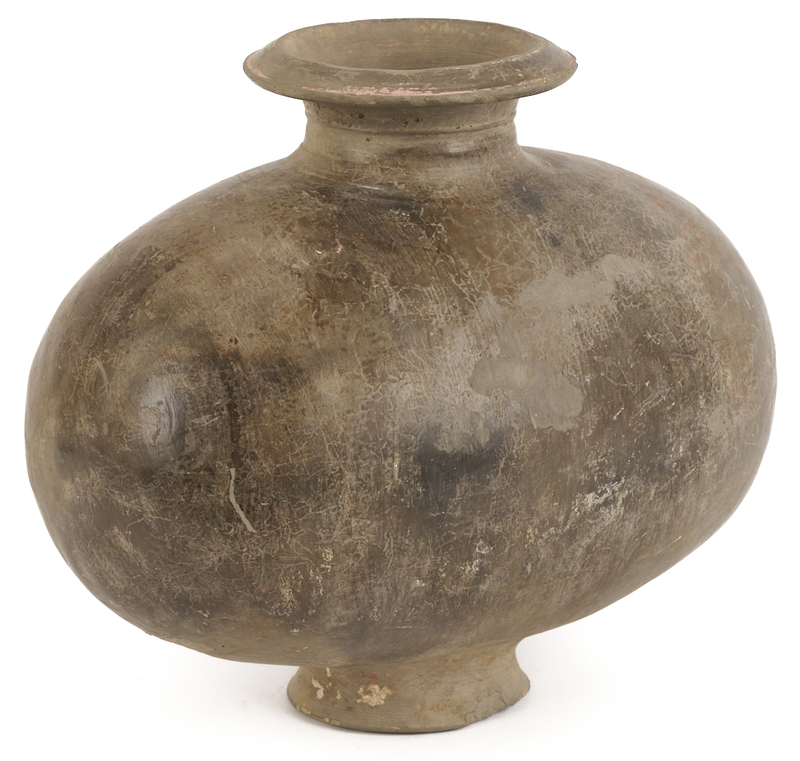Chinese Archaic Han Dynasty (206 BC – 220 AD) gray ceramic cocoon form offering jar, rounded oblong body, banded circular neck and everted rim, all on a short pedestal foot. 11 1/2 in. H x 13 1/2 in. W x 6 1/2 in. D.