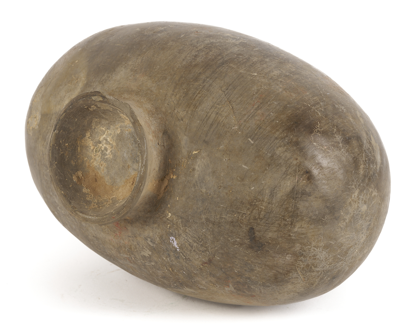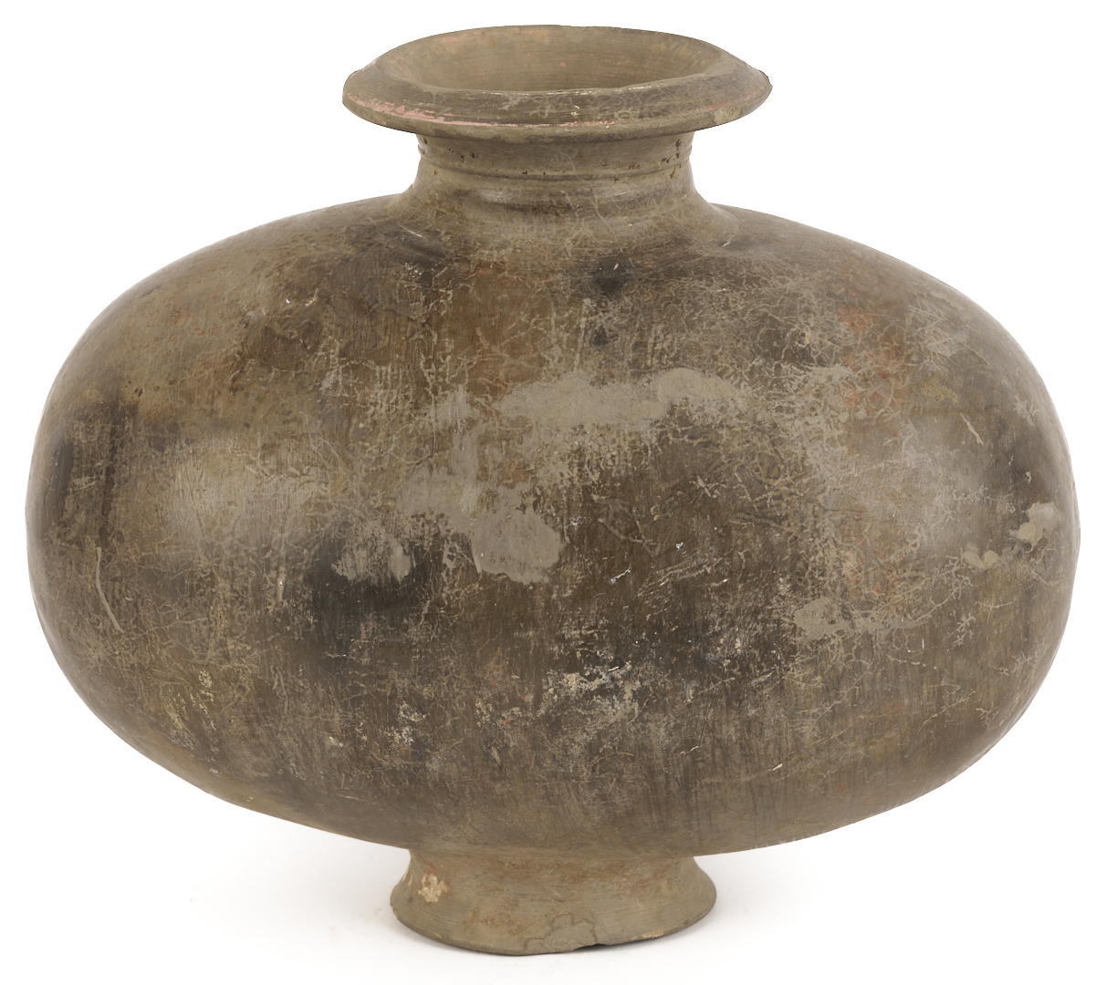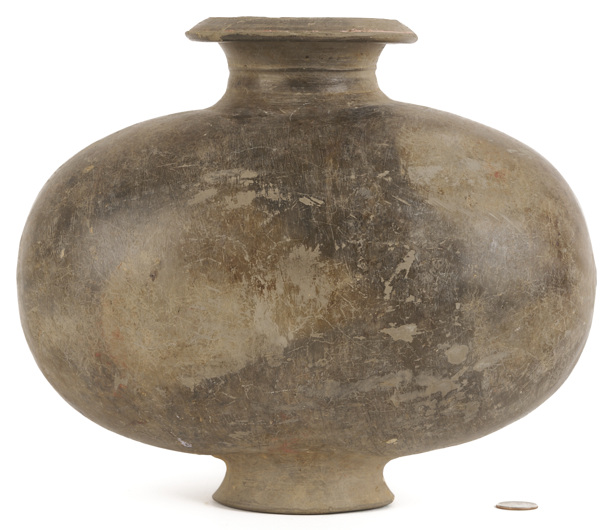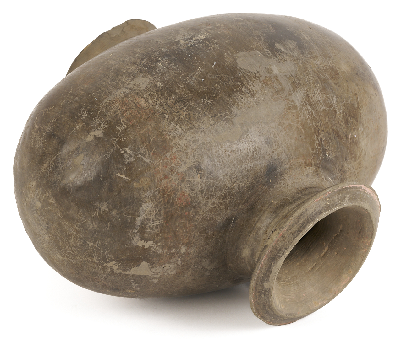 Chinese Archaic Han Dynasty (206 BC – 220 AD) gray ceramic cocoon form offering jar, rounded oblong body, banded circular neck and everted rim, all on a short pedestal foot. 11 1/2 in. H x 13 1/2 in. W x 6 1/2 in. D.