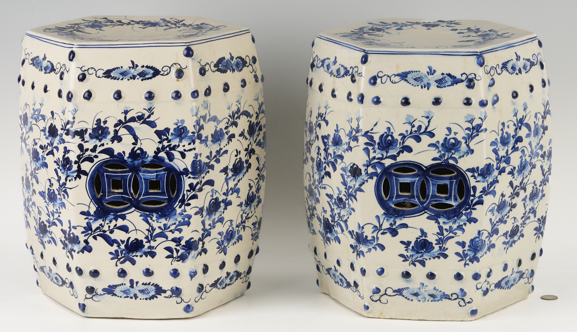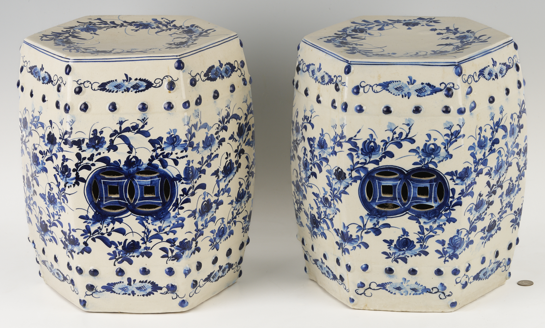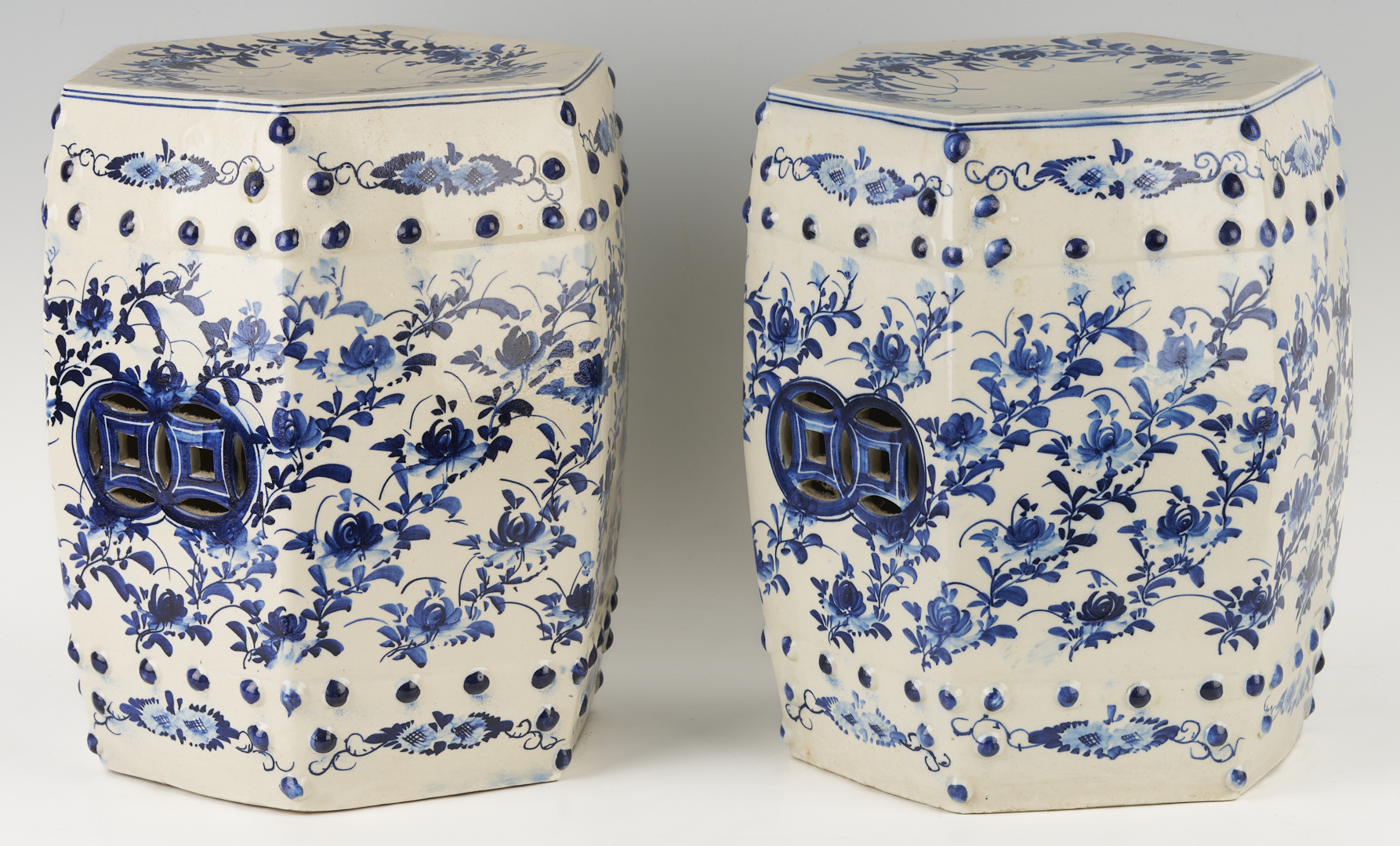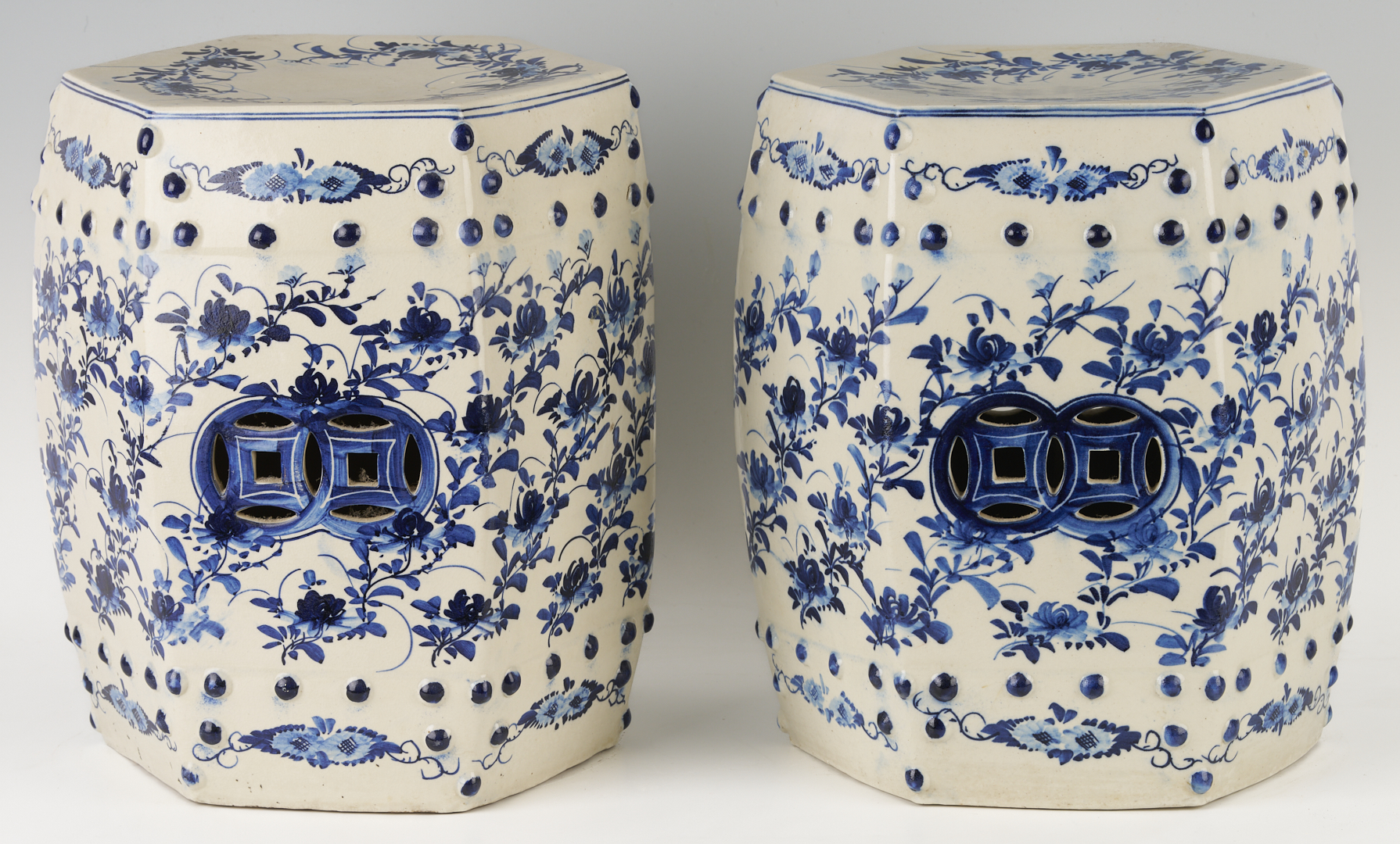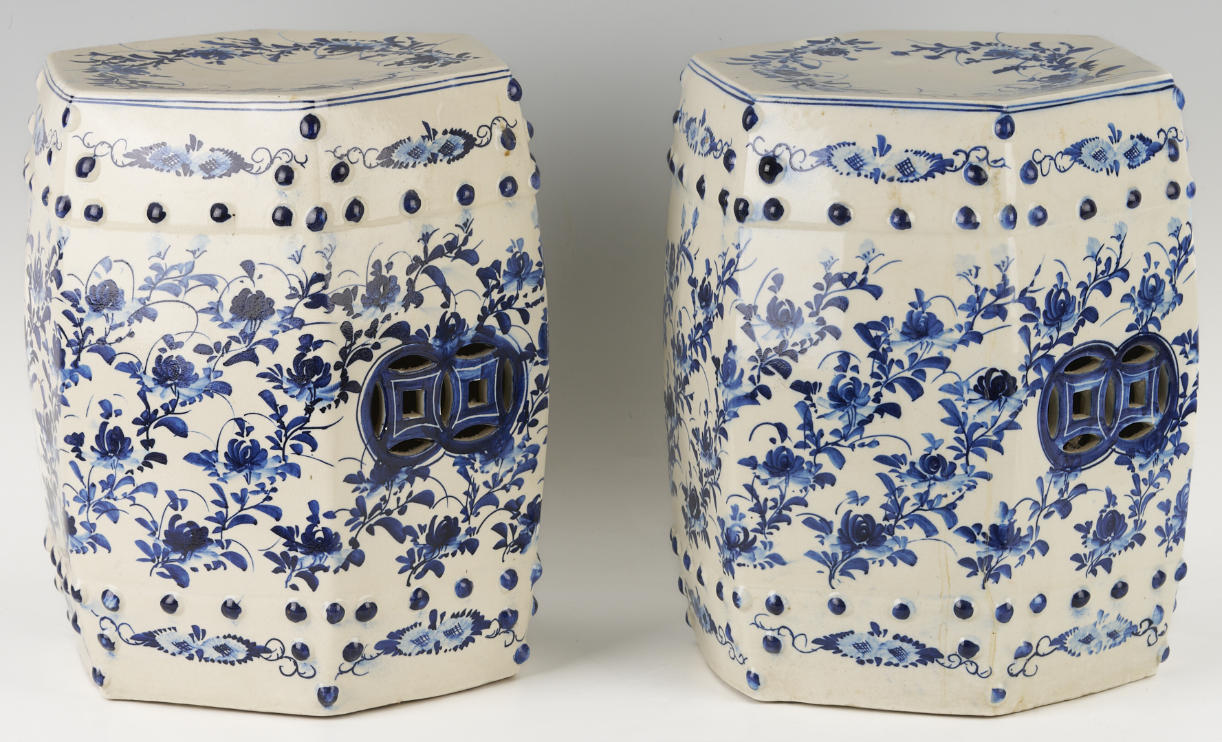 Pair of Southeast Asian blue and white ceramic garden stools, octagonal form, each with pierced double ring design to two sides and ivory crackle glaze with floral decoration. Unsigned. 15 1/2 in. H x 12 in. x 12 in. Thailand, 20th Century.