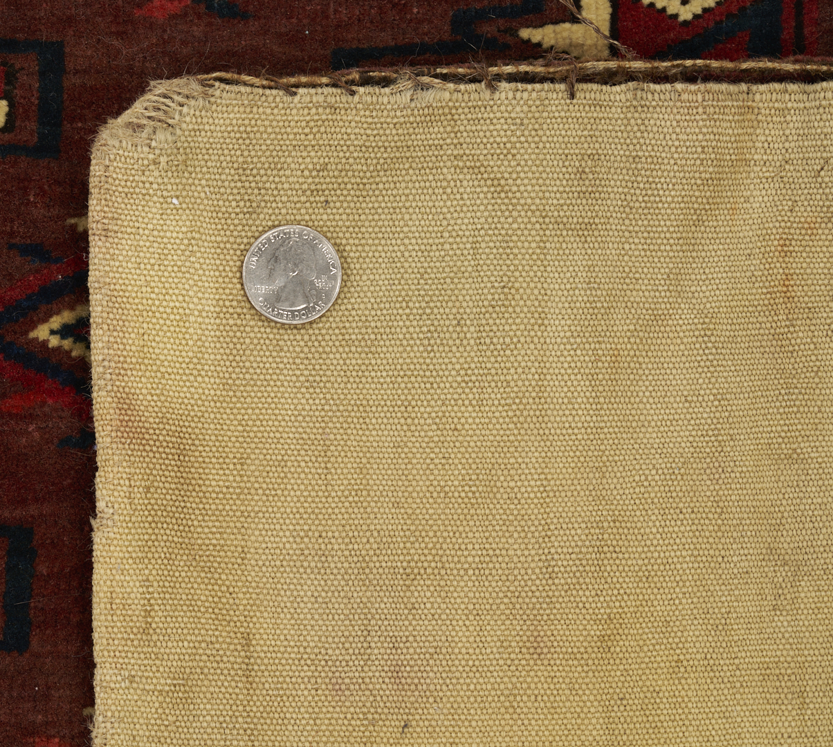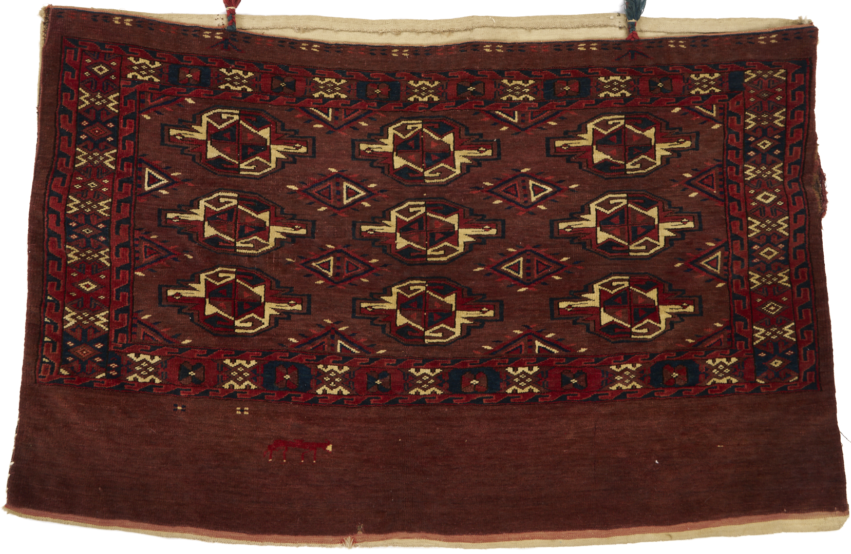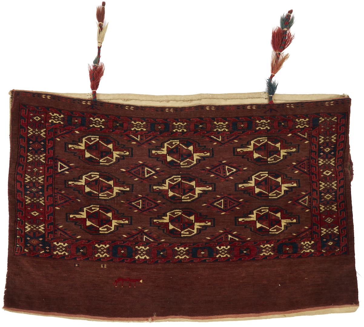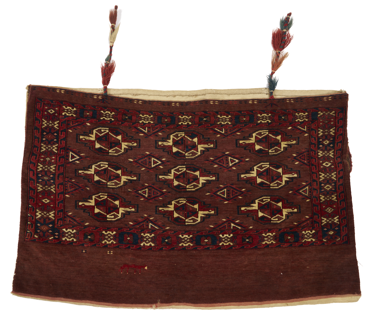 1st item: Antique Turkmen Yomud (full bag) Torba having a central panel featuring three rows of three guls within a wide foliate border. Woven in colors of red, blue, and cream. 3 ft. 10 in. x 2 ft. 5 in. Circa 1880-1890. 2nd item: Antique Turkmen Arabatchi Chuval bag featuring three rows of three guls within a large foliate border and plain lower elem panel. 5 ft. 3 in. x 3 ft. 4 in. Circa 1870.