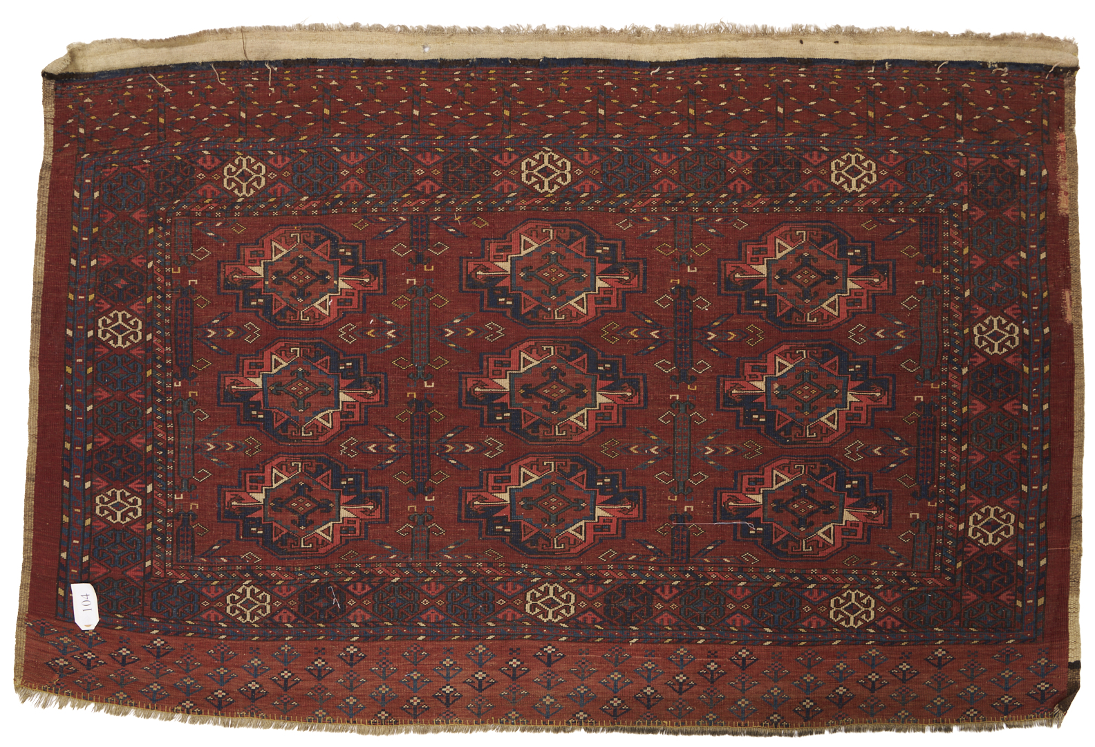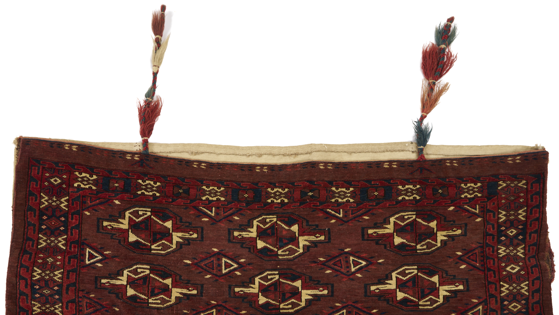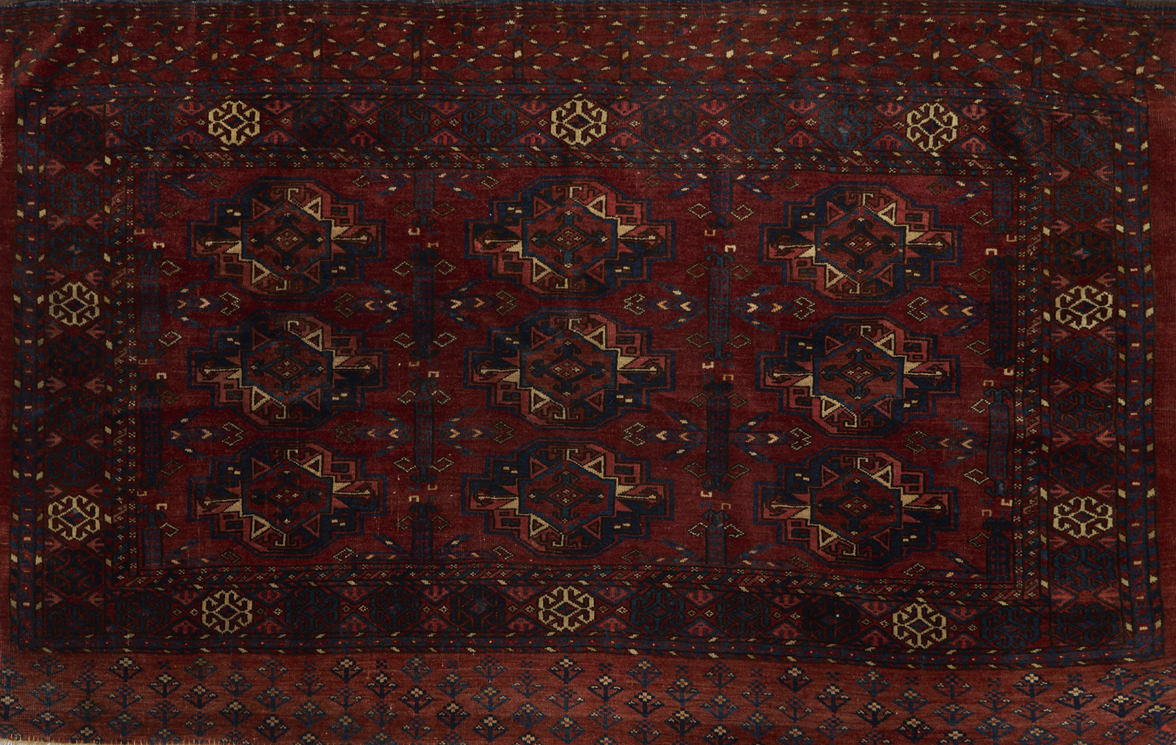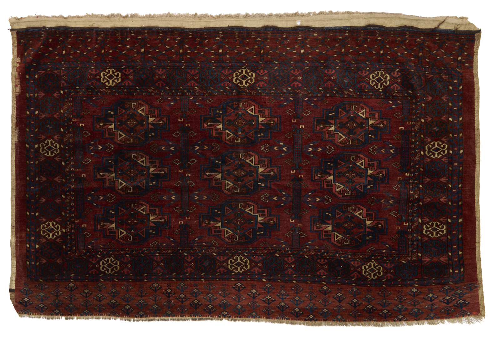 1st item: Antique Turkmen Yomud (full bag) Torba having a central panel featuring three rows of three guls within a wide foliate border. Woven in colors of red, blue, and cream. 3 ft. 10 in. x 2 ft. 5 in. Circa 1880-1890. 2nd item: Antique Turkmen Arabatchi Chuval bag featuring three rows of three guls within a large foliate border and plain lower elem panel. 5 ft. 3 in. x 3 ft. 4 in. Circa 1870.