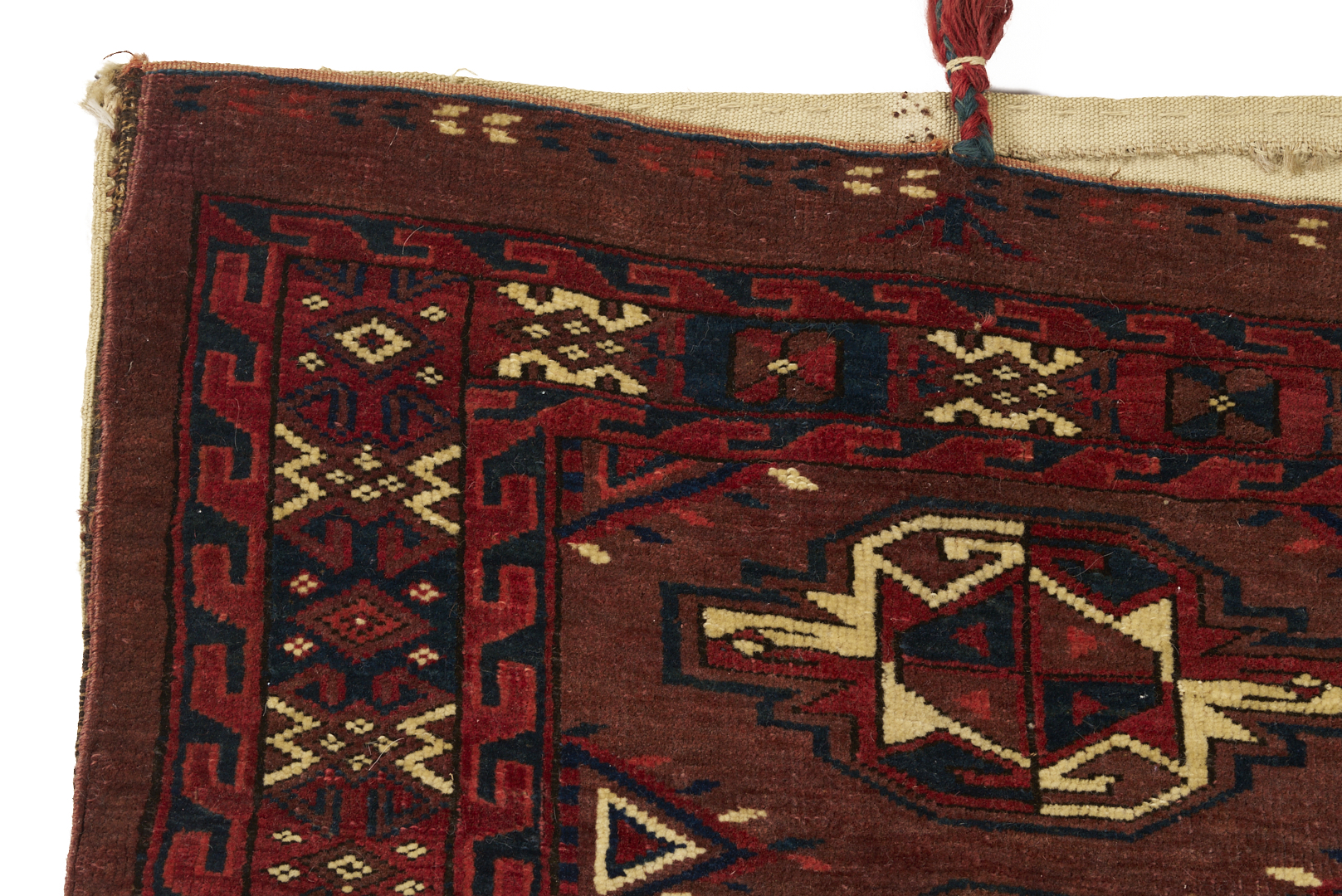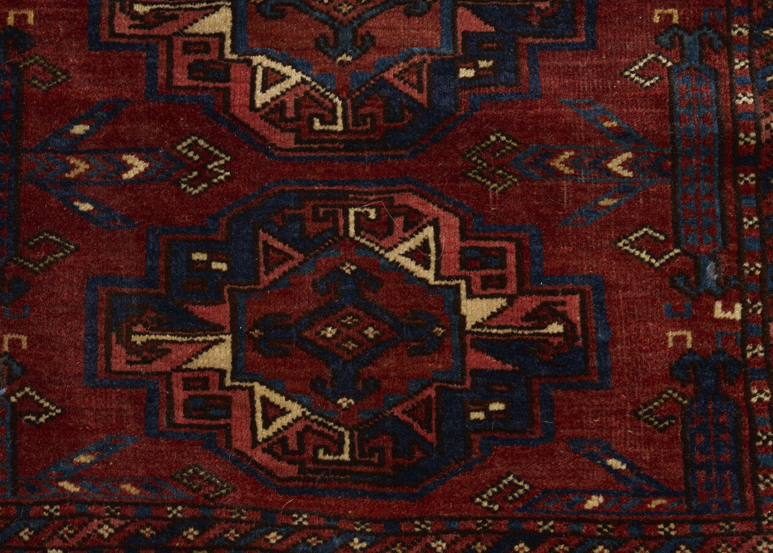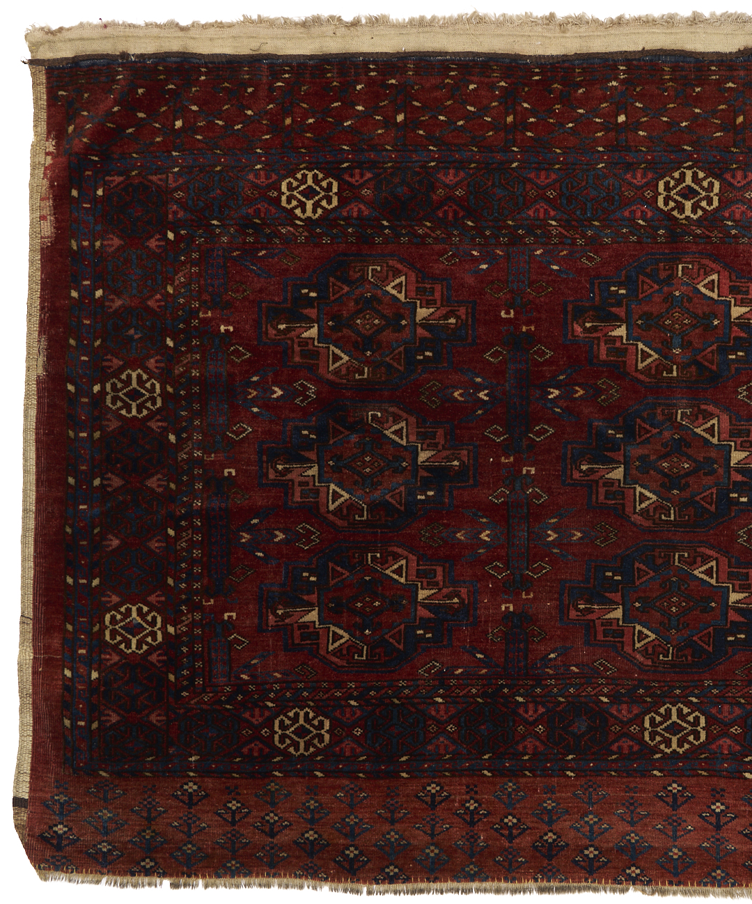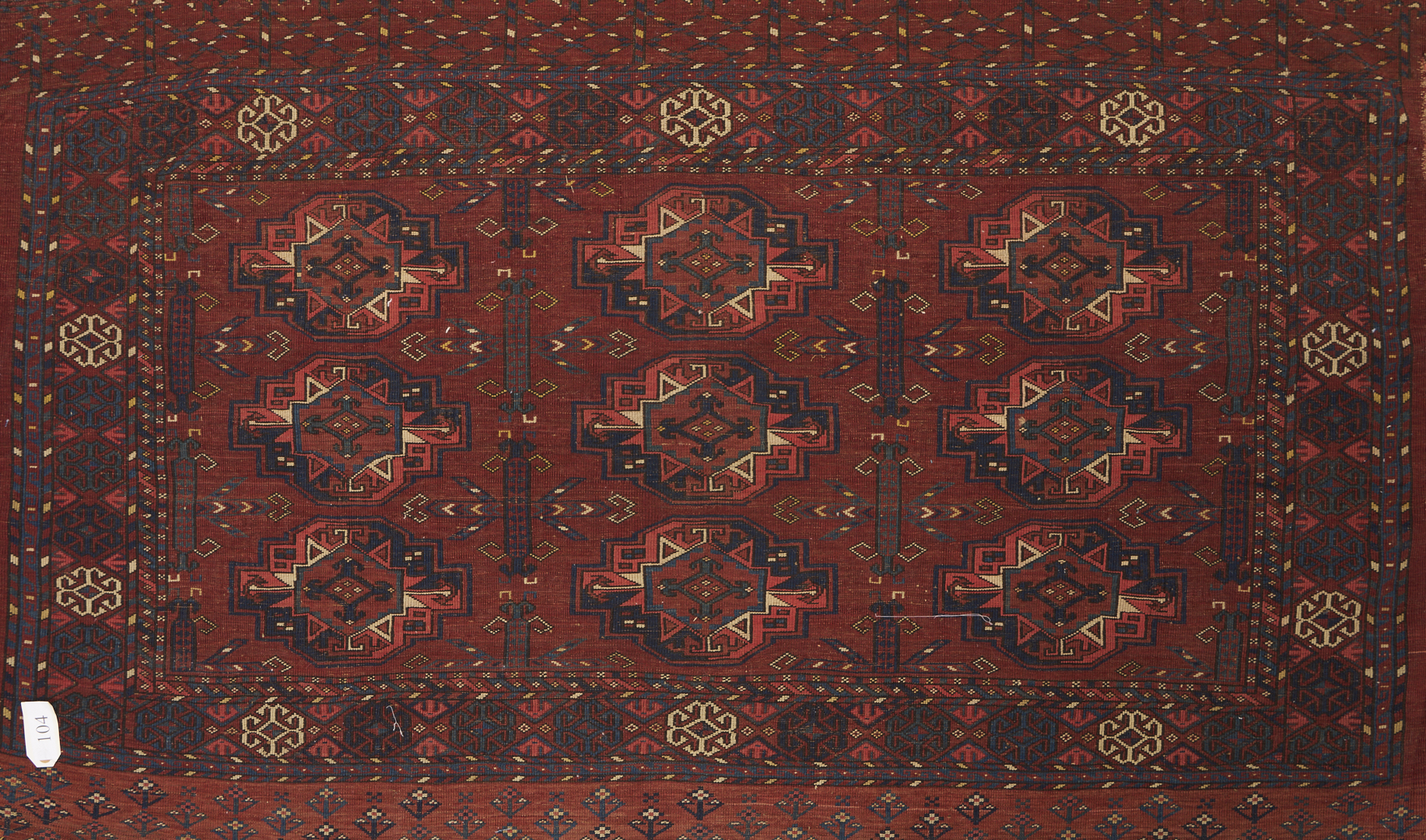 1st item: Antique Turkmen Yomud (full bag) Torba having a central panel featuring three rows of three guls within a wide foliate border. Woven in colors of red, blue, and cream. 3 ft. 10 in. x 2 ft. 5 in. Circa 1880-1890. 2nd item: Antique Turkmen Arabatchi Chuval bag featuring three rows of three guls within a large foliate border and plain lower elem panel. 5 ft. 3 in. x 3 ft. 4 in. Circa 1870.