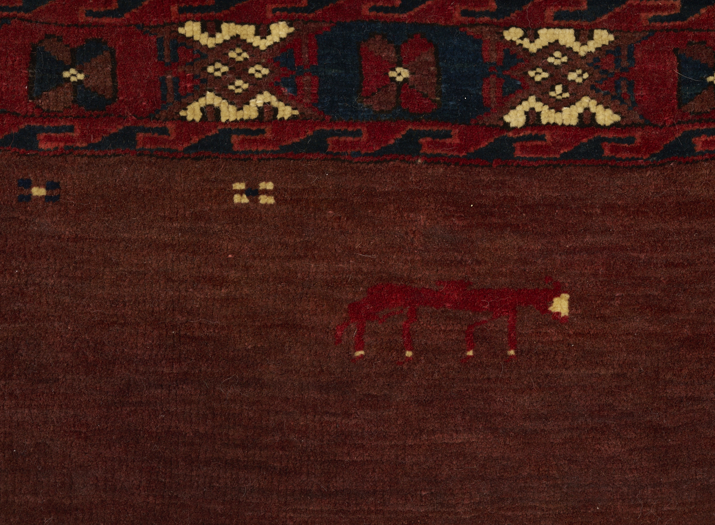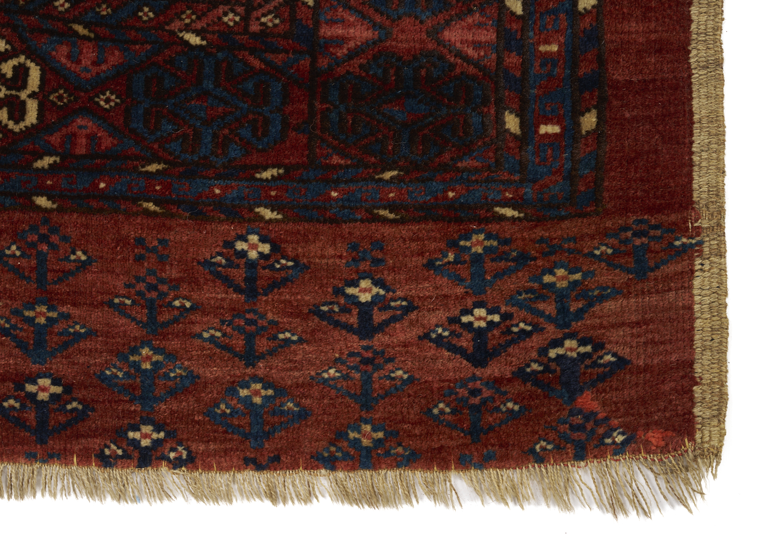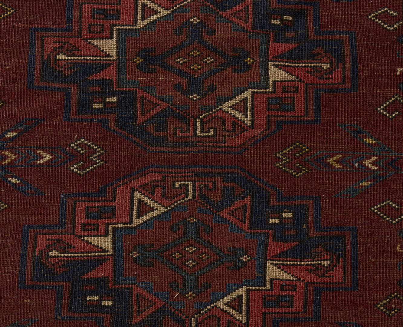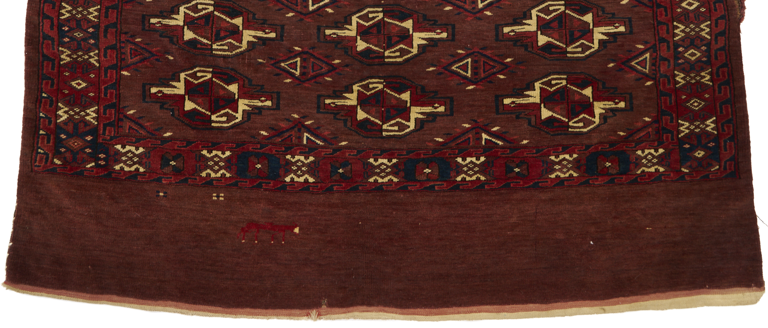 1st item: Antique Turkmen Yomud (full bag) Torba having a central panel featuring three rows of three guls within a wide foliate border. Woven in colors of red, blue, and cream. 3 ft. 10 in. x 2 ft. 5 in. Circa 1880-1890. 2nd item: Antique Turkmen Arabatchi Chuval bag featuring three rows of three guls within a large foliate border and plain lower elem panel. 5 ft. 3 in. x 3 ft. 4 in. Circa 1870.