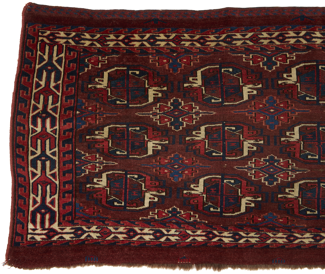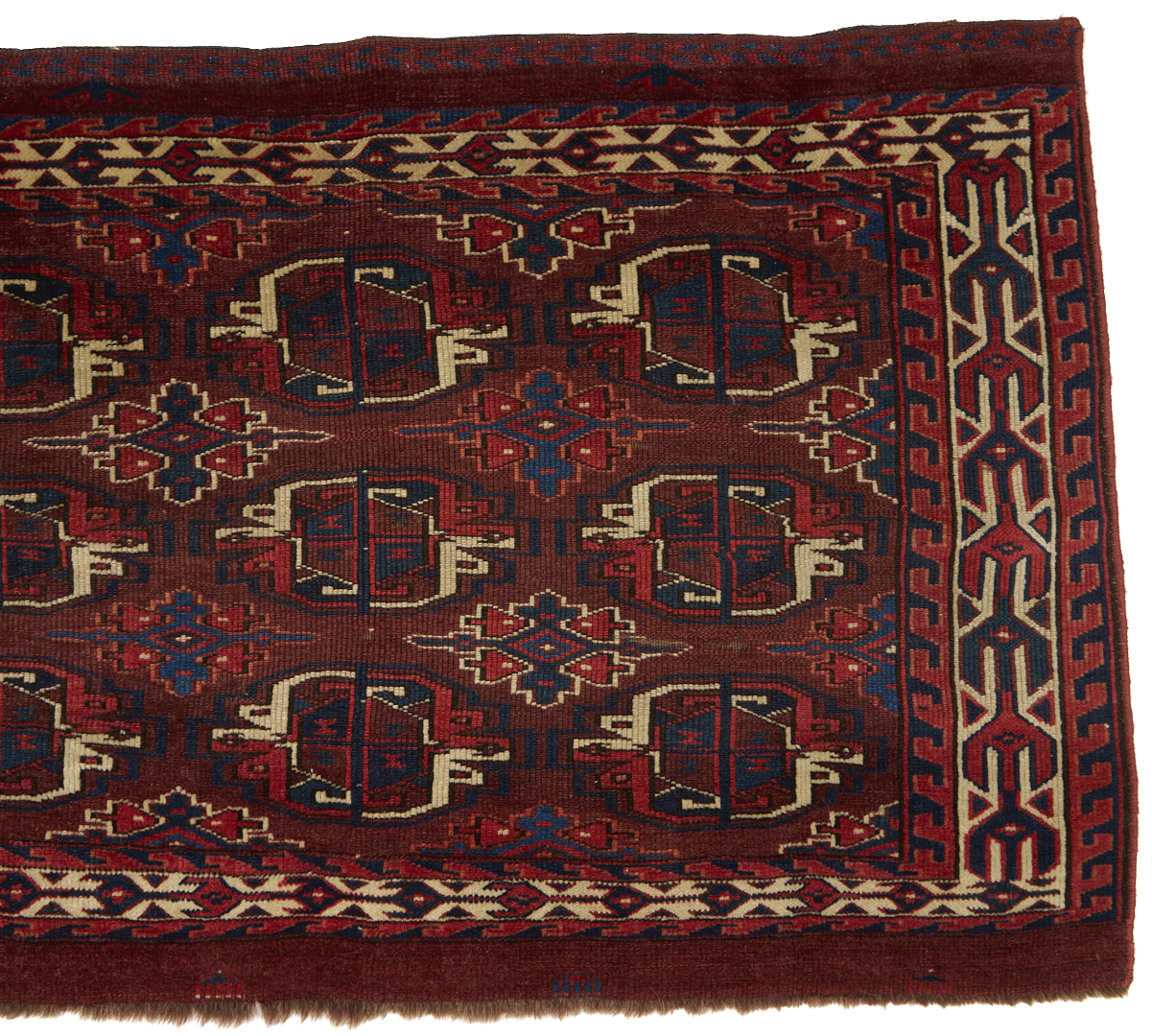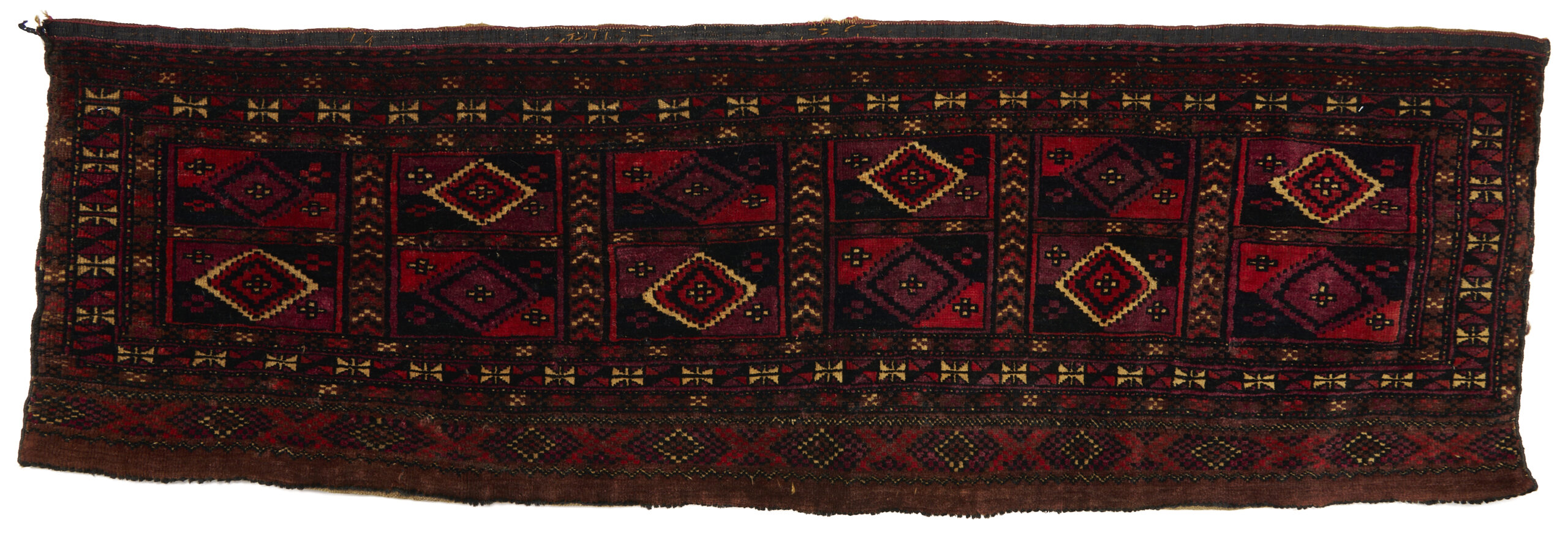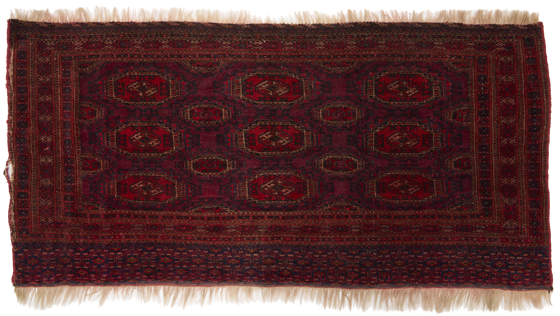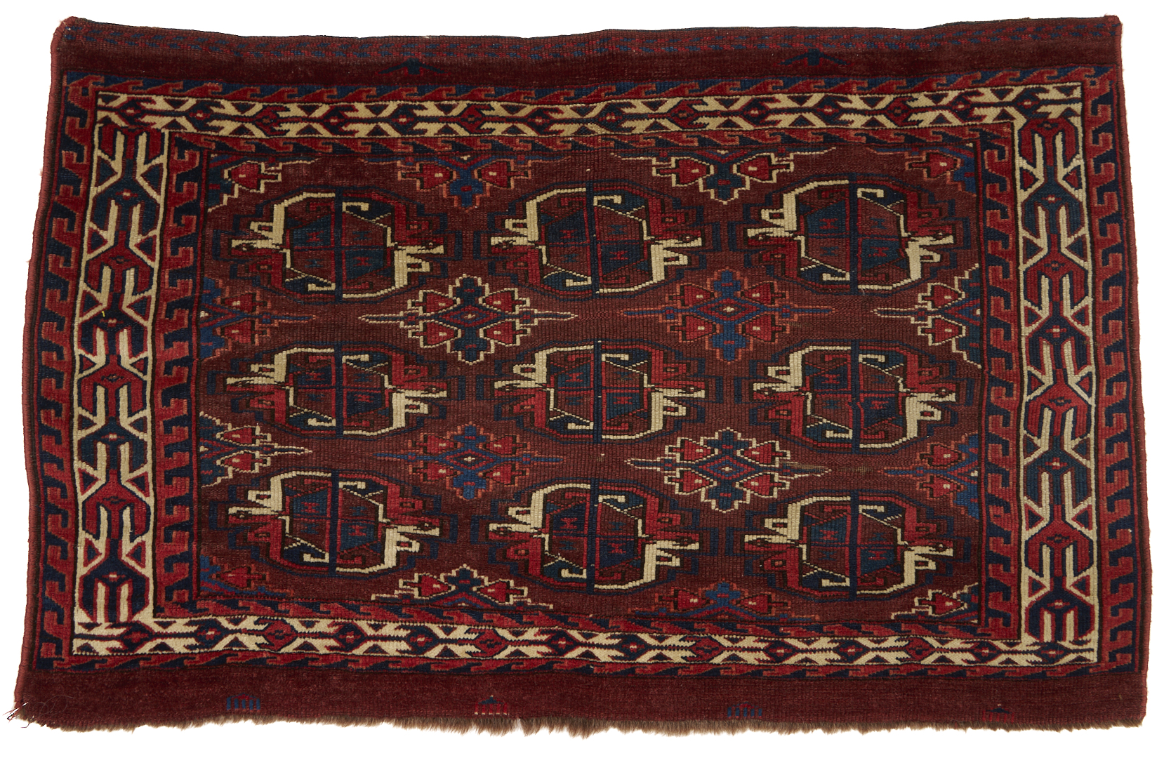 Three (3) Antique Turkmen weavings, all woven in colors of red, blue, and cream. 1st item: Antique Tekke Turkmen Chuval, wool on wool, retains some original fringe. Central dark red field with three rows of three guls and a wide lower geometric ensi border. 5 ft 2 in x 2 ft 7 in. Circa 1880s. 2nd item: Antique Yomud or Yomut Turkmen Chuval rug, central brick red field with three rows of three guls within three primary borders. 3 ft 7 in x 2 ft 3 in. Circa 1890s. 3rd item: Antique Tekke Turkmen weaving with two central rows of stylized diamond designs within three primary borders. 3 ft 11 in x 1 ft 3 in. Circa 1880s.