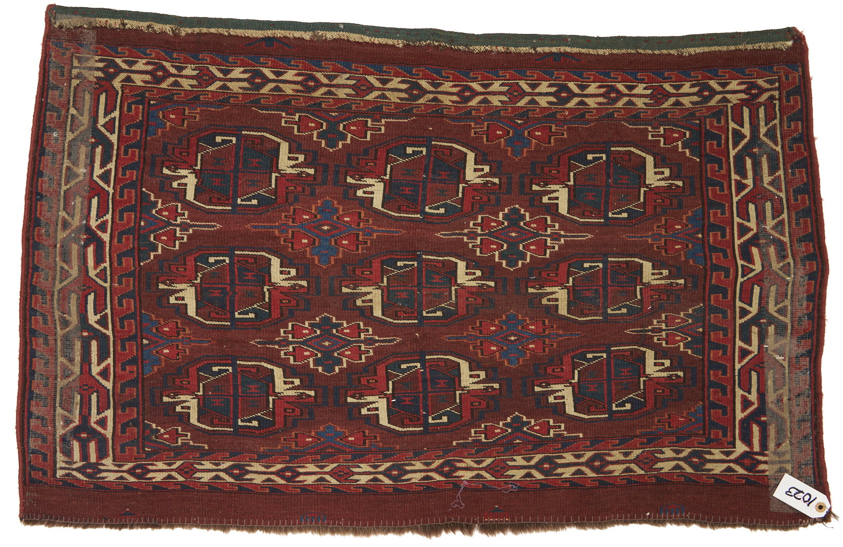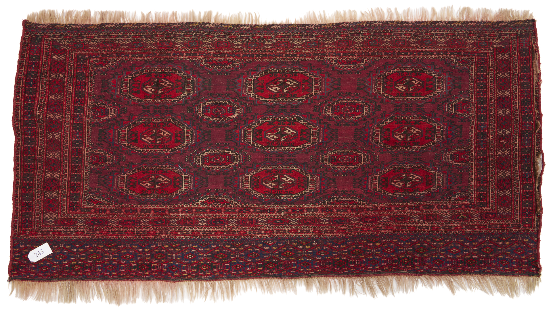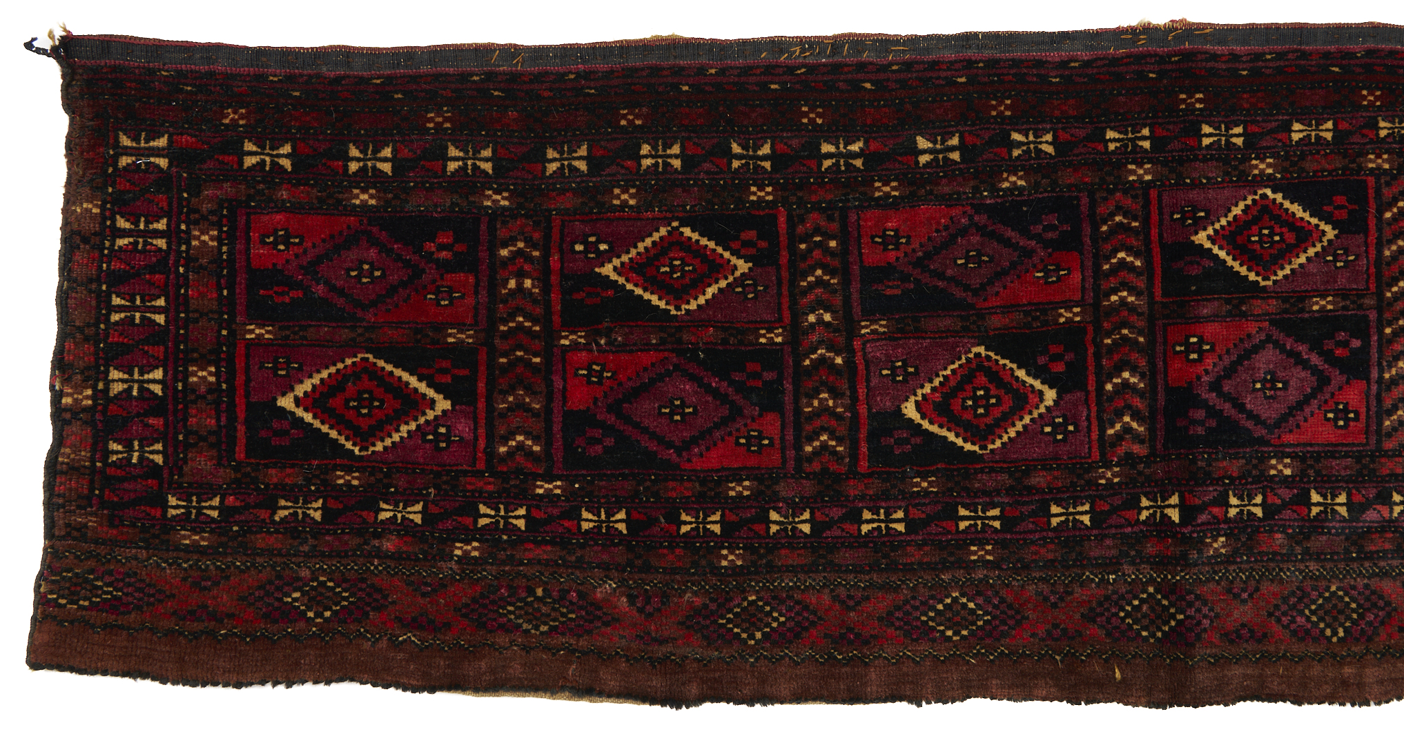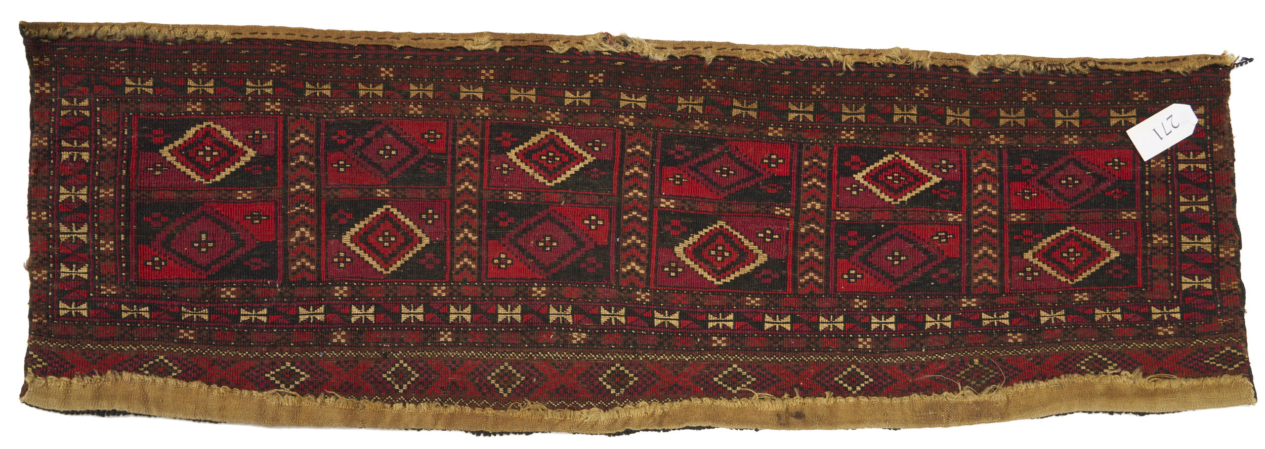 Three (3) Antique Turkmen weavings, all woven in colors of red, blue, and cream. 1st item: Antique Tekke Turkmen Chuval, wool on wool, retains some original fringe. Central dark red field with three rows of three guls and a wide lower geometric ensi border. 5 ft 2 in x 2 ft 7 in. Circa 1880s. 2nd item: Antique Yomud or Yomut Turkmen Chuval rug, central brick red field with three rows of three guls within three primary borders. 3 ft 7 in x 2 ft 3 in. Circa 1890s. 3rd item: Antique Tekke Turkmen weaving with two central rows of stylized diamond designs within three primary borders. 3 ft 11 in x 1 ft 3 in. Circa 1880s.