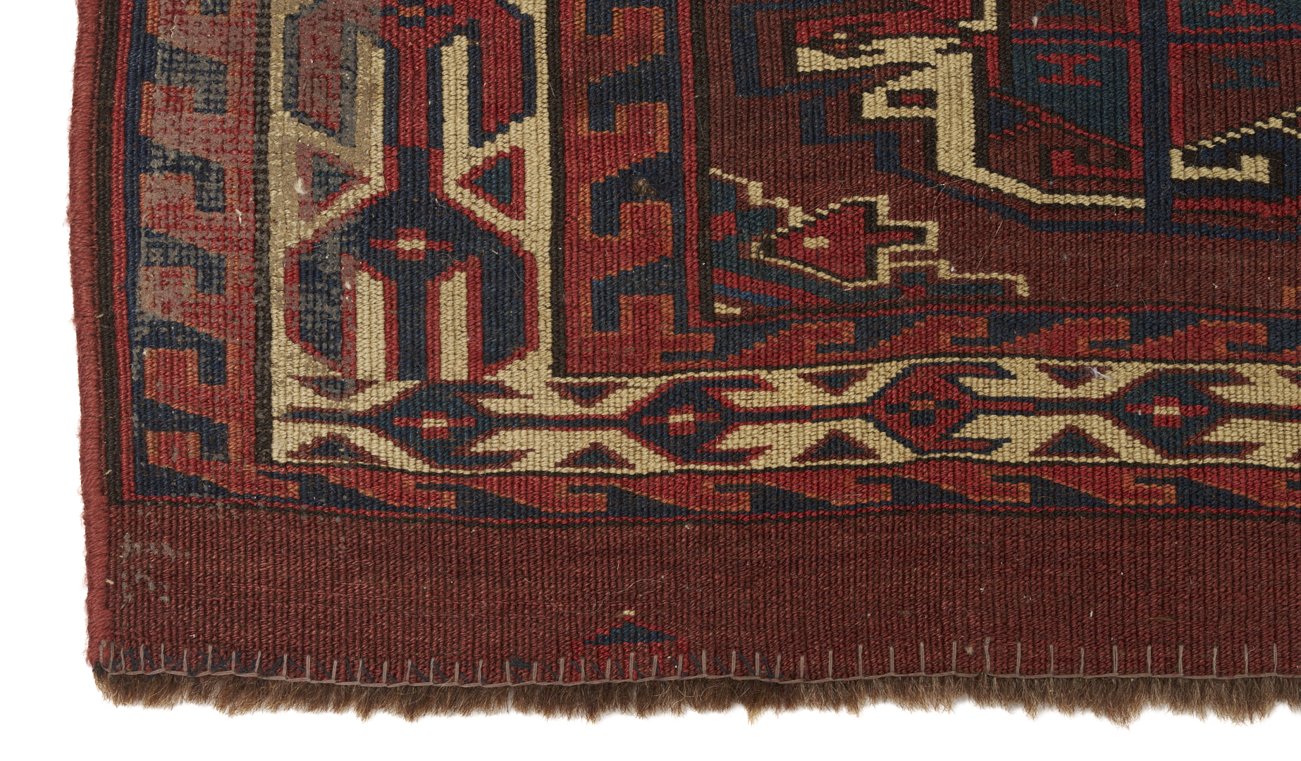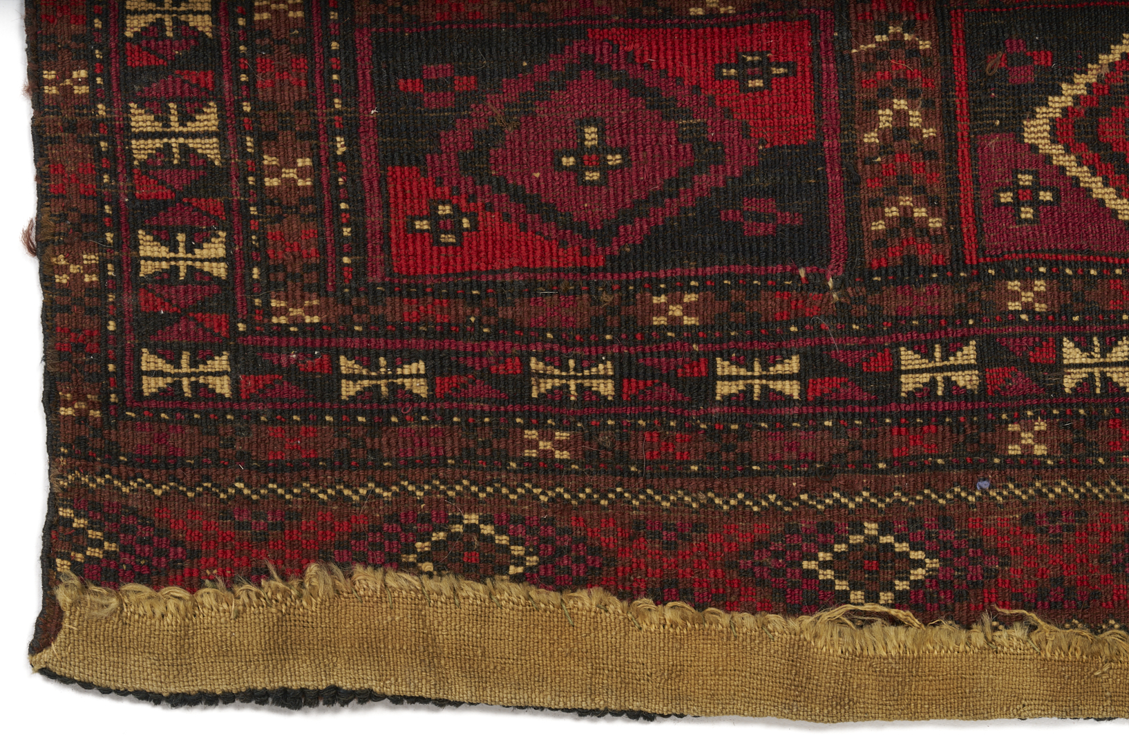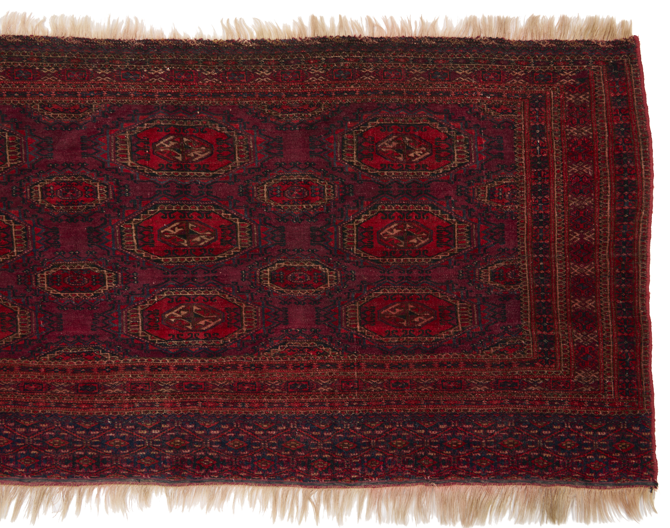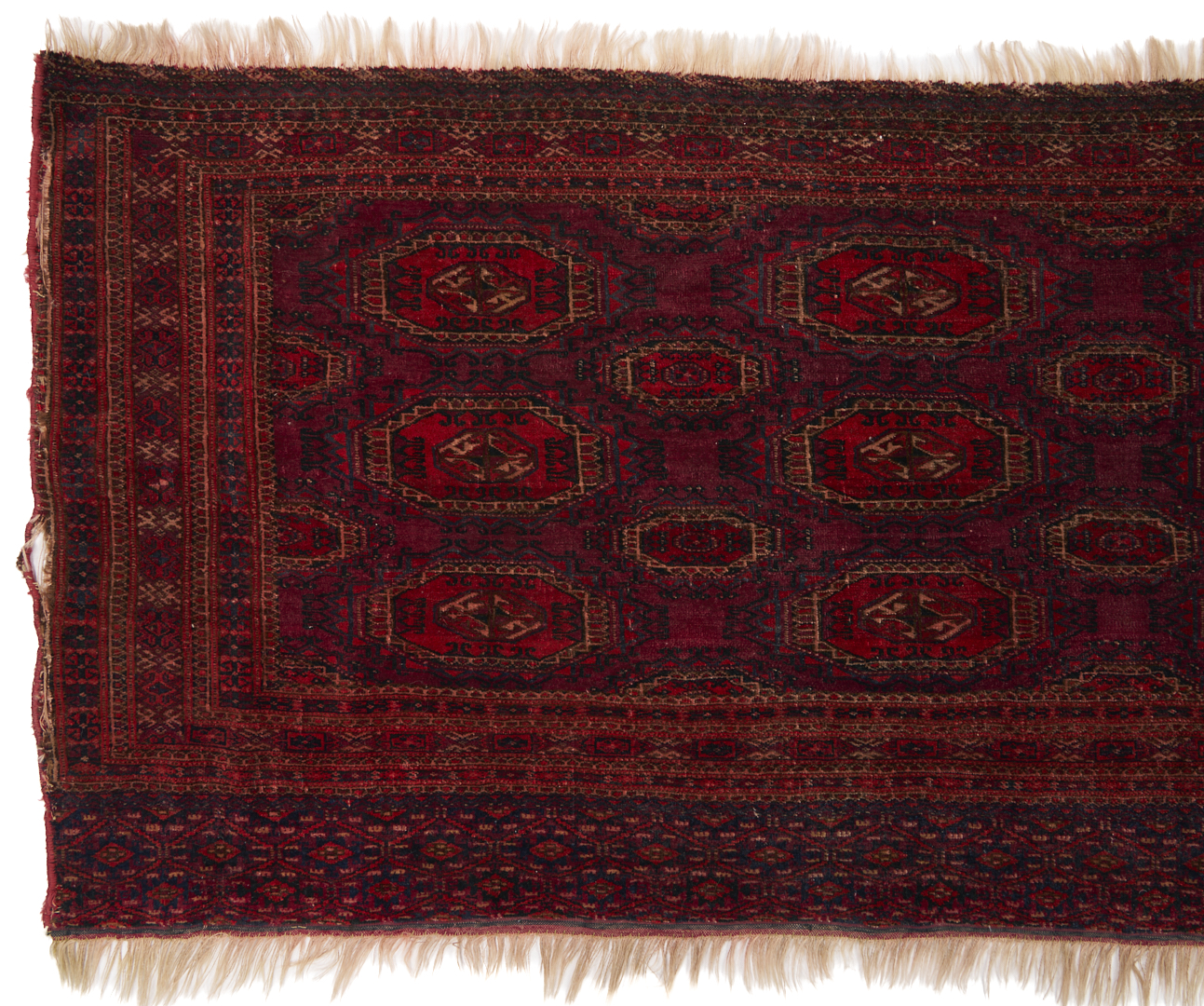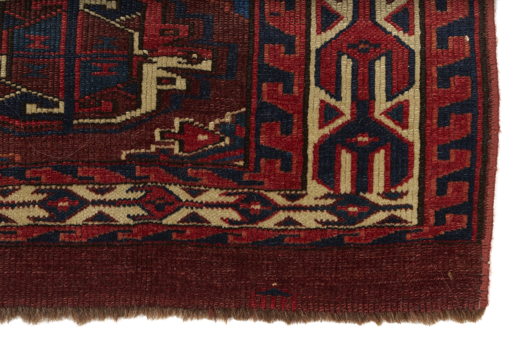 Three (3) Antique Turkmen weavings, all woven in colors of red, blue, and cream. 1st item: Antique Tekke Turkmen Chuval, wool on wool, retains some original fringe. Central dark red field with three rows of three guls and a wide lower geometric ensi border. 5 ft 2 in x 2 ft 7 in. Circa 1880s. 2nd item: Antique Yomud or Yomut Turkmen Chuval rug, central brick red field with three rows of three guls within three primary borders. 3 ft 7 in x 2 ft 3 in. Circa 1890s. 3rd item: Antique Tekke Turkmen weaving with two central rows of stylized diamond designs within three primary borders. 3 ft 11 in x 1 ft 3 in. Circa 1880s.