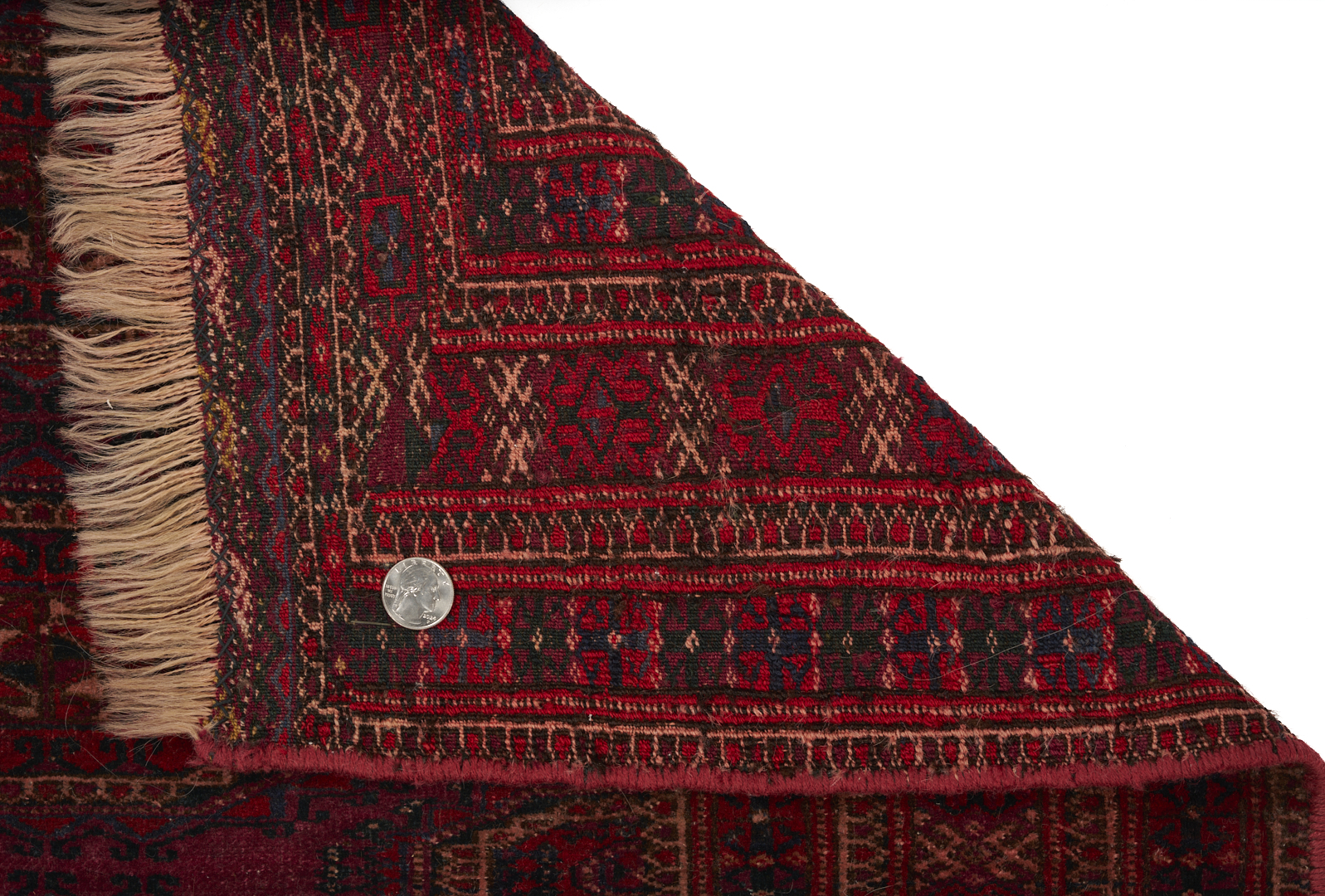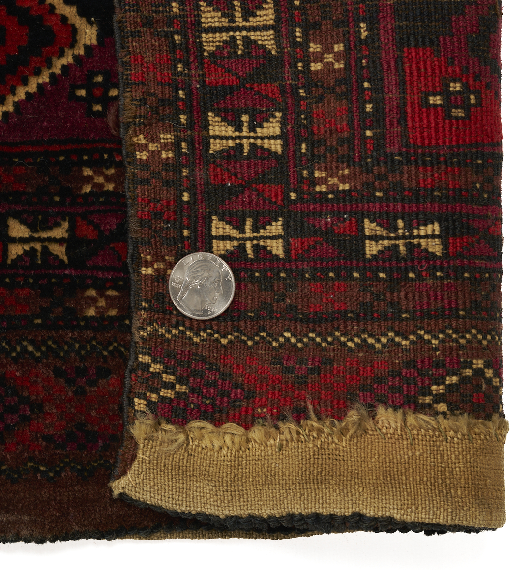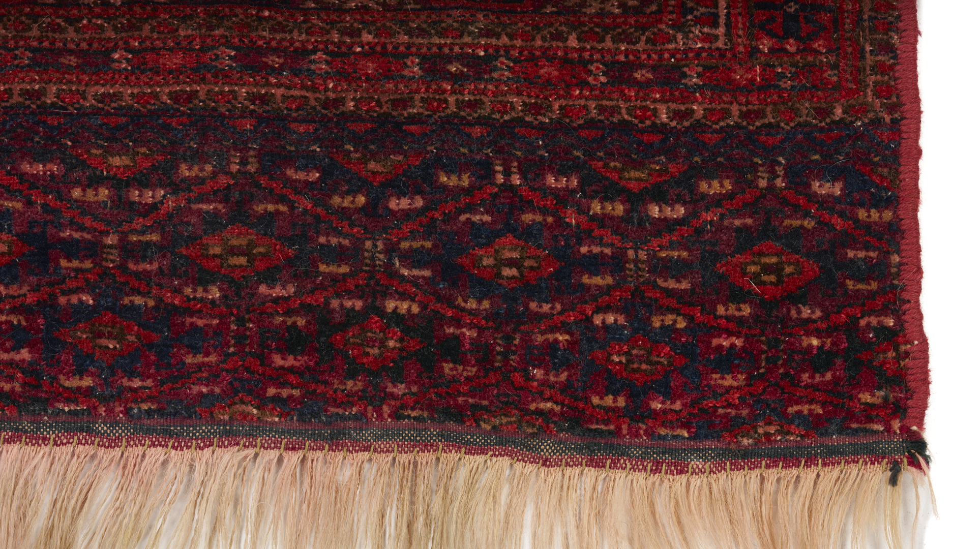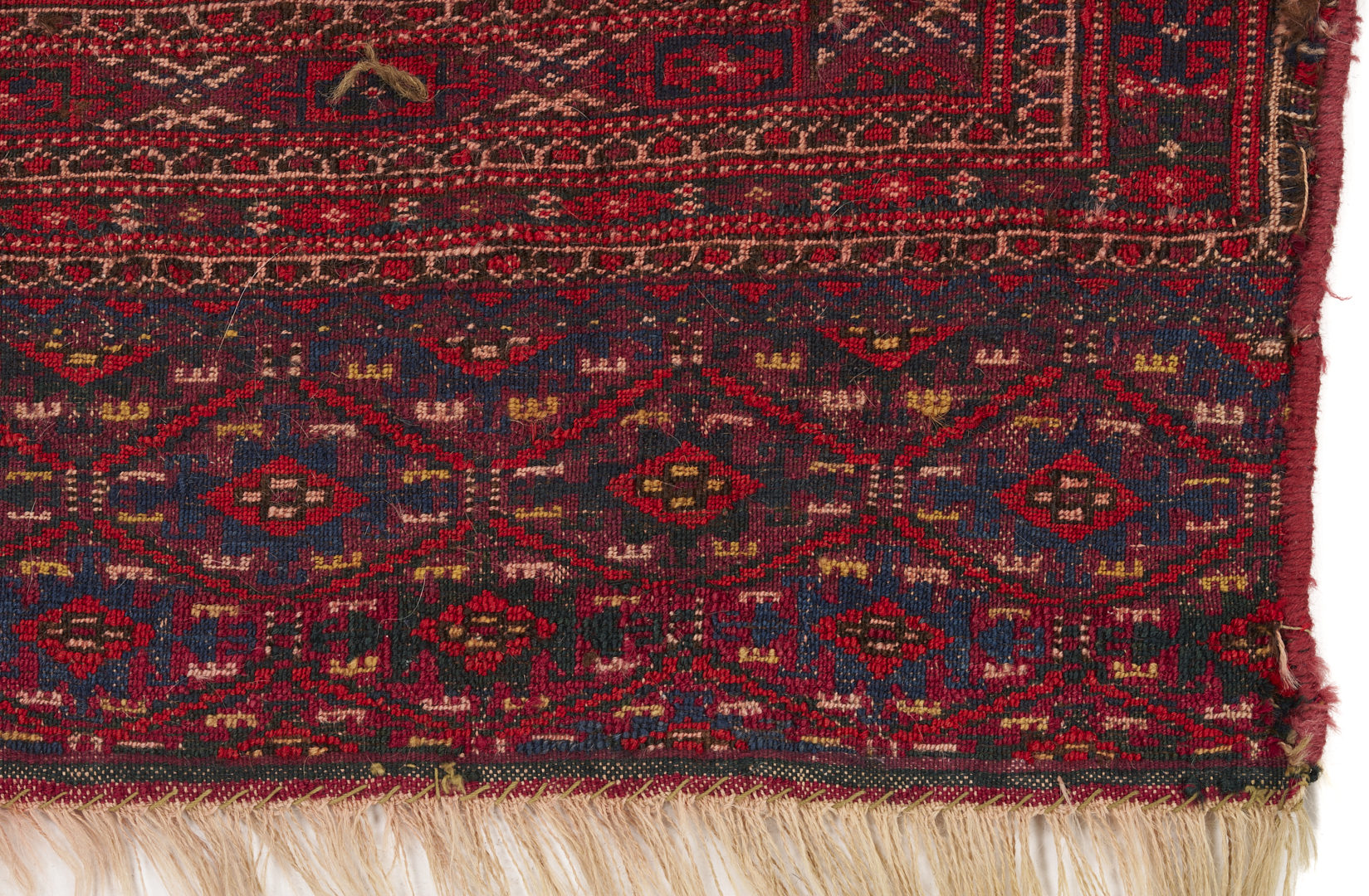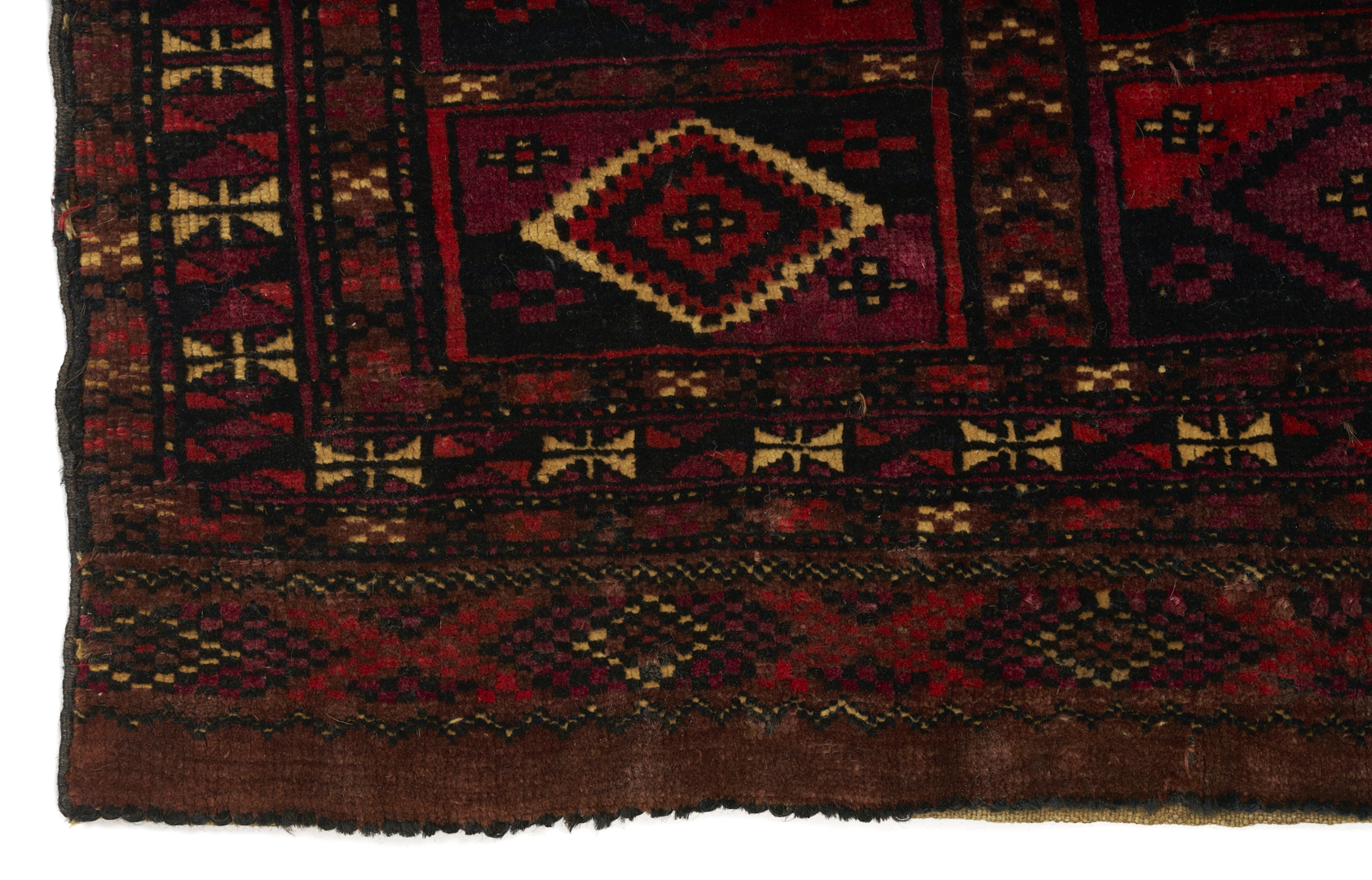 Three (3) Antique Turkmen weavings, all woven in colors of red, blue, and cream. 1st item: Antique Tekke Turkmen Chuval, wool on wool, retains some original fringe. Central dark red field with three rows of three guls and a wide lower geometric ensi border. 5 ft 2 in x 2 ft 7 in. Circa 1880s. 2nd item: Antique Yomud or Yomut Turkmen Chuval rug, central brick red field with three rows of three guls within three primary borders. 3 ft 7 in x 2 ft 3 in. Circa 1890s. 3rd item: Antique Tekke Turkmen weaving with two central rows of stylized diamond designs within three primary borders. 3 ft 11 in x 1 ft 3 in. Circa 1880s.