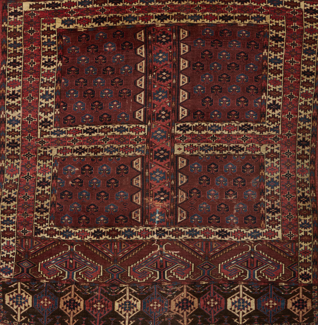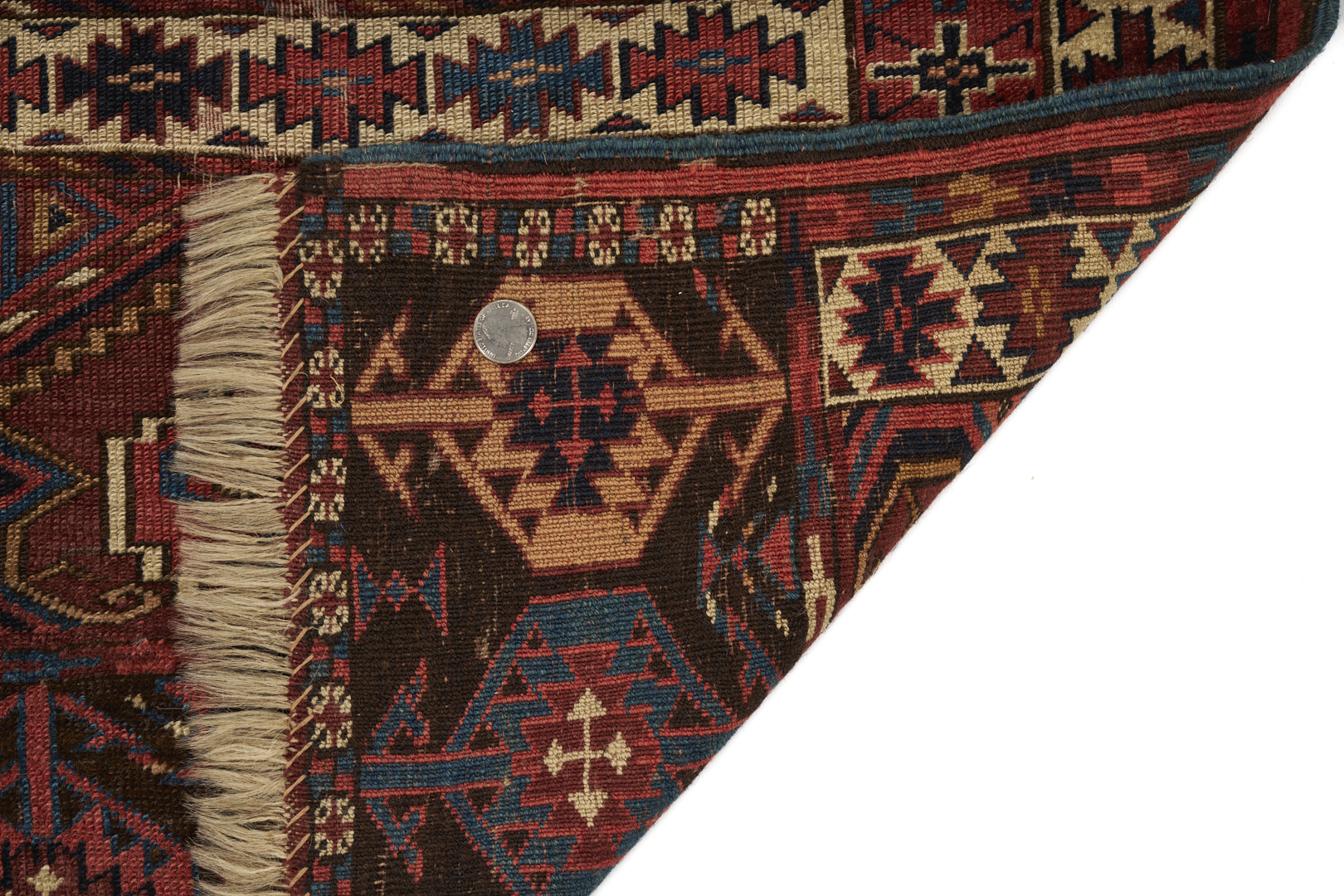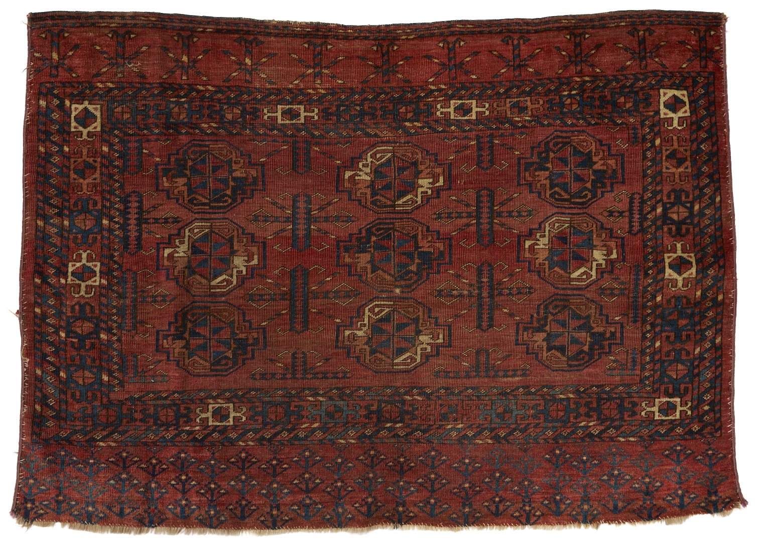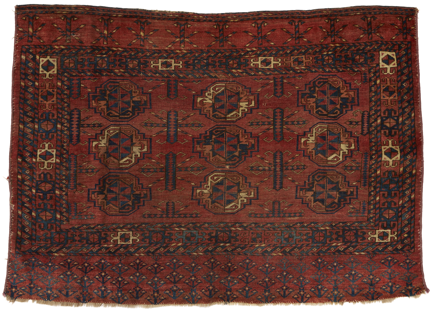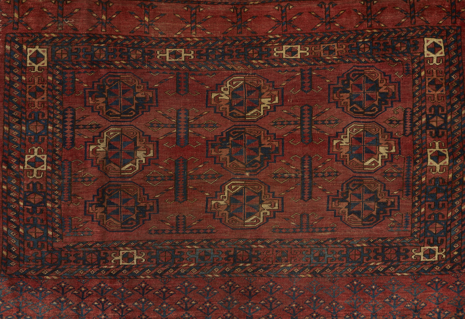 1st item: Antique Yomud or Yomut Turkmen Ensi tribal rug, wool on wool, central cruciform design with four panels having foliate designs, within three primary borders, wide elem panels to one end with foliate designs. Woven in red, blue, and cream colors. 5 ft. 3 in. x 5 ft. 1 in. Circa 1890s. 2nd item: Antique Yomud or Yomut Turkmen Chuval rug, central deep rust or brick red field with three rows of three guls within three primary borders, lower foliate elem panel. Woven in colors of red, blue, and cream. 4 ft. 3 in. x 3 ft. Circa 1880s.