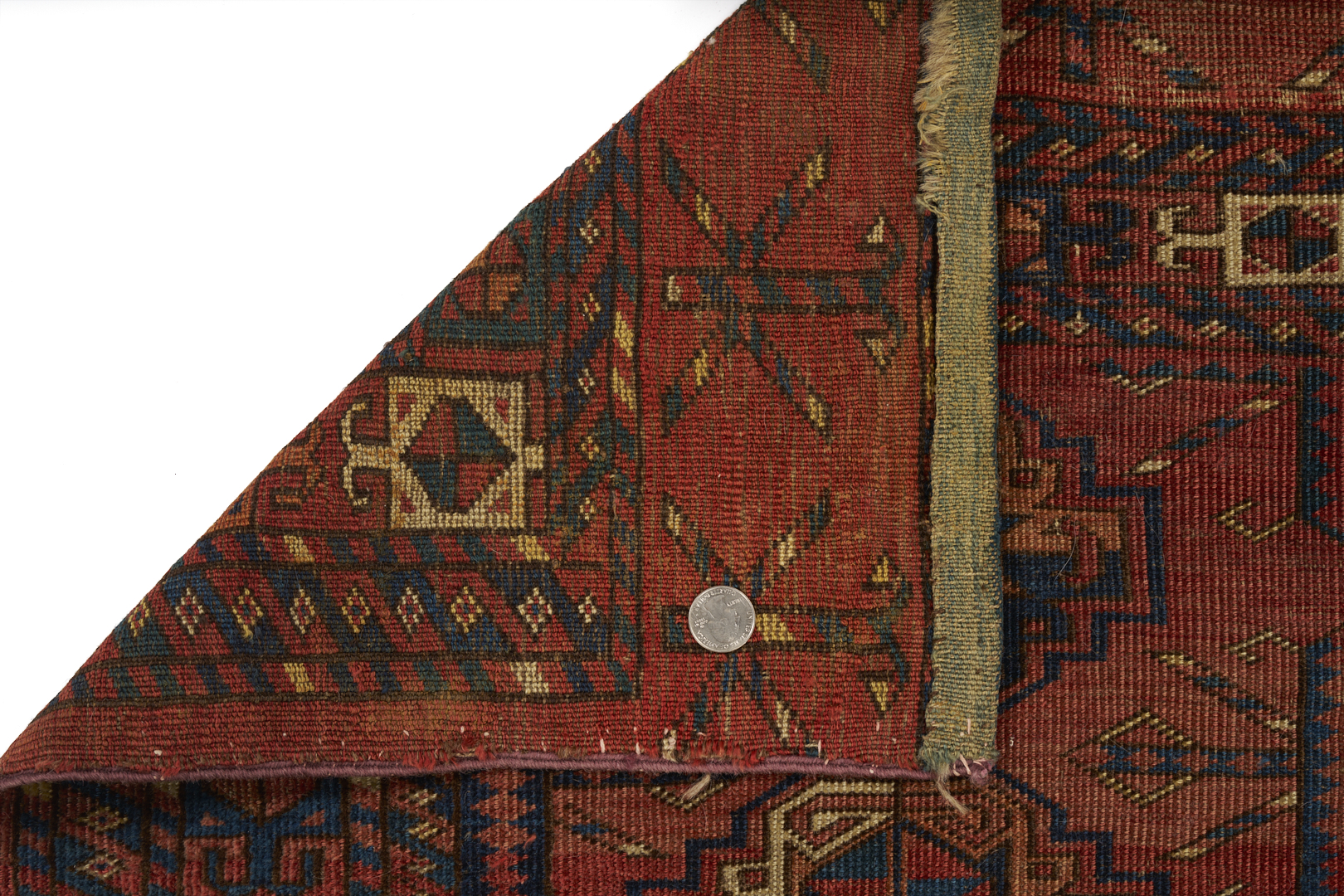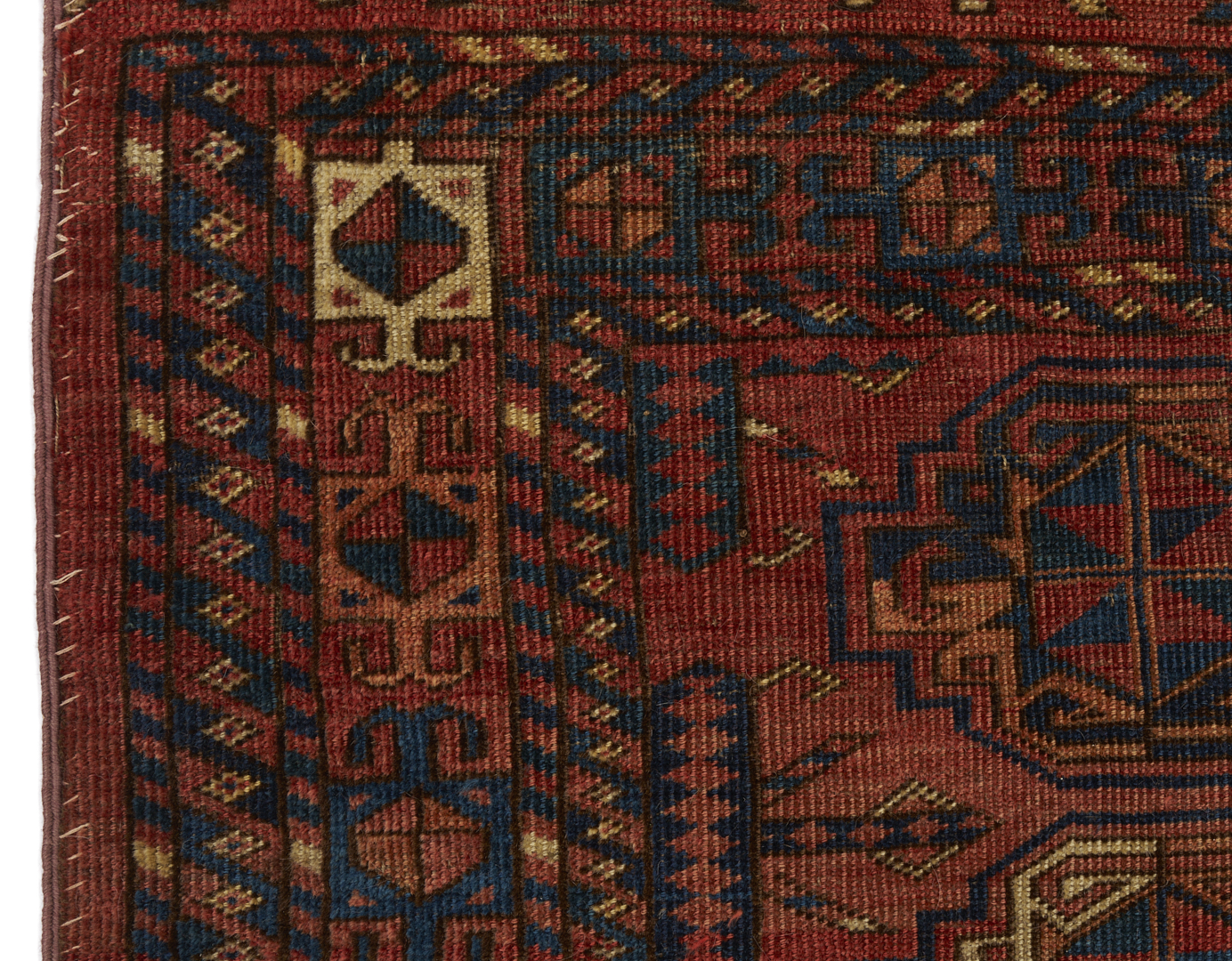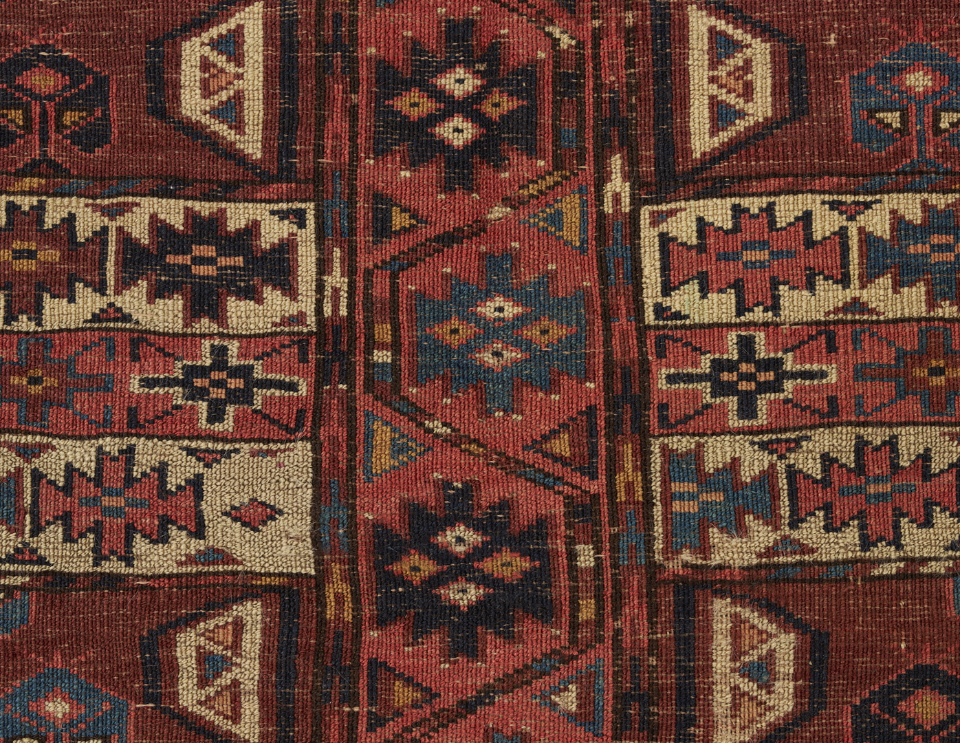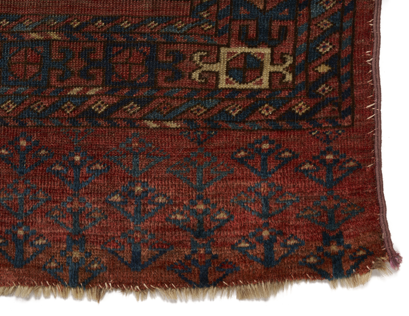 1st item: Antique Yomud or Yomut Turkmen Ensi tribal rug, wool on wool, central cruciform design with four panels having foliate designs, within three primary borders, wide elem panels to one end with foliate designs. Woven in red, blue, and cream colors. 5 ft. 3 in. x 5 ft. 1 in. Circa 1890s. 2nd item: Antique Yomud or Yomut Turkmen Chuval rug, central deep rust or brick red field with three rows of three guls within three primary borders, lower foliate elem panel. Woven in colors of red, blue, and cream. 4 ft. 3 in. x 3 ft. Circa 1880s.