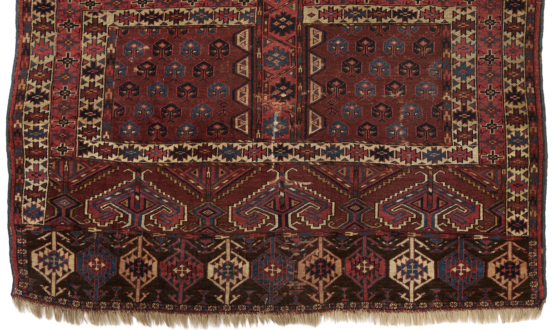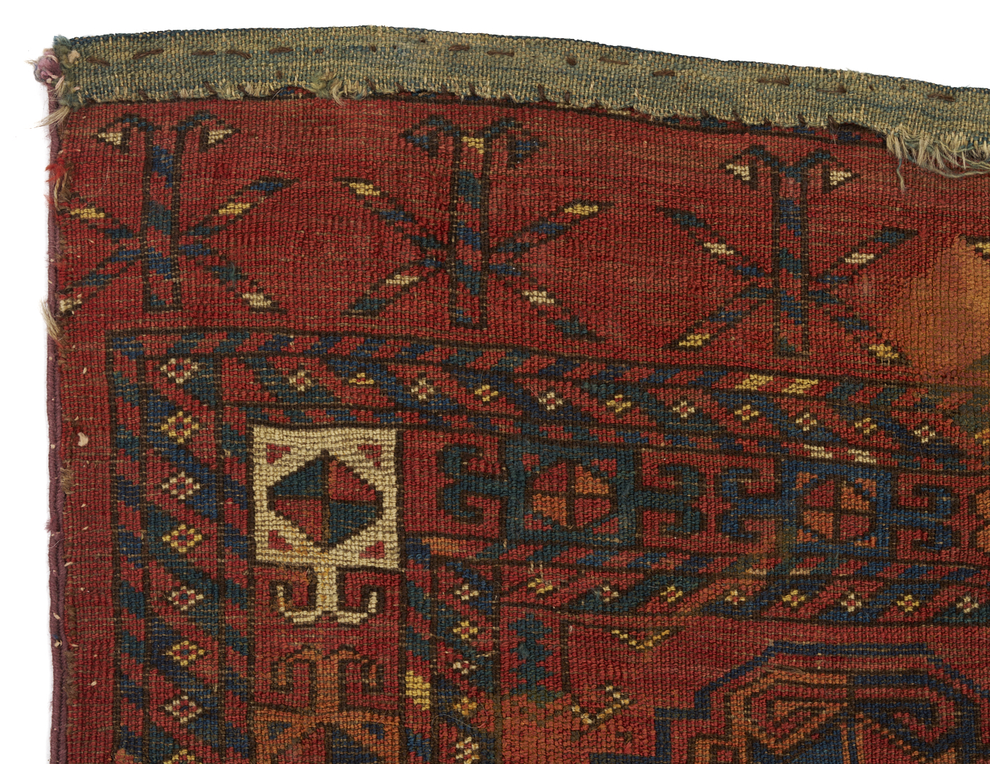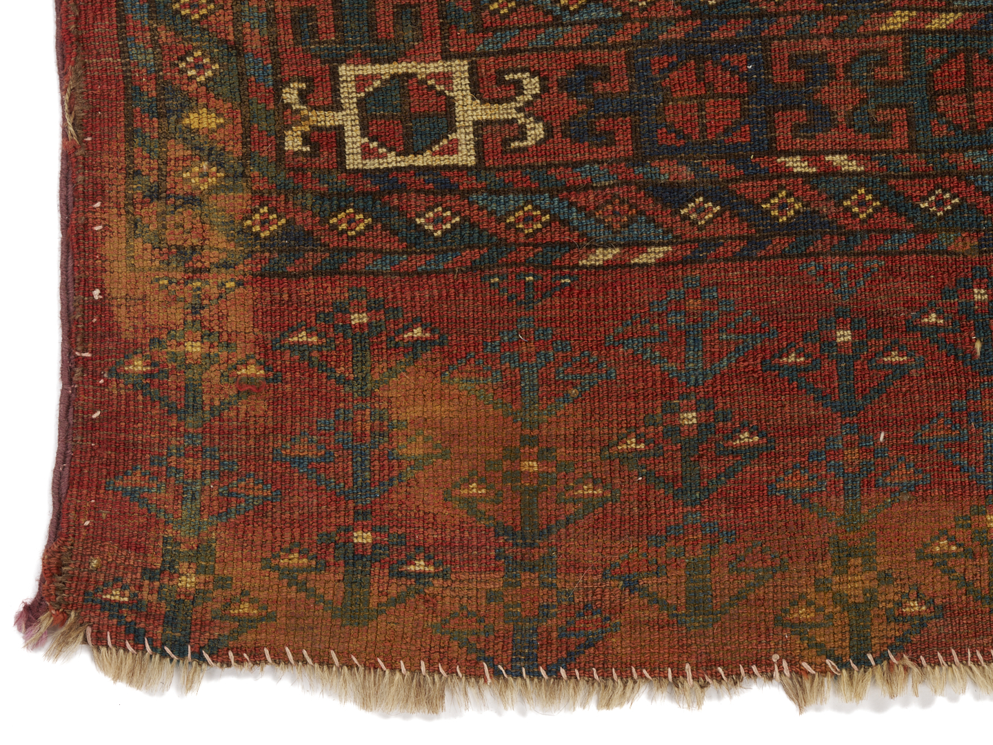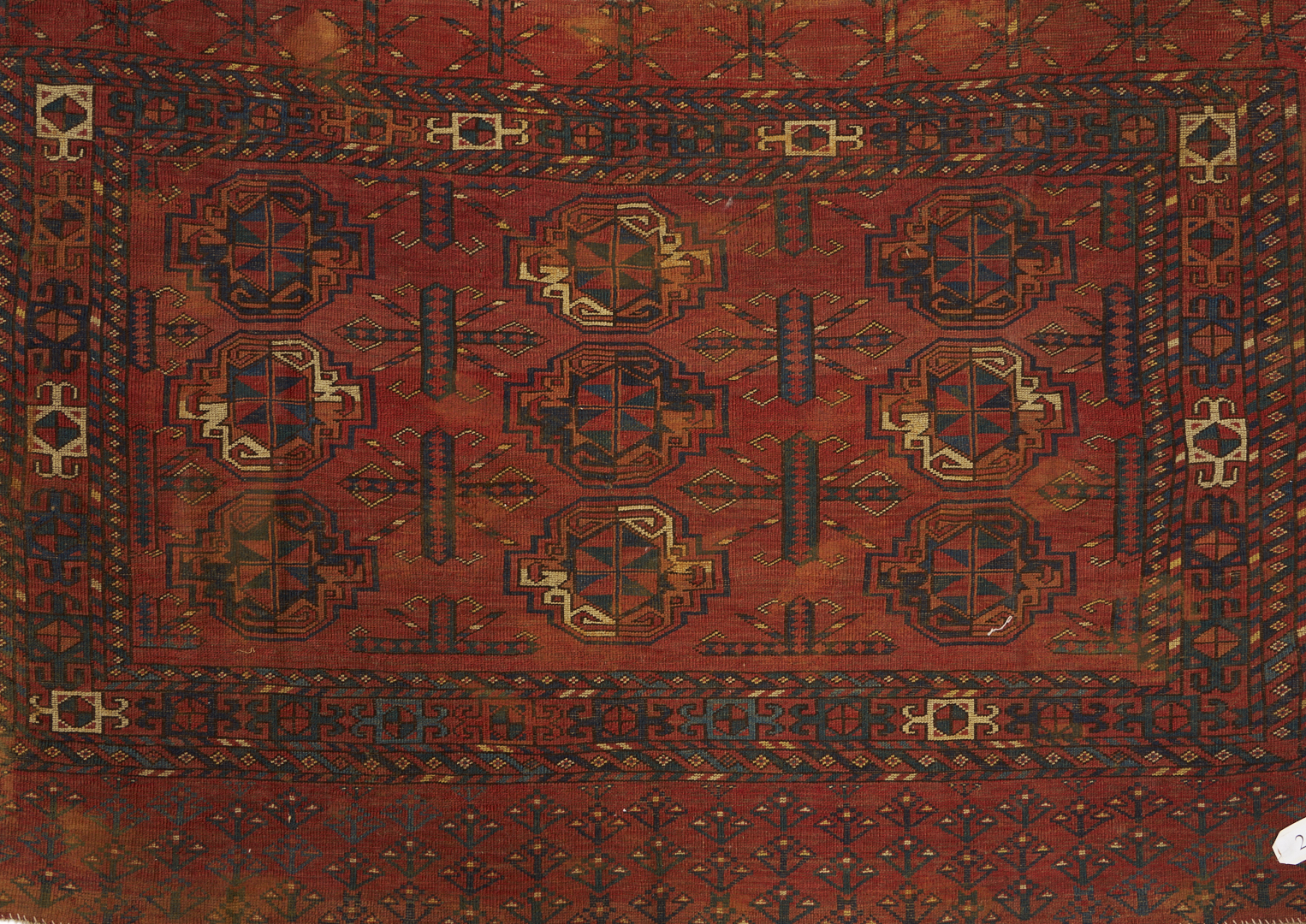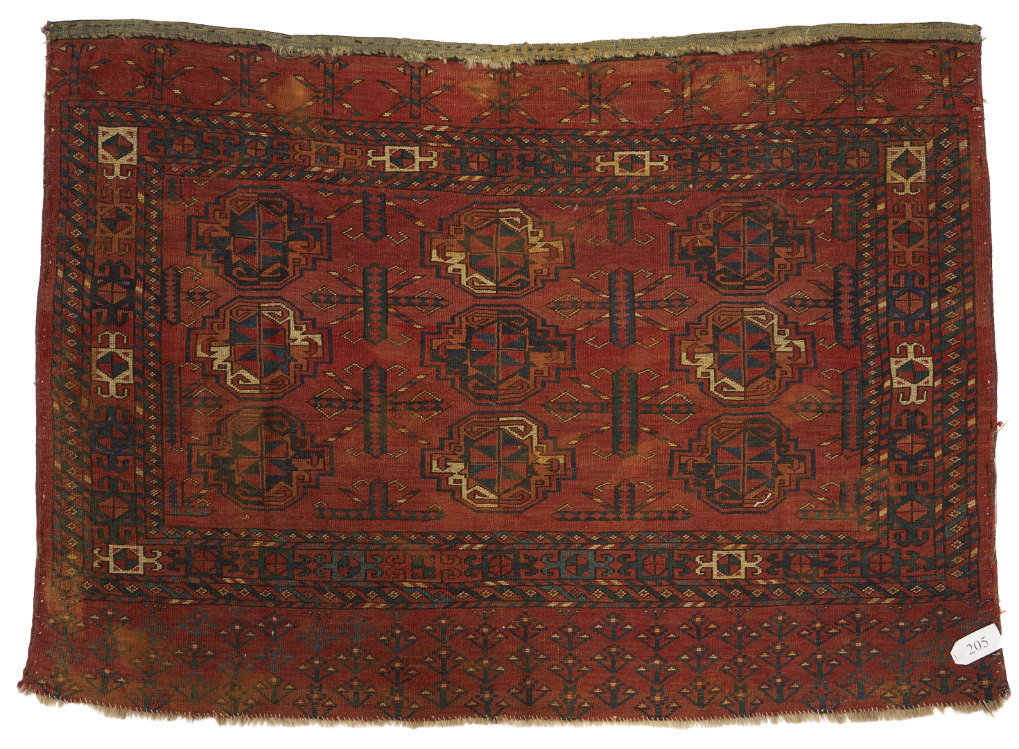1st item: Antique Yomud or Yomut Turkmen Ensi tribal rug, wool on wool, central cruciform design with four panels having foliate designs, within three primary borders, wide elem panels to one end with foliate designs. Woven in red, blue, and cream colors. 5 ft. 3 in. x 5 ft. 1 in. Circa 1890s. 2nd item: Antique Yomud or Yomut Turkmen Chuval rug, central deep rust or brick red field with three rows of three guls within three primary borders, lower foliate elem panel. Woven in colors of red, blue, and cream. 4 ft. 3 in. x 3 ft. Circa 1880s.