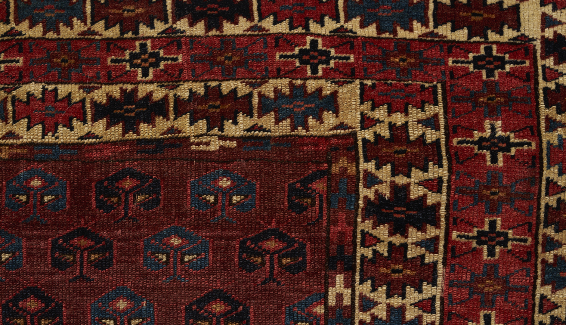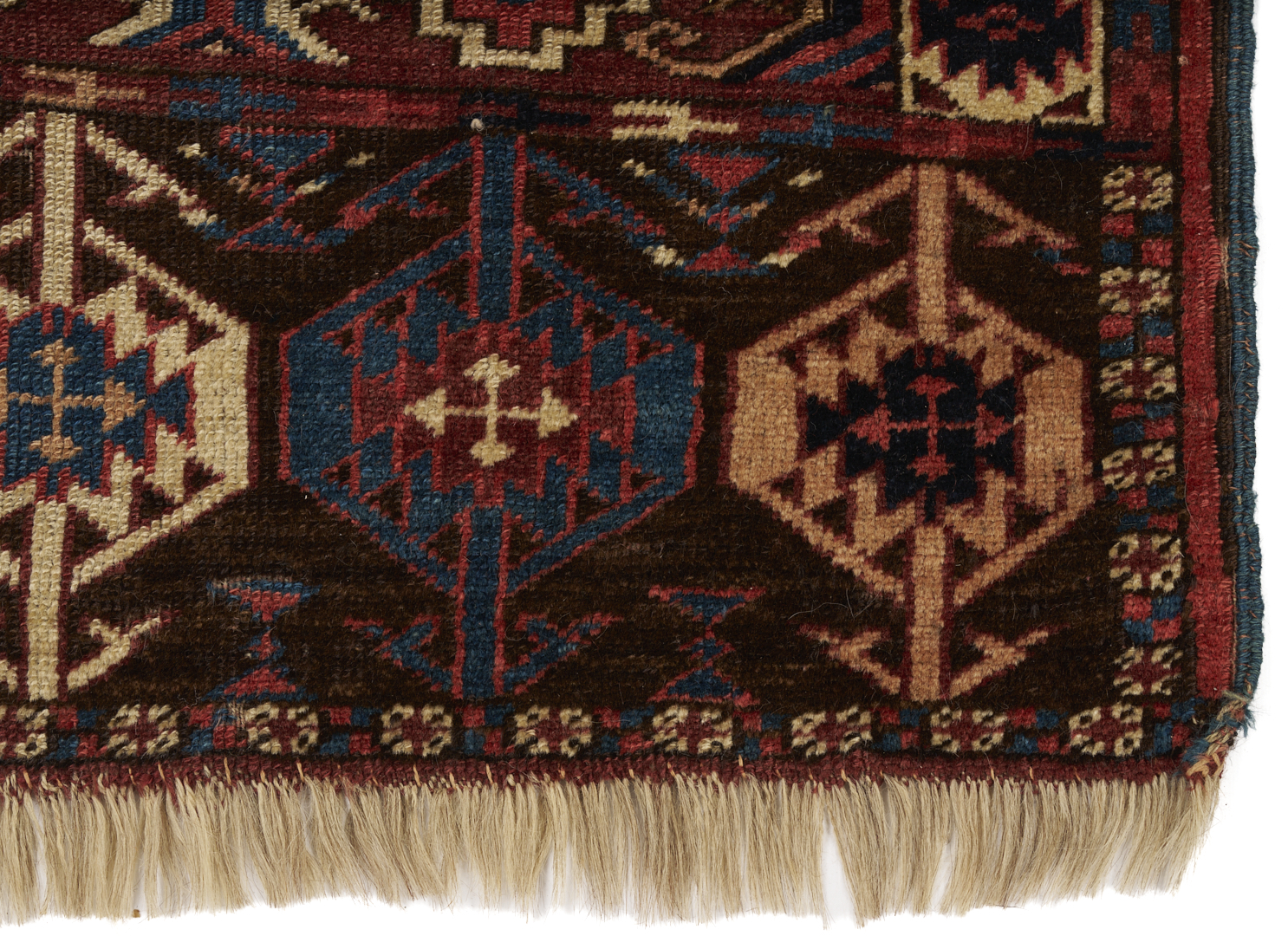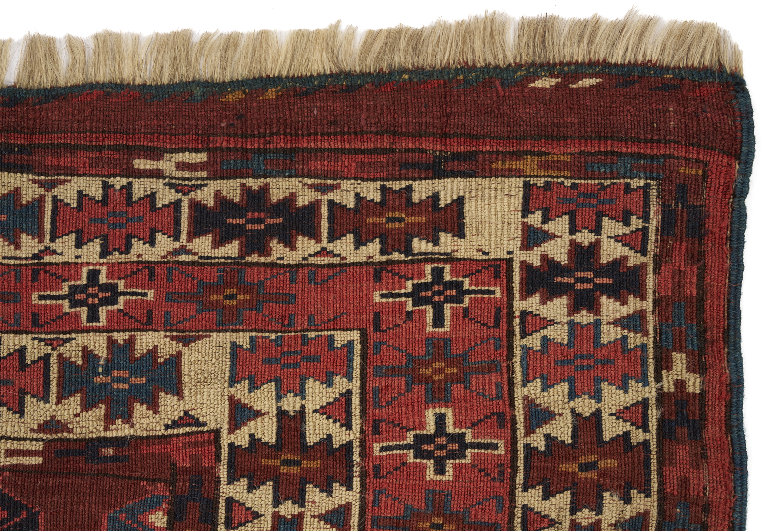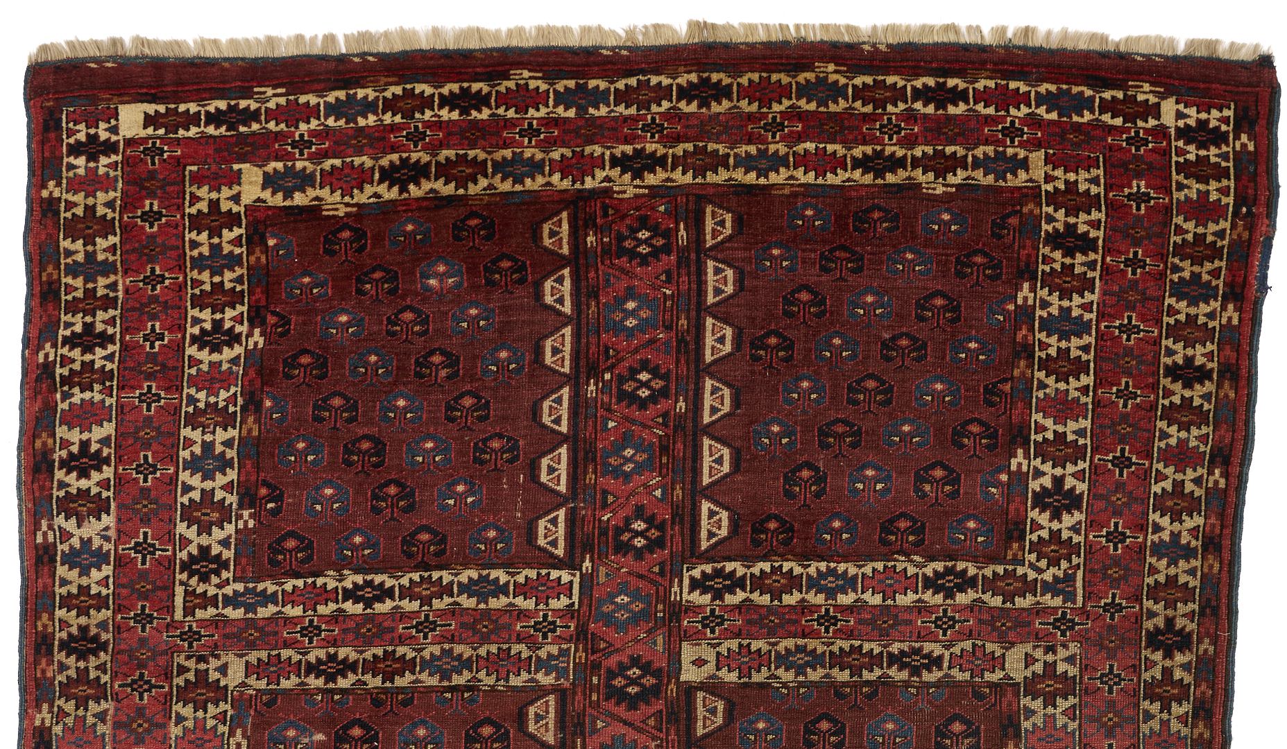1st item: Antique Yomud or Yomut Turkmen Ensi tribal rug, wool on wool, central cruciform design with four panels having foliate designs, within three primary borders, wide elem panels to one end with foliate designs. Woven in red, blue, and cream colors. 5 ft. 3 in. x 5 ft. 1 in. Circa 1890s. 2nd item: Antique Yomud or Yomut Turkmen Chuval rug, central deep rust or brick red field with three rows of three guls within three primary borders, lower foliate elem panel. Woven in colors of red, blue, and cream. 4 ft. 3 in. x 3 ft. Circa 1880s.