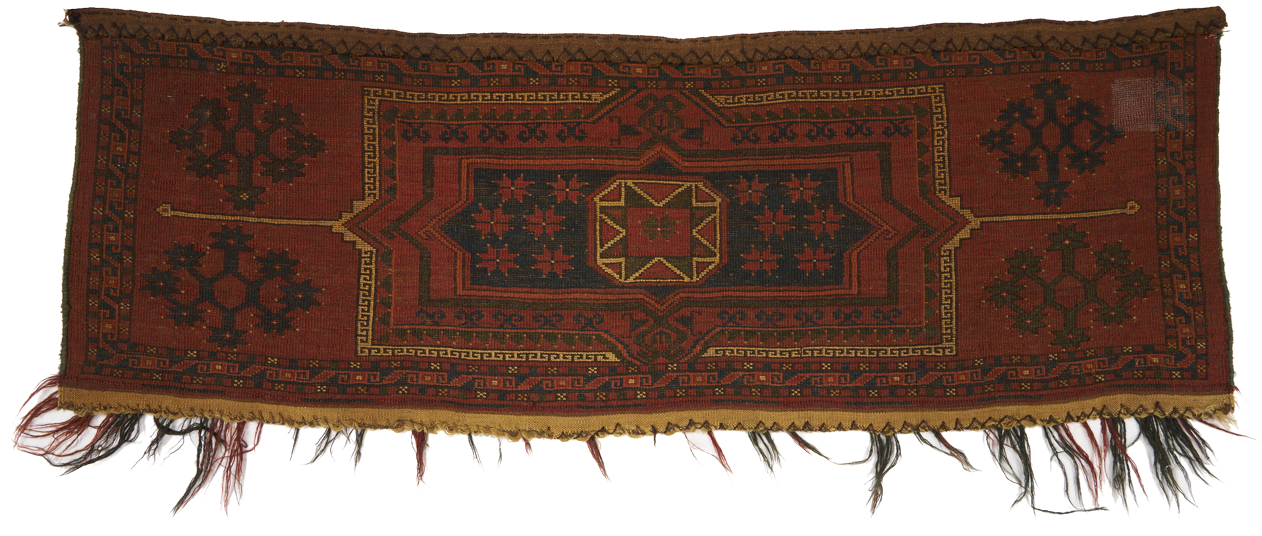 Three (3) Antique Turkmen weavings, all wool on wool, including an Ersari trapping, an Ersari torba, and a Yomud Torba, all woven in colors of red. Sizes include 5 ft 2 in x 1 ft 2 in, 4 ft 6 in x 1 ft 6 in, and 3 ft 8 in x 1 ft 8 in. All last quarter 19th century.