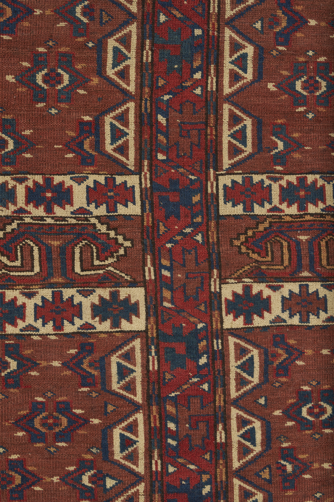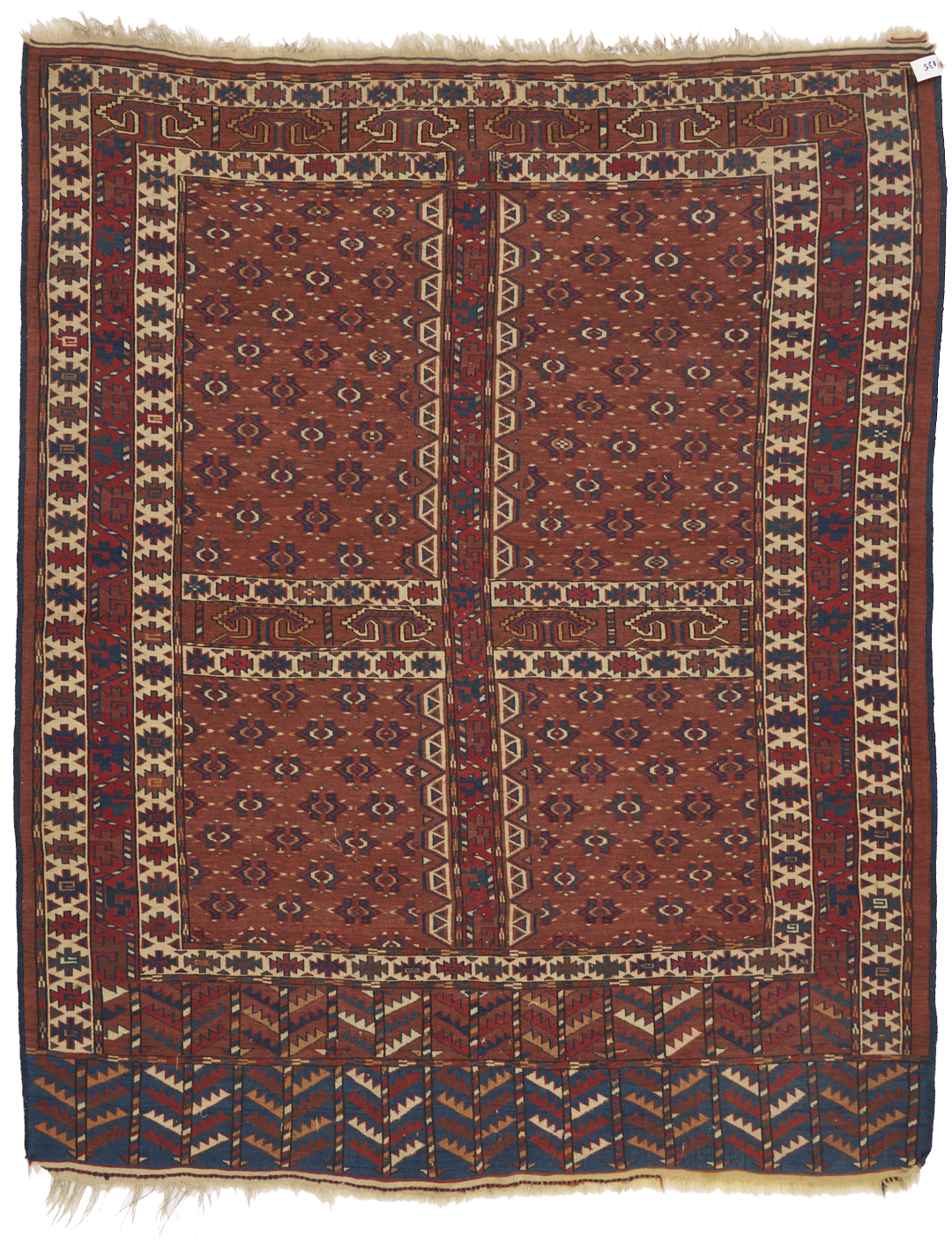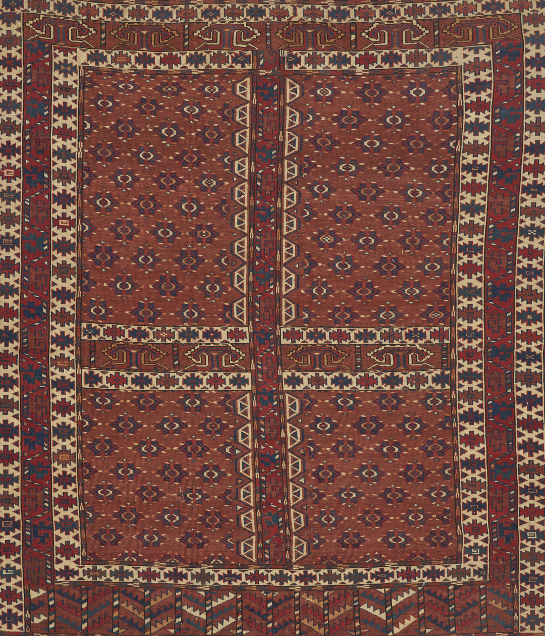 Antique Yomud or Yomut Turkmen Ensi tribal rug, wool on wool, central cruciform design with four panels having geometric designs, within four primary borders, wide elem panel to lower end with chevron designs. Woven in red, blue, and cream colors. 6 ft 3 in x 5 ft. Circa 1880.