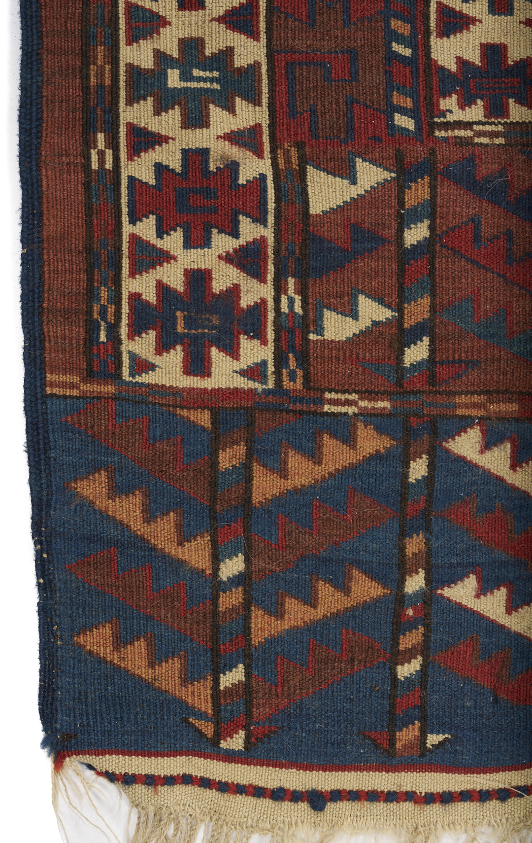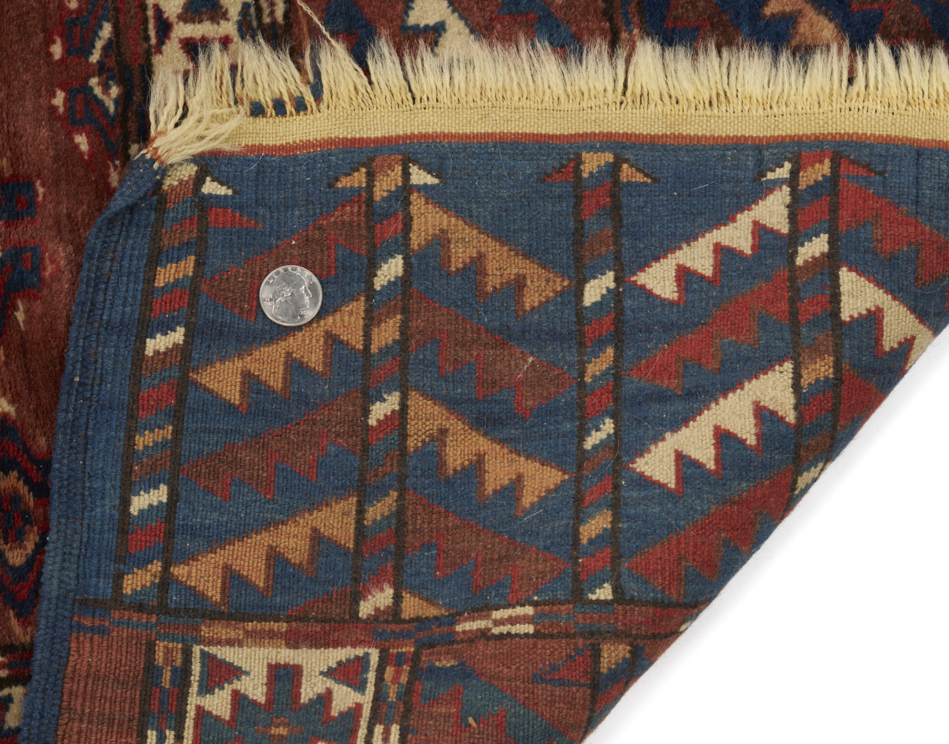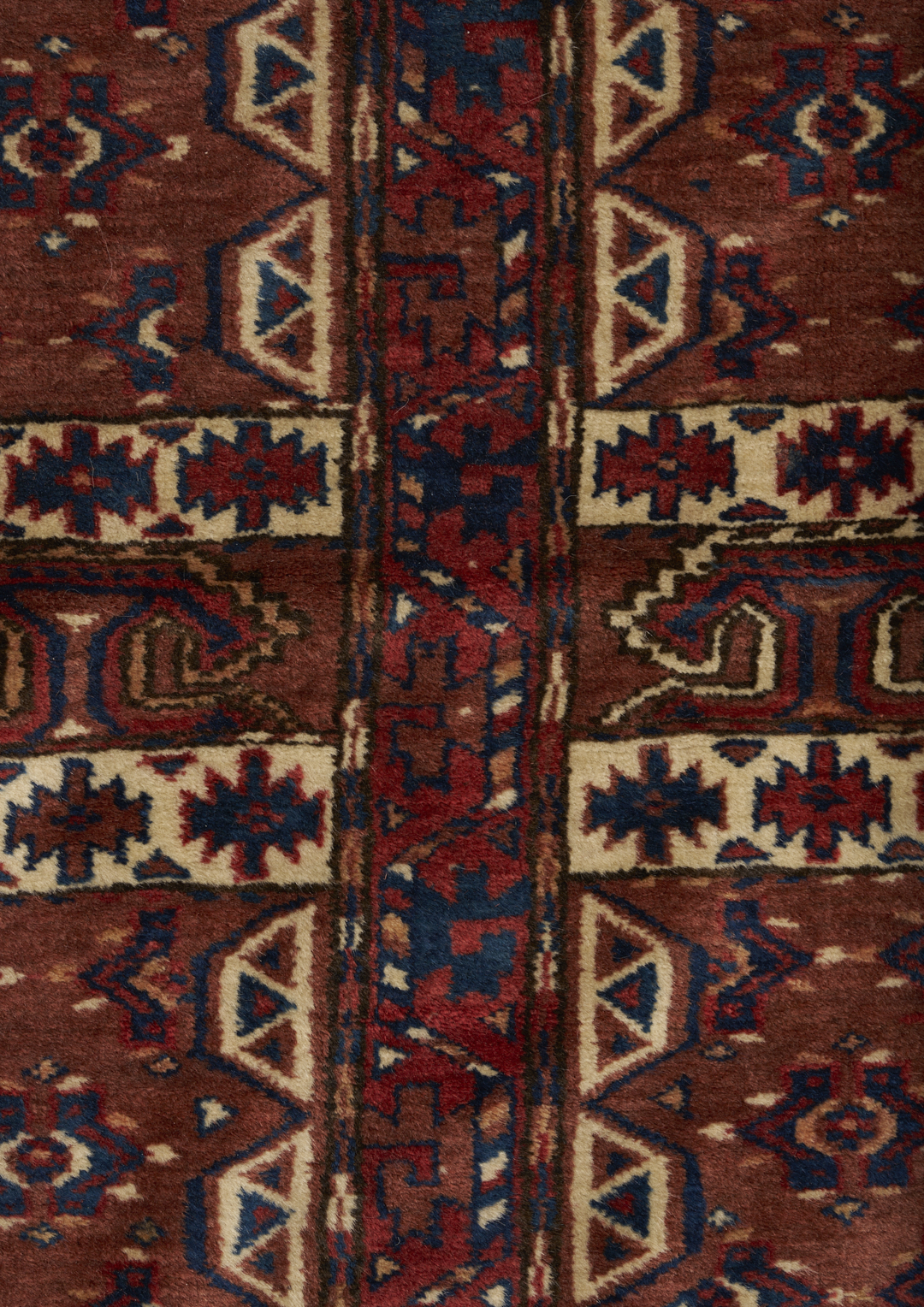 Antique Yomud or Yomut Turkmen Ensi tribal rug, wool on wool, central cruciform design with four panels having geometric designs, within four primary borders, wide elem panel to lower end with chevron designs. Woven in red, blue, and cream colors. 6 ft 3 in x 5 ft. Circa 1880.