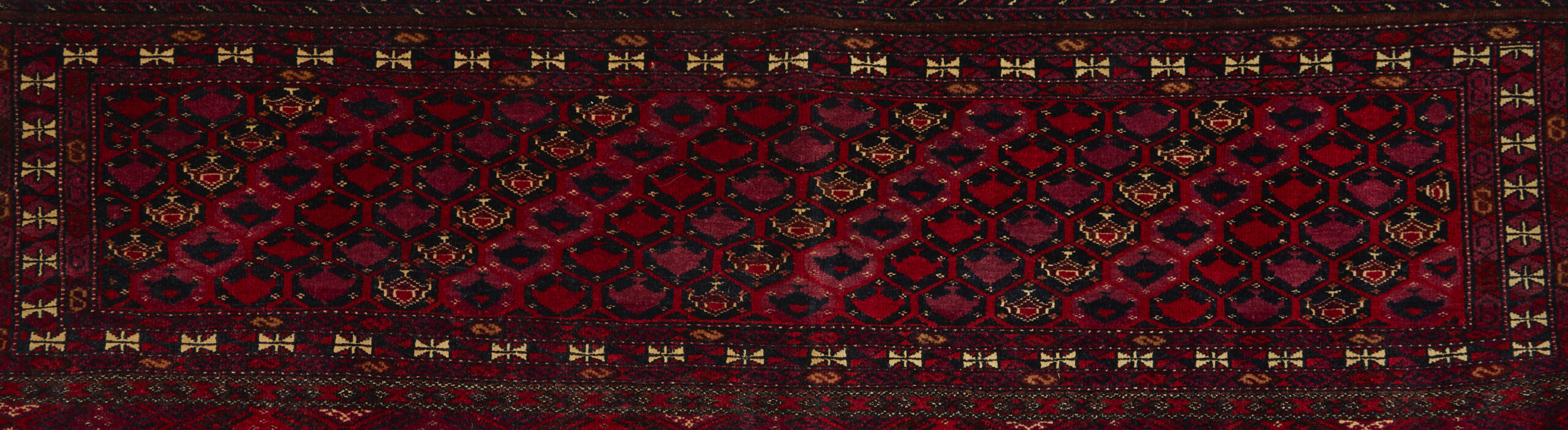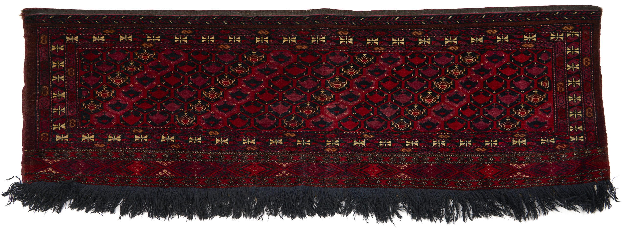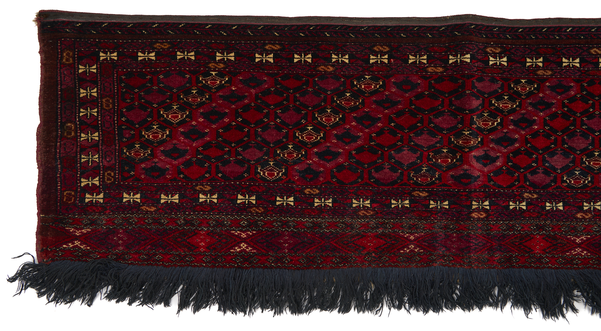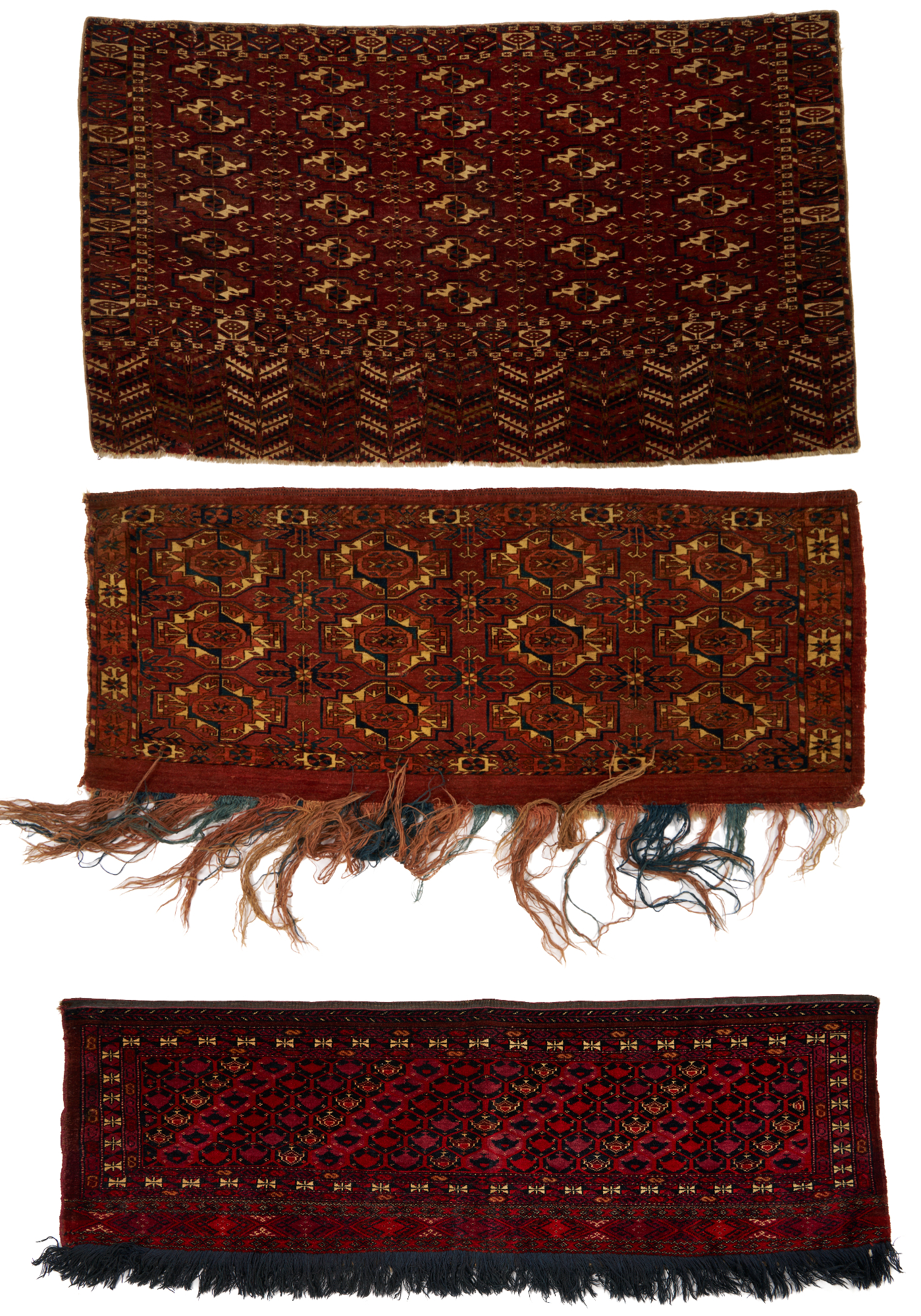 Three (3) antique Turkmen Tekke Torba weavings, all wool on wool construction, including one Ak-Su design, one with 12 guls, and one with 30 guls. All woven in red, blue, and cream colors. Ranging in size from 3 ft. 10 in. x 1 ft. 10 in. to 4 ft. 2 in. x 1 ft. 6 in. All last quarter 19th century.