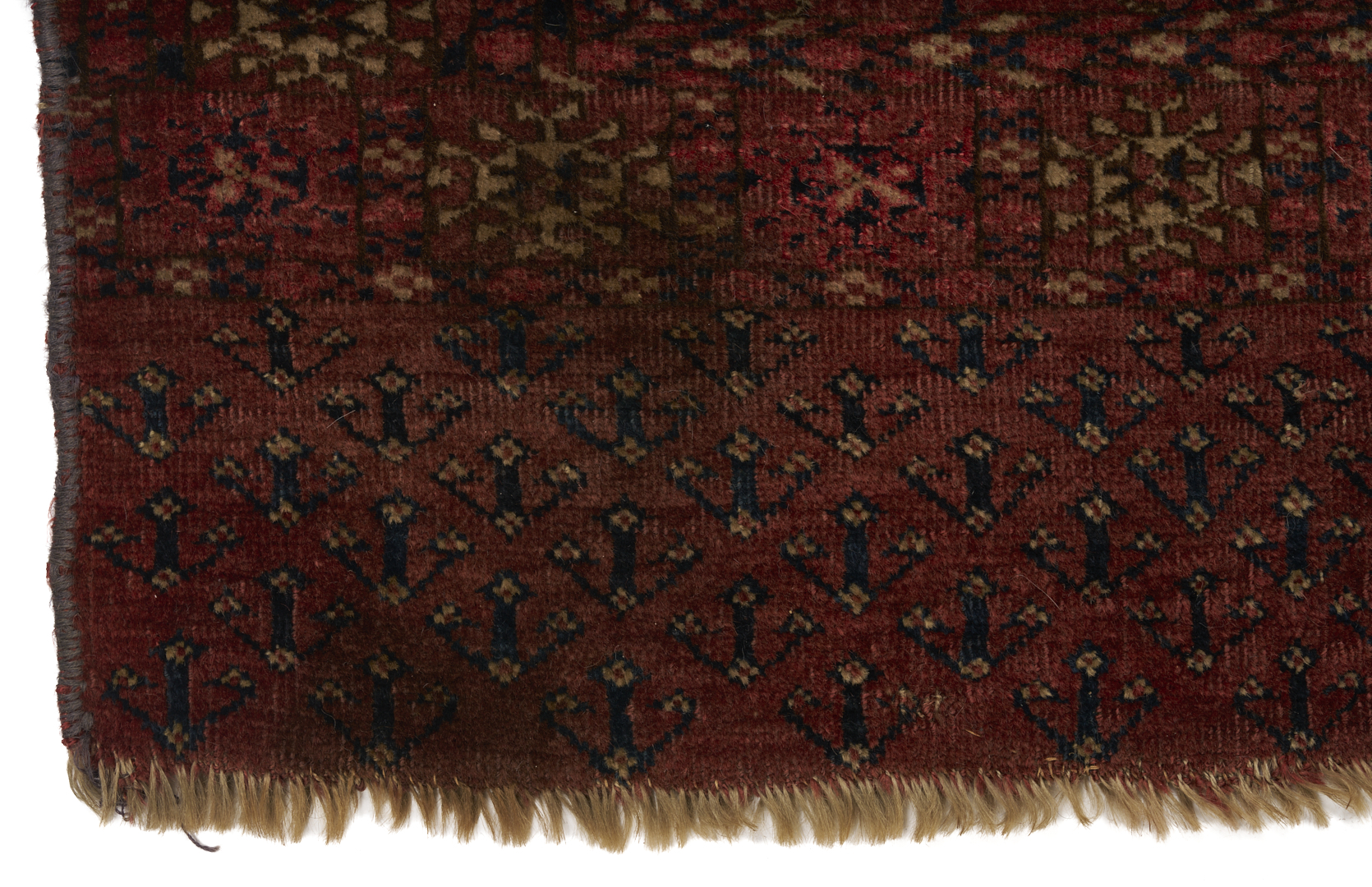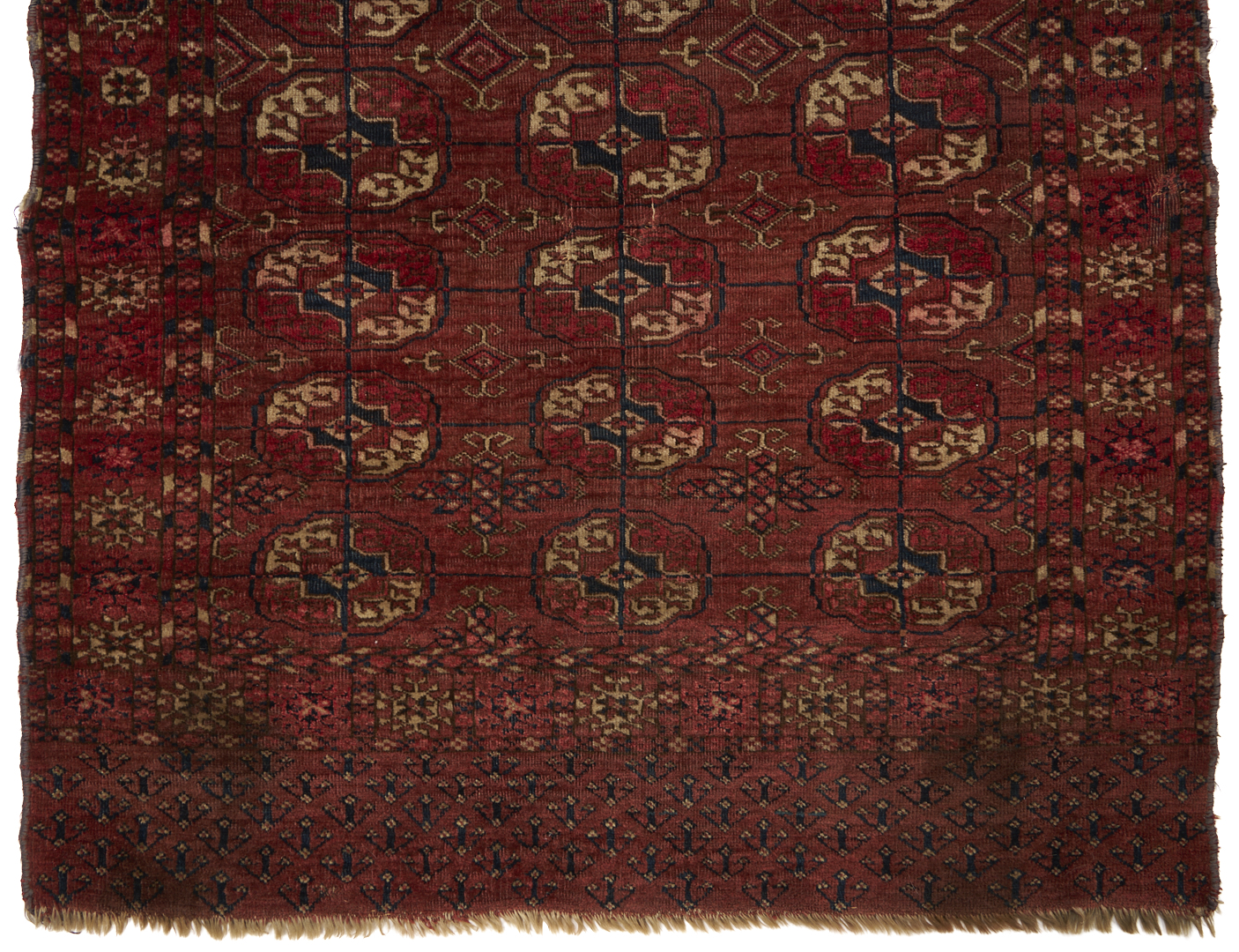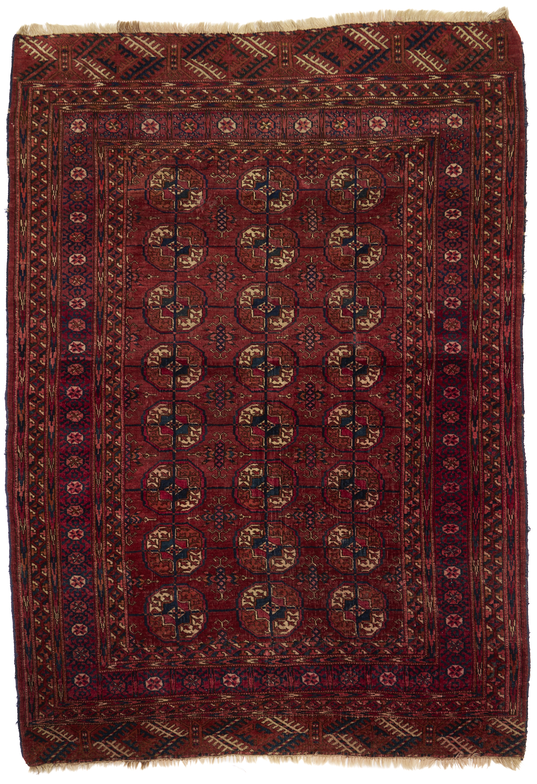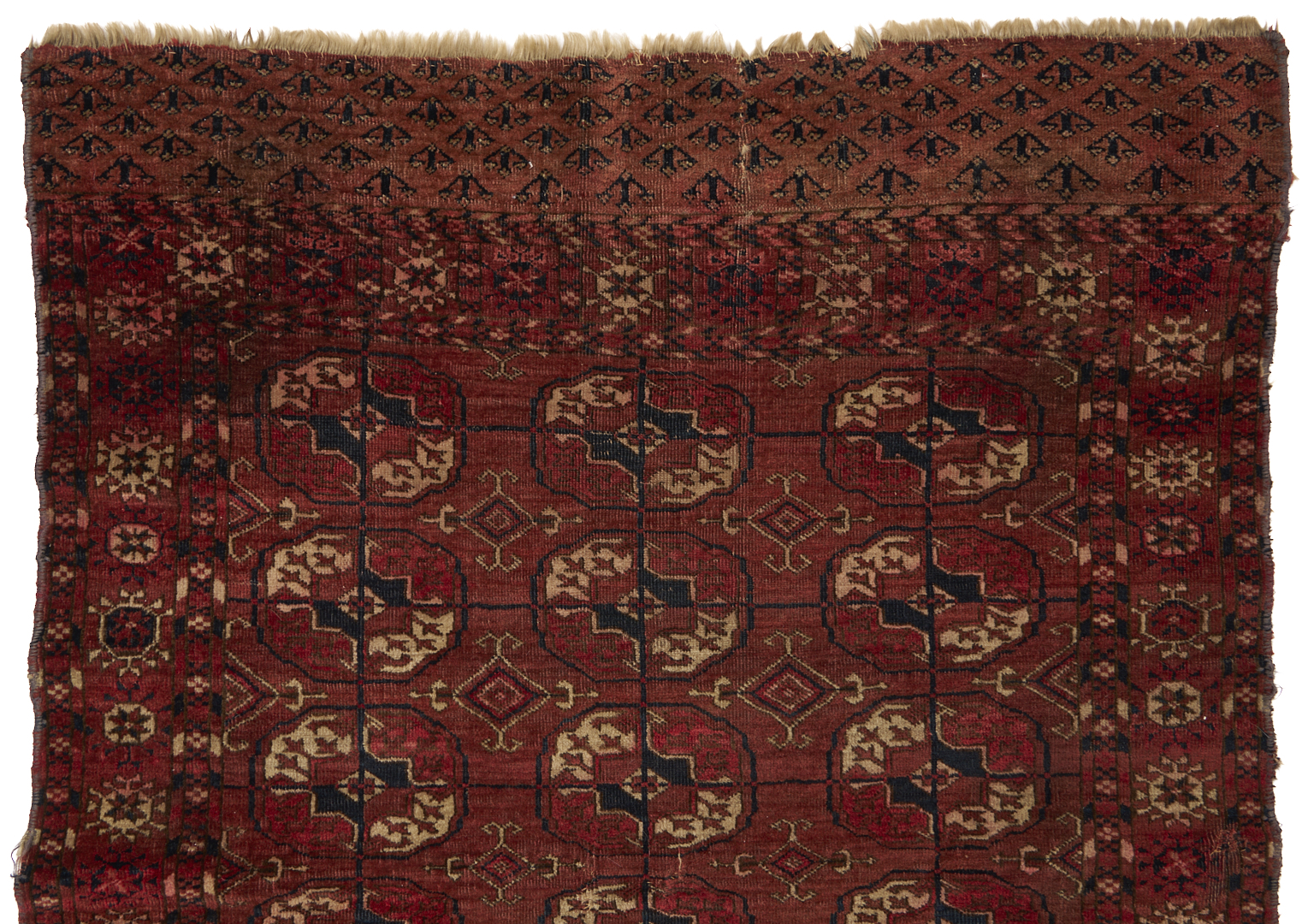 Three (3) antique Tekke Turkmen wool on wool rugs, all wool on wool and woven in traditional designs, including: a Tekke rug with a central gul design and stylized diamond borders, 5 ft 5 in x 3 ft 11 in., circa 1885; a Tekke Ak-Chuval decorated in alternating geometric bands and a wide lower stylized floral border, 4 ft 1 in x 2 ft 4 in., last Qtr. 19th century; and a Tekke floor rug with a central gul design and geometric borders, 3 ft 11 in x 3 ft 2 in., circa 1915.