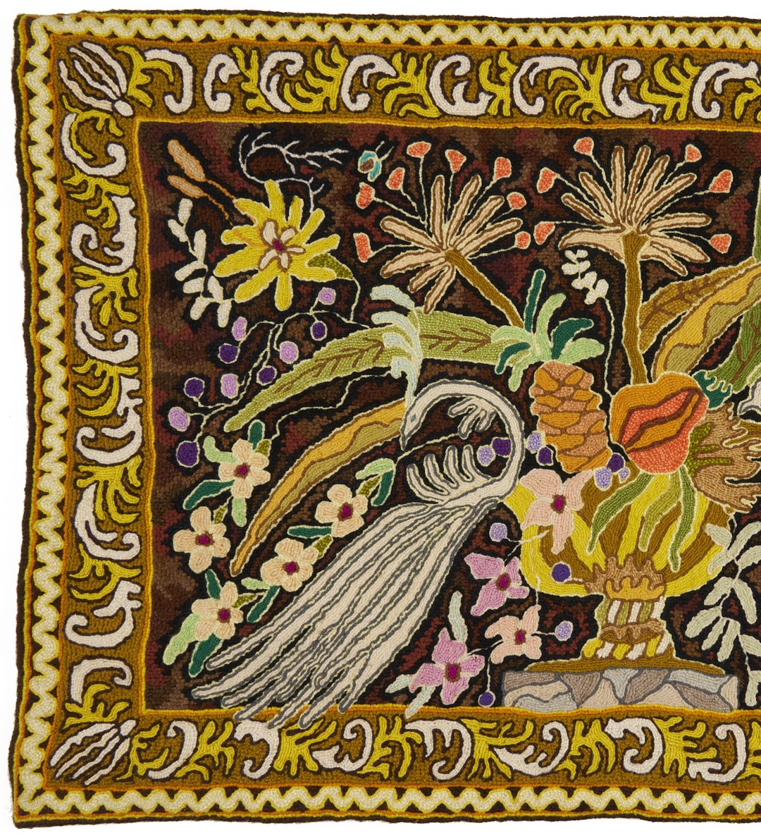 1st item: Concessa Colaco (Brazil/Portugal, b. 1929) loom woven tapestry depicting a flowering urn and two exotic birds, within a decorative foliate border. Stitched signature, “Concessa,” lower right, with additional signature and title, “Encontro,” to reverse. 36 in. W x 25 1/2 in. H. Note: Concessa Colaco is the daughter of Madeleine Colaco, who created the first Brazilian tapestry technique, the “Brazilian Stitch”. Concessa began weaving tapestries in the late 1960s, expanding her mother’s workshop and creating her own distinctive stitch, the “Corrido”, inspired by the 11th century tapestries of Queen Matilda of France. Her work is made from natural wools and silks, never synthetic materials. Her tapestries have been sold to collectors worldwide including Queen Fabiola of Belgium and are part of the decoration of the official residence of the President of Brazil. 2nd item: Mary Ann Pedrosa loom-woven tapestry depicting various leaves, fruits and vegetables. Stitched signature “Mary Ann” lower right. with additional labels en verso. 62 in. W x 44 in. H. Both items third quarter 20th century.