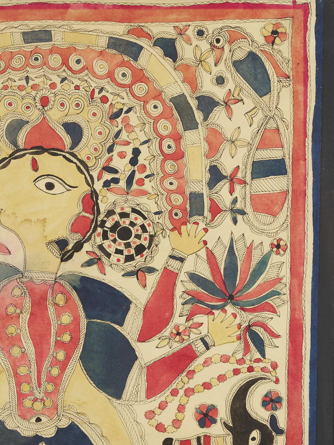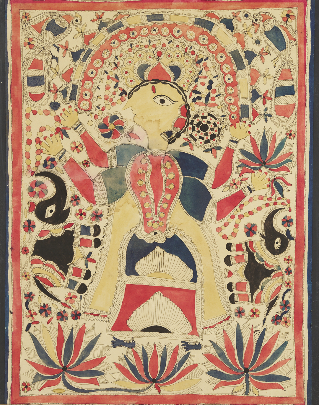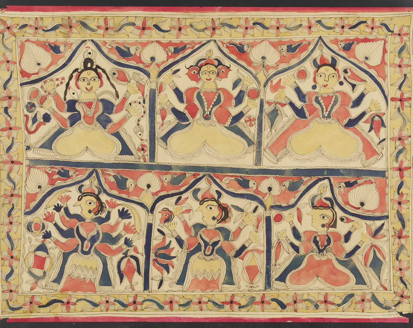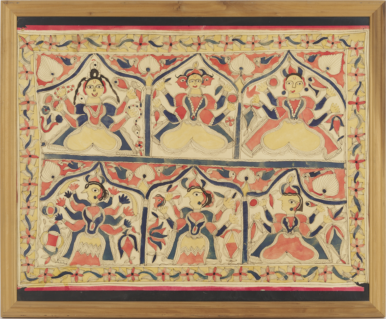 Two (2) Madhubani ink and watercolor folk paintings on paper, both depicting various Hindu deities, including Devi Durga, in various poses with foliate and animal borders. Both are housed in wood frames and mounted onto black grounds. Sight: 22 in. H x 29 in. W, Framed: 26 1/4 in. H x 32 in. W and Sight: 29 1/4 in. H x 20 in. W, Framed: 36 in. H x 30 in. W. 1st half 20th century.