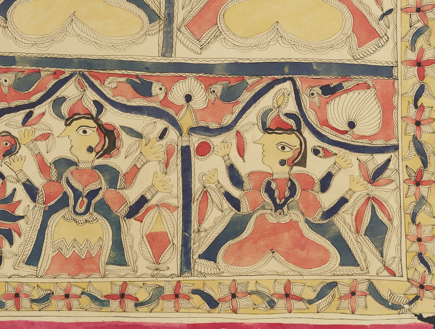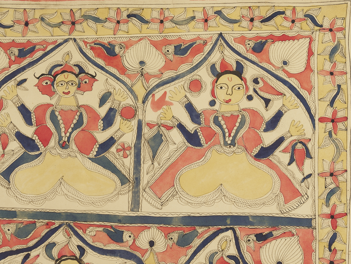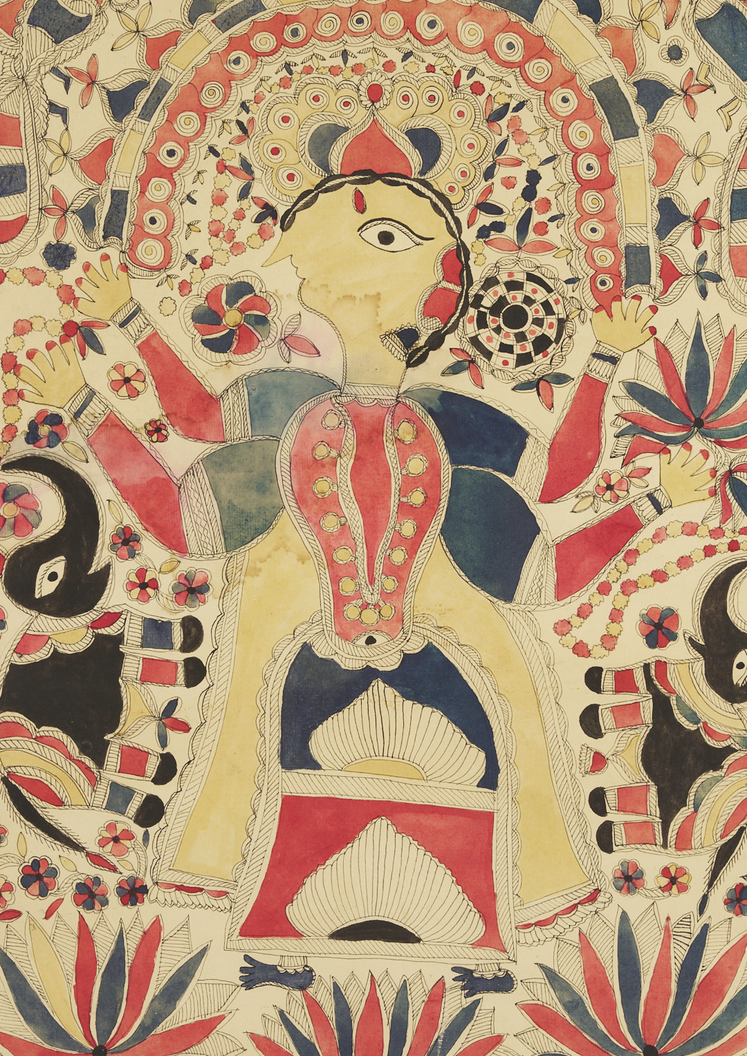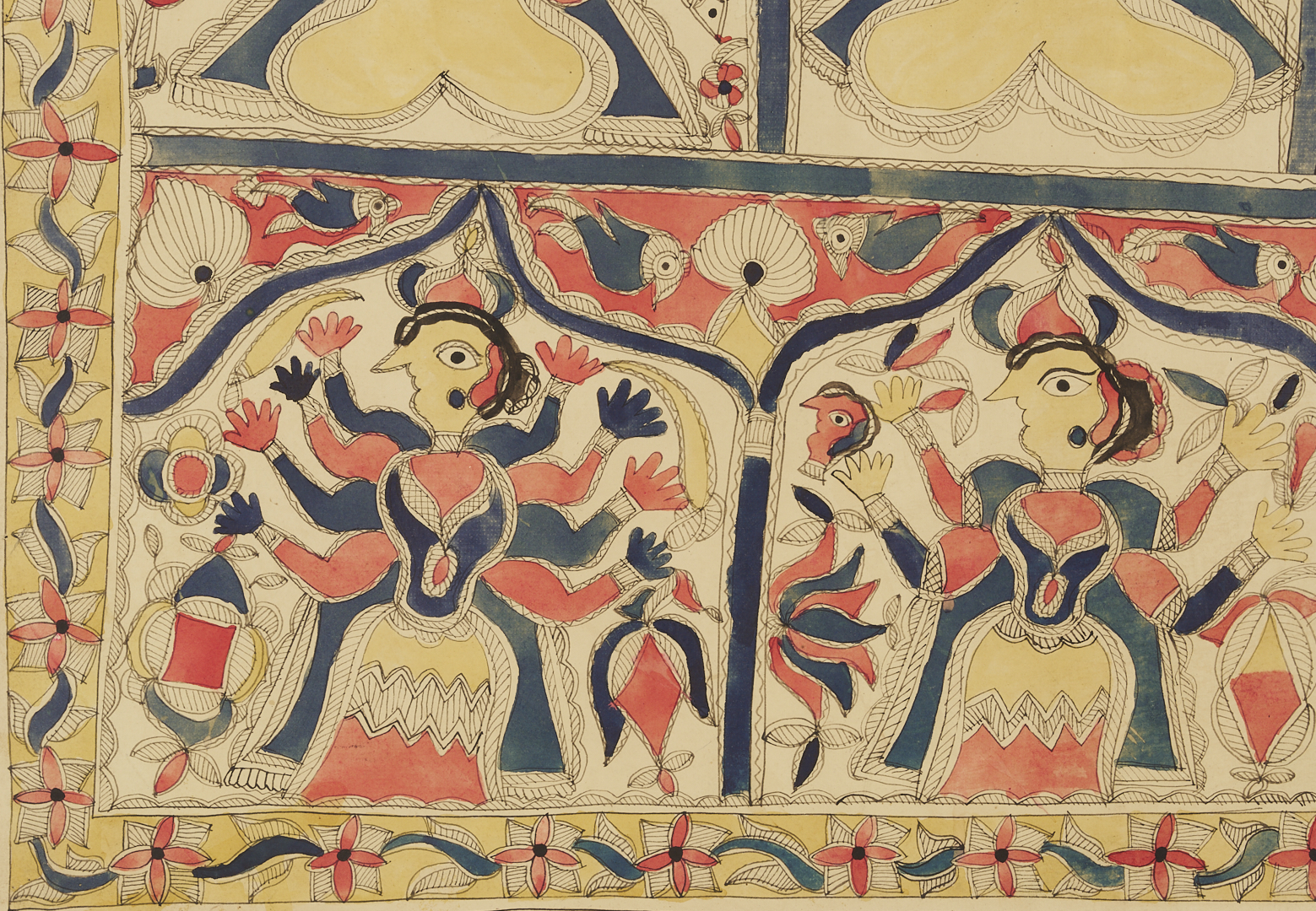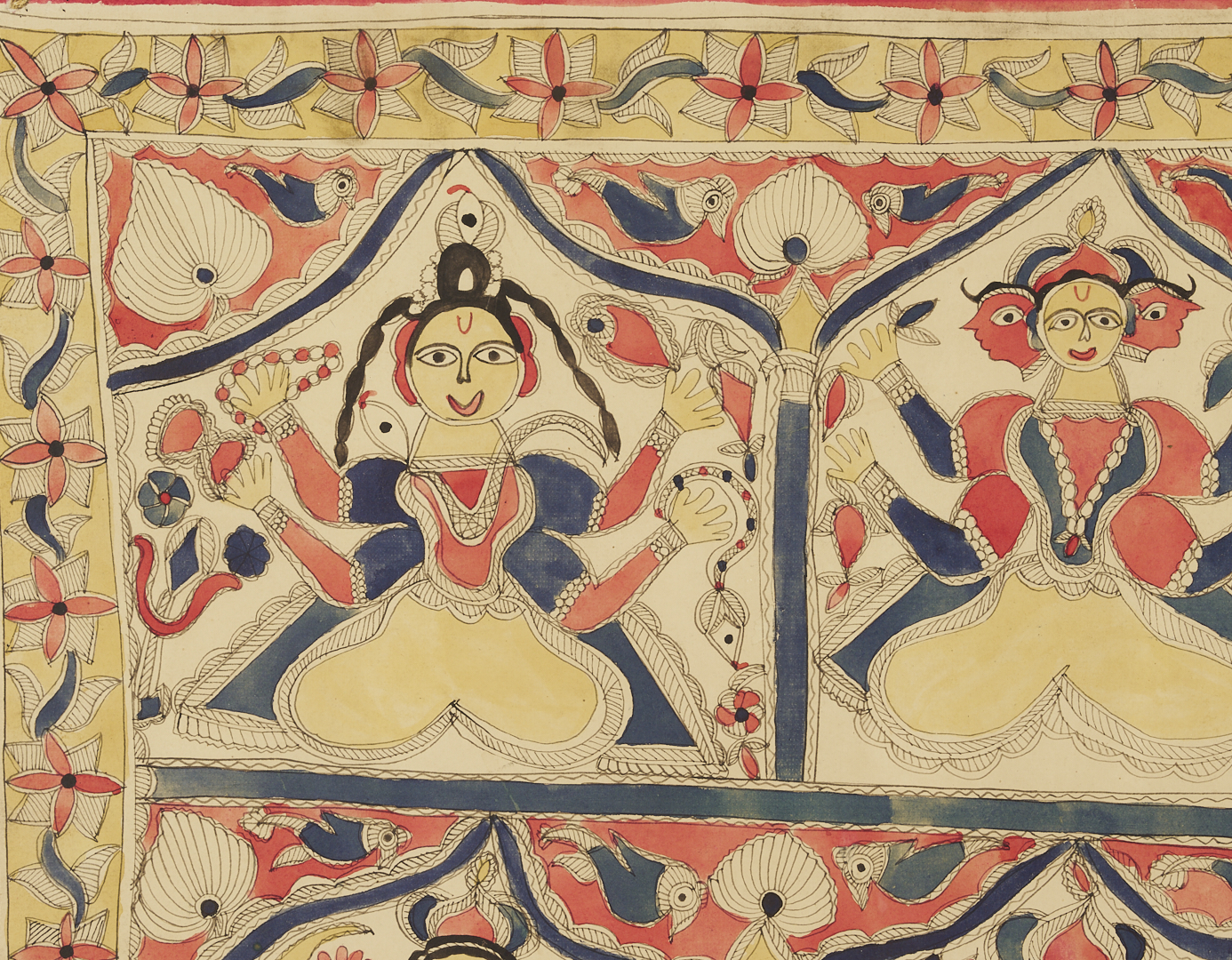 Two (2) Madhubani ink and watercolor folk paintings on paper, both depicting various Hindu deities, including Devi Durga, in various poses with foliate and animal borders. Both are housed in wood frames and mounted onto black grounds. Sight: 22 in. H x 29 in. W, Framed: 26 1/4 in. H x 32 in. W and Sight: 29 1/4 in. H x 20 in. W, Framed: 36 in. H x 30 in. W. 1st half 20th century.