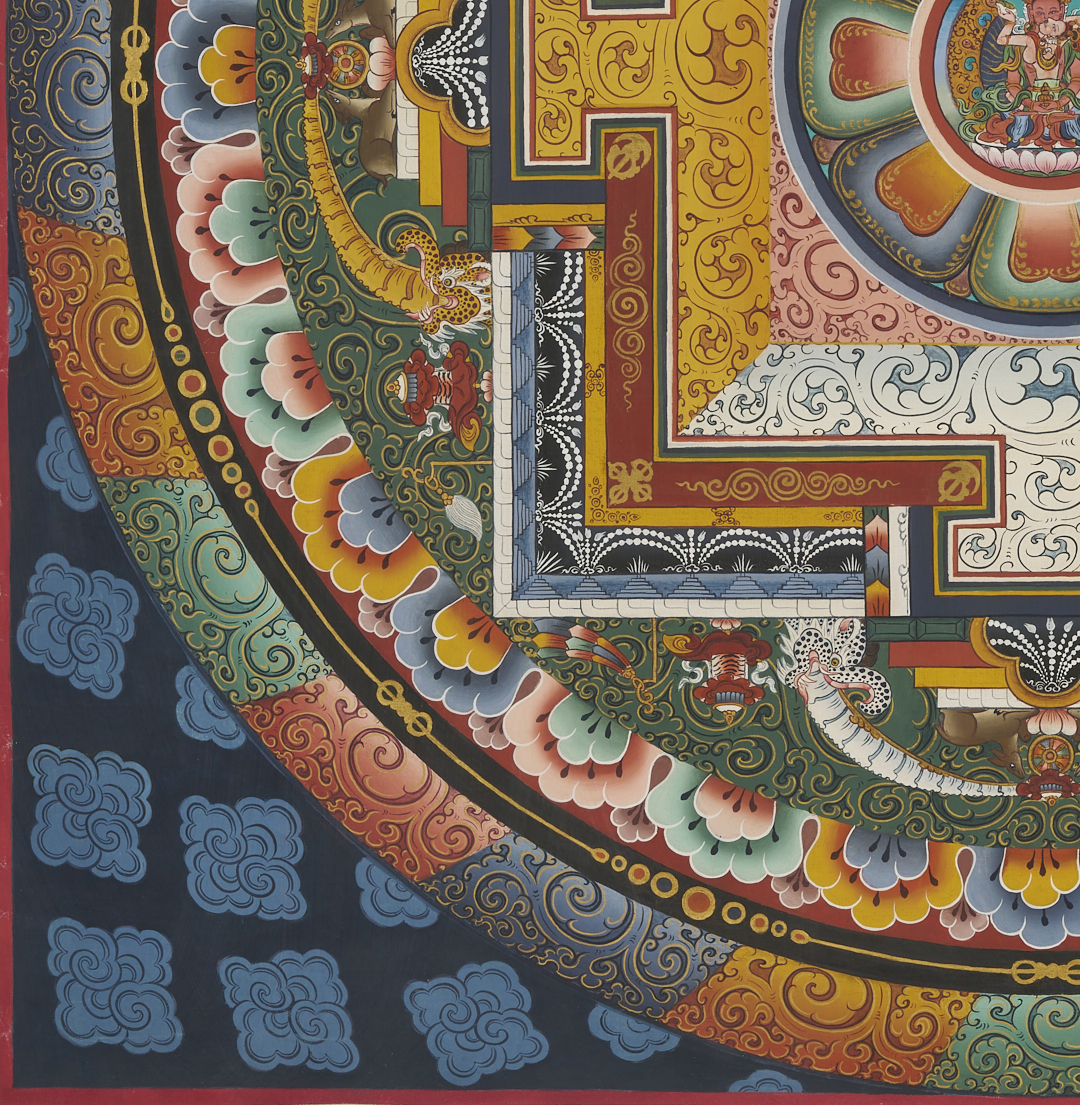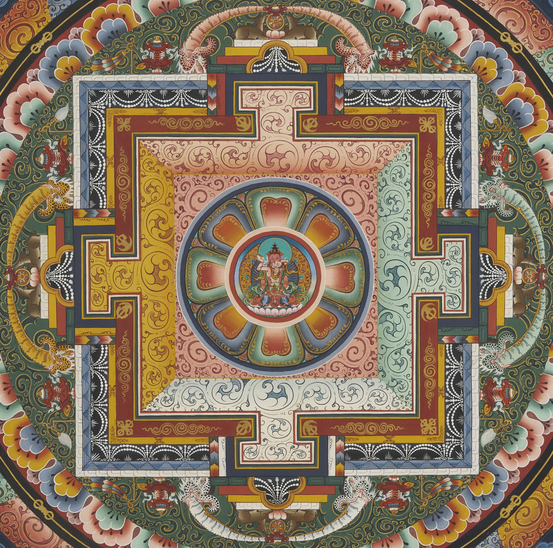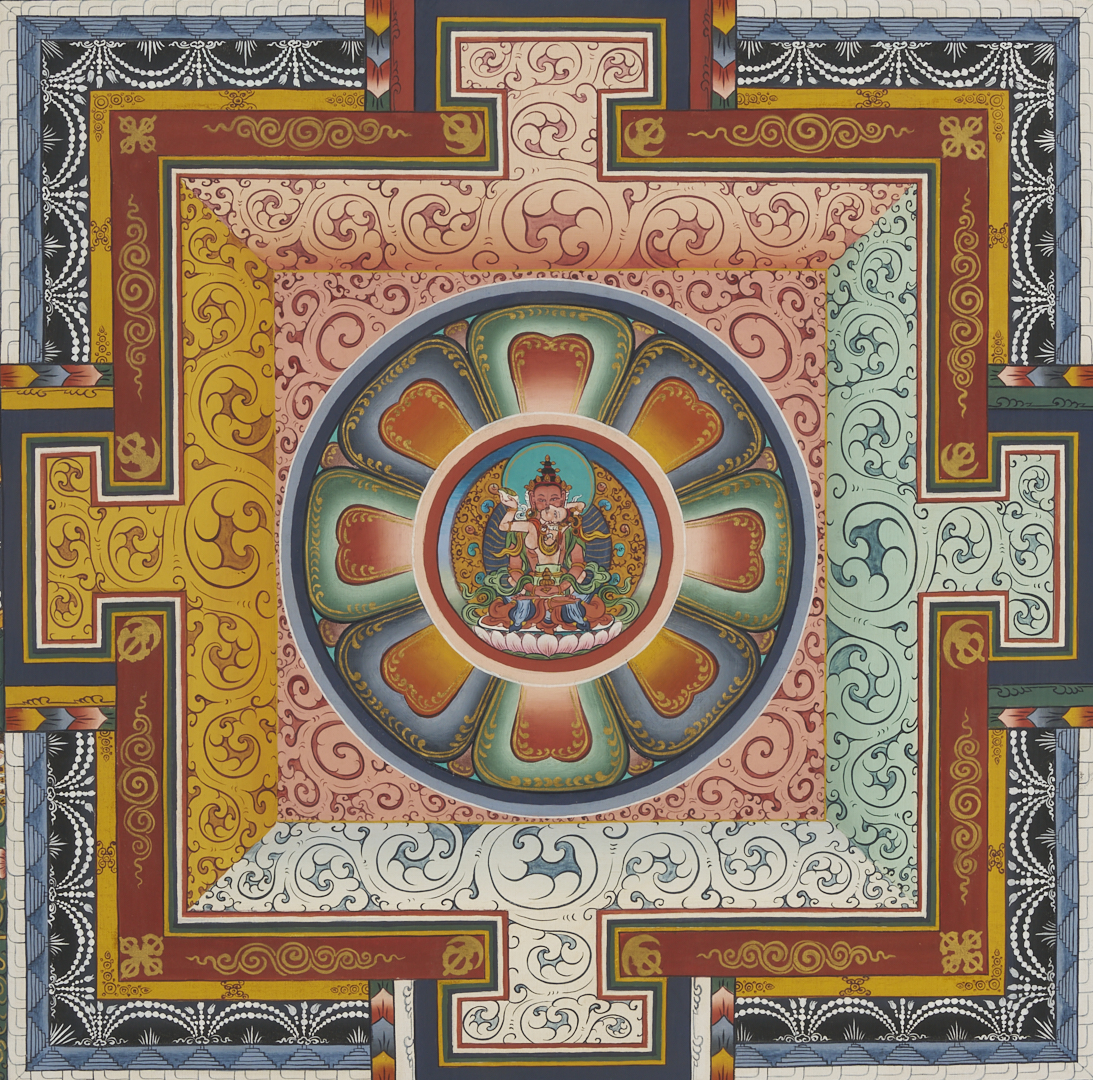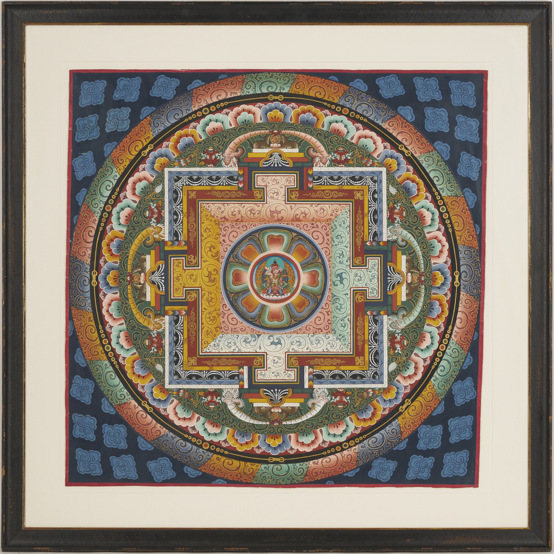 Item 1: Phurba Namgay (Bhutanese, b. 1963) painting on canvas depicting a Tibetan Buddhist Kalachakra or Wheel of Time. Float mounted on a white ground and housed in an ebonized wood frame. Painting: 28 in. sq. Framed: 37 in. sq. Item 2: Tibetan Buddhist thangka with a central figure in a landscape surrounded by vignettes. With Tibetan calligraphy en verso. Floated under glass in a metal frame. Sheet: 29 1/2 in. H x 20 1/2 in. W. Framed: 35 1/2 in. H x 25 1/4 in. W.