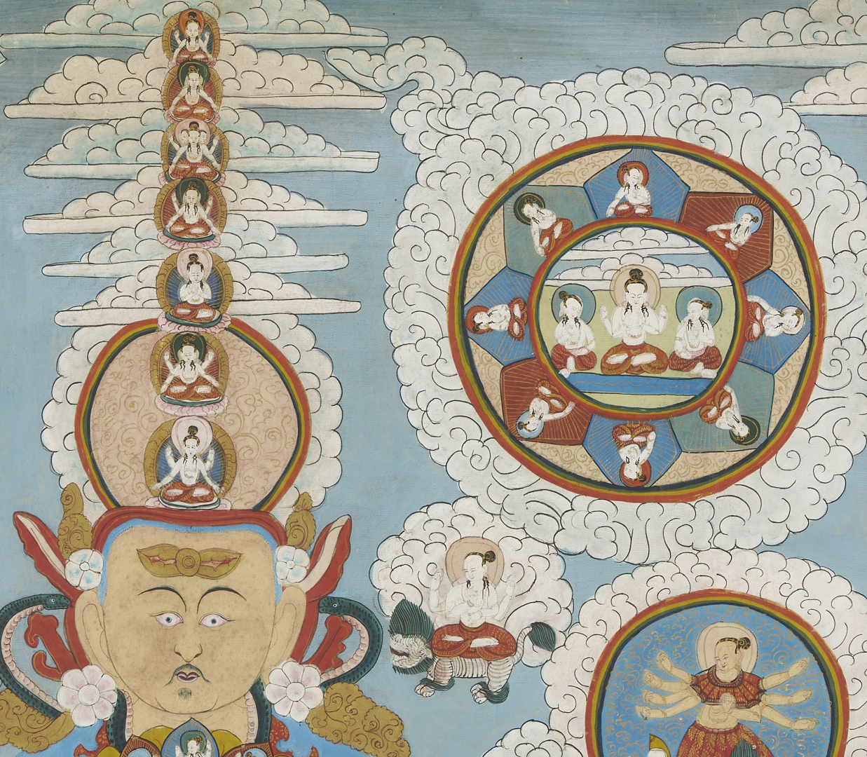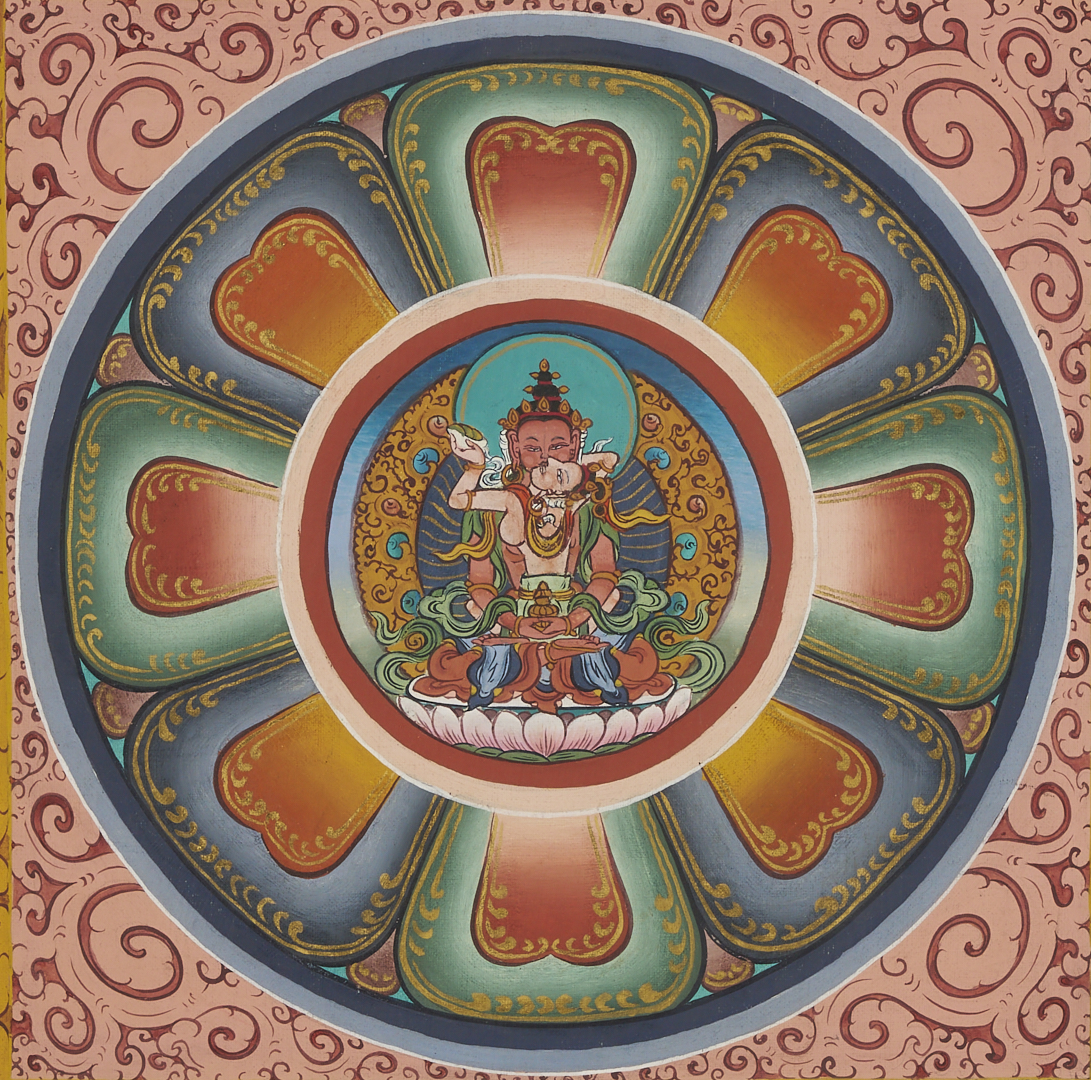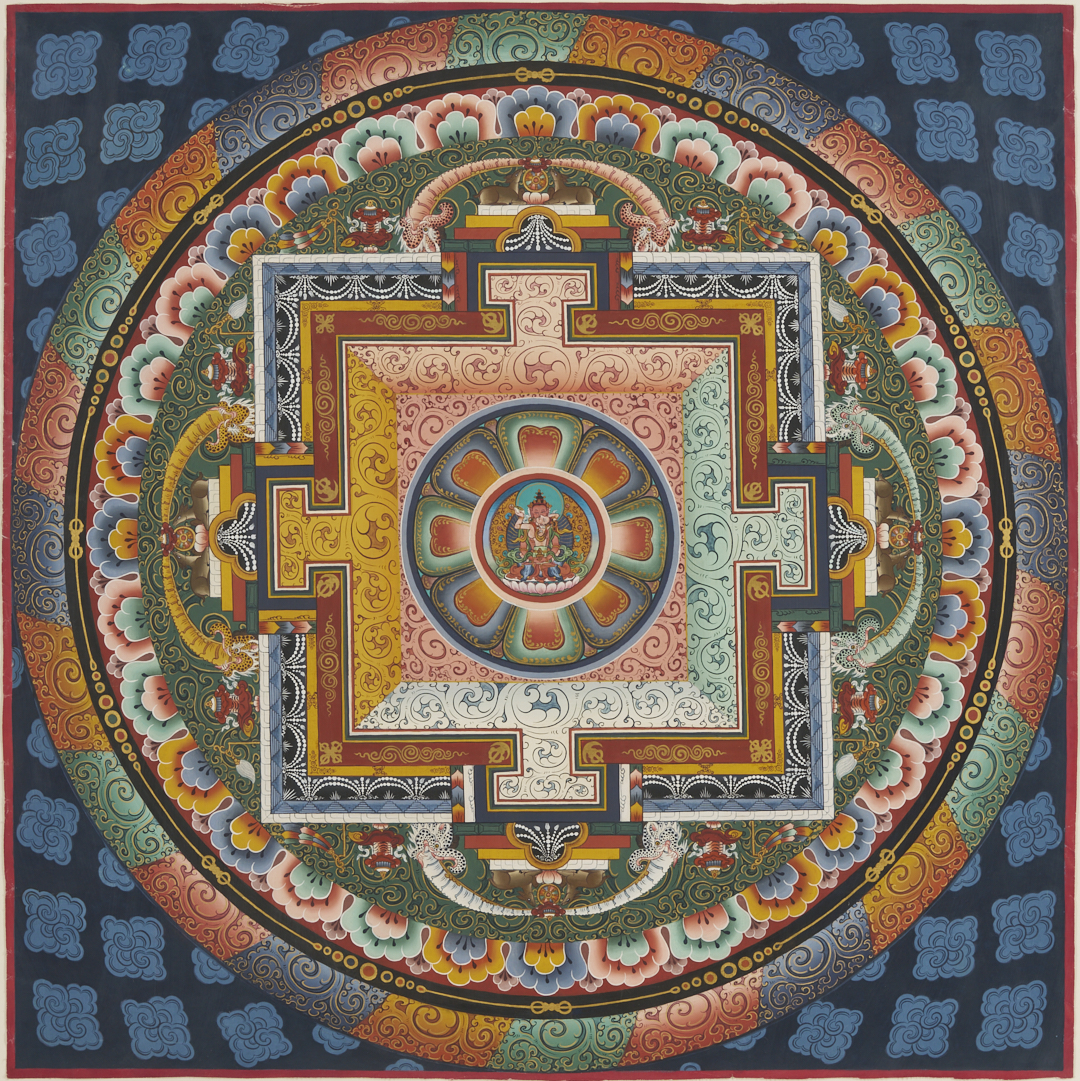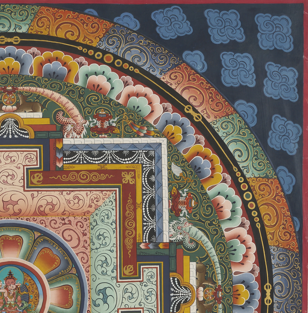 Item 1: Phurba Namgay (Bhutanese, b. 1963) painting on canvas depicting a Tibetan Buddhist Kalachakra or Wheel of Time. Float mounted on a white ground and housed in an ebonized wood frame. Painting: 28 in. sq. Framed: 37 in. sq. Item 2: Tibetan Buddhist thangka with a central figure in a landscape surrounded by vignettes. With Tibetan calligraphy en verso. Floated under glass in a metal frame. Sheet: 29 1/2 in. H x 20 1/2 in. W. Framed: 35 1/2 in. H x 25 1/4 in. W.