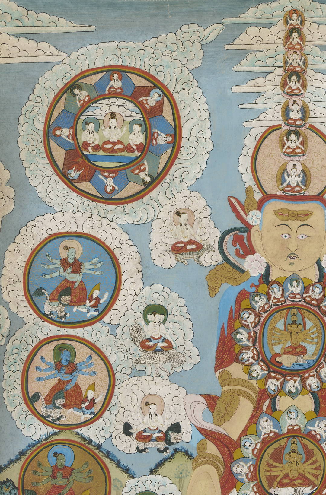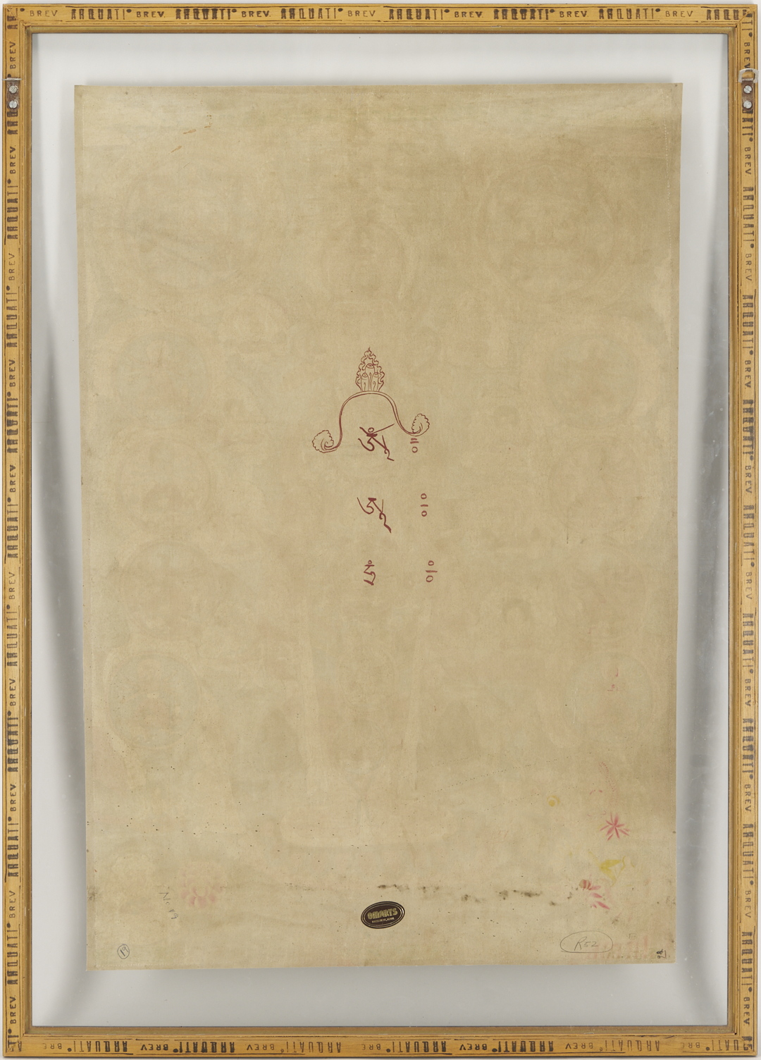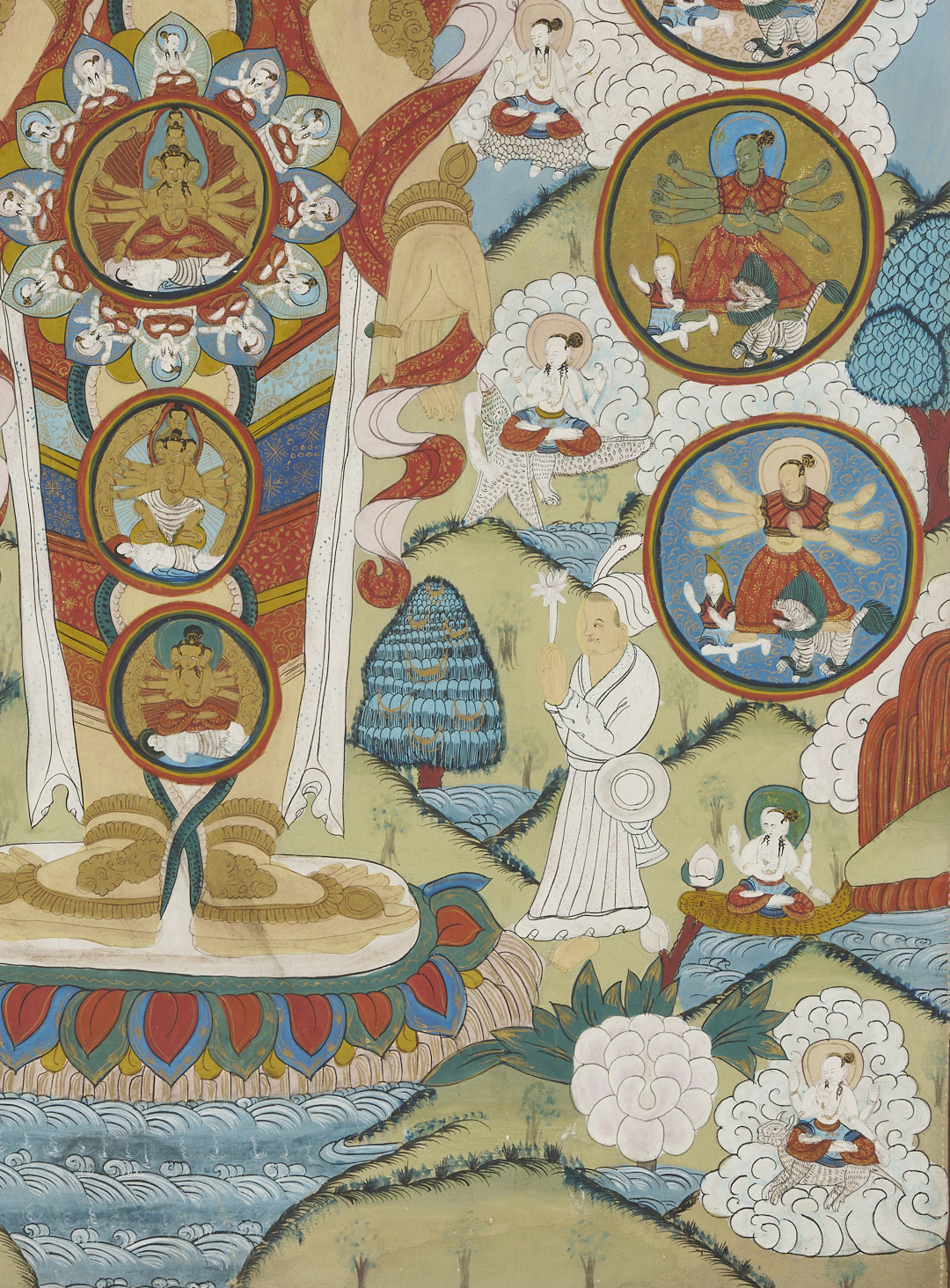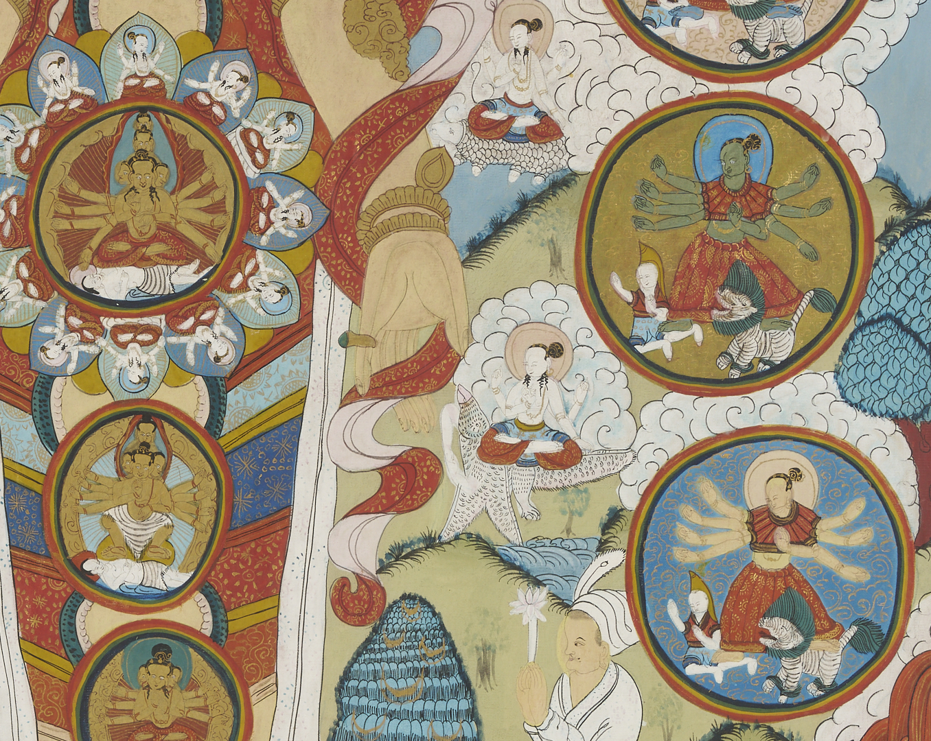 Item 1: Phurba Namgay (Bhutanese, b. 1963) painting on canvas depicting a Tibetan Buddhist Kalachakra or Wheel of Time. Float mounted on a white ground and housed in an ebonized wood frame. Painting: 28 in. sq. Framed: 37 in. sq. Item 2: Tibetan Buddhist thangka with a central figure in a landscape surrounded by vignettes. With Tibetan calligraphy en verso. Floated under glass in a metal frame. Sheet: 29 1/2 in. H x 20 1/2 in. W. Framed: 35 1/2 in. H x 25 1/4 in. W.