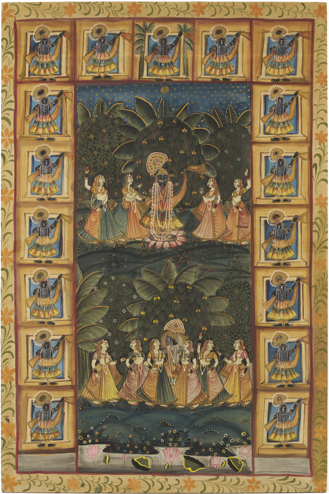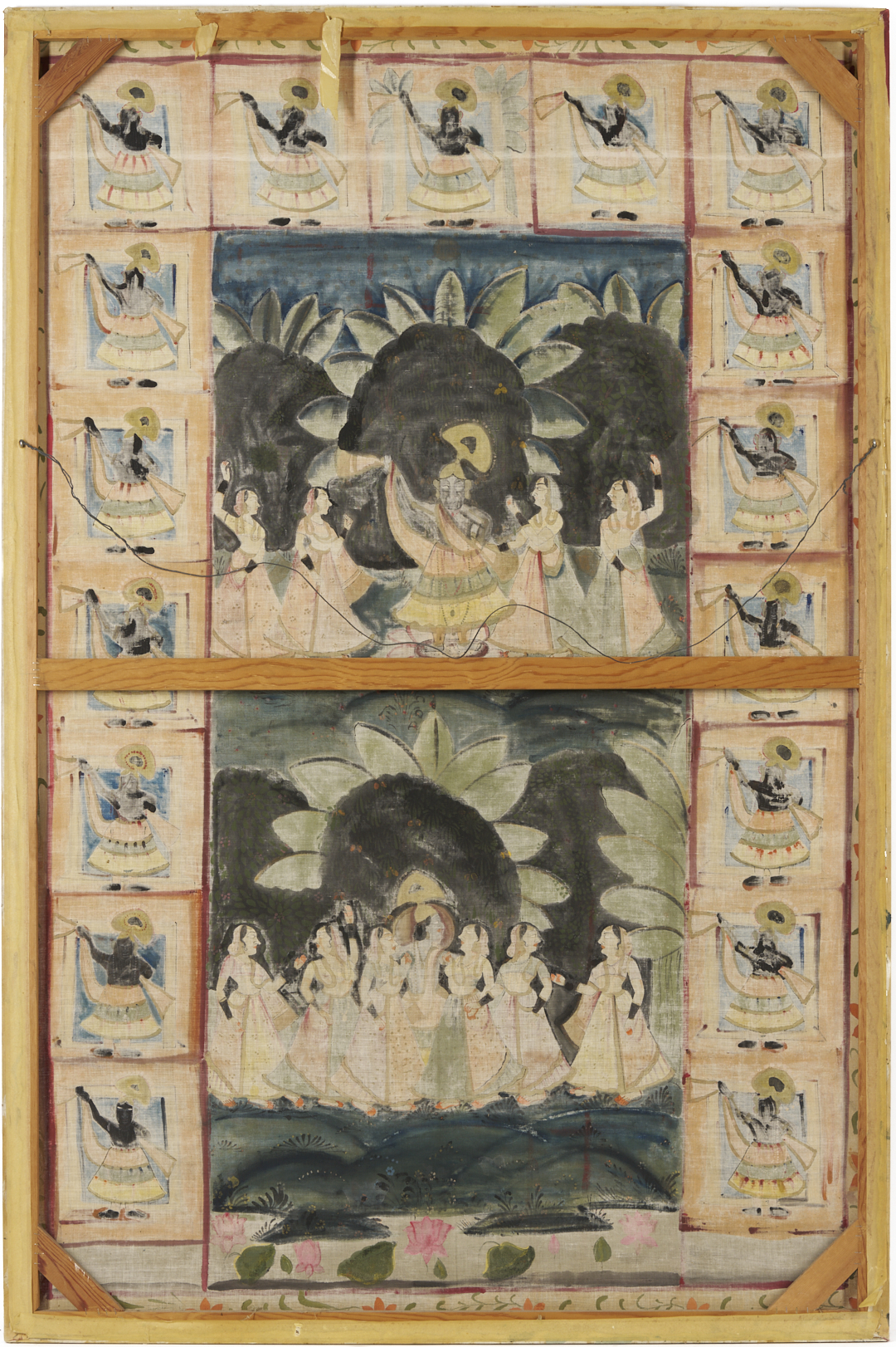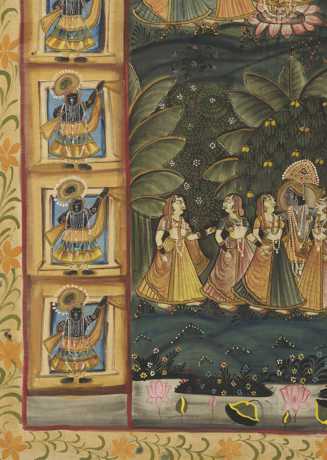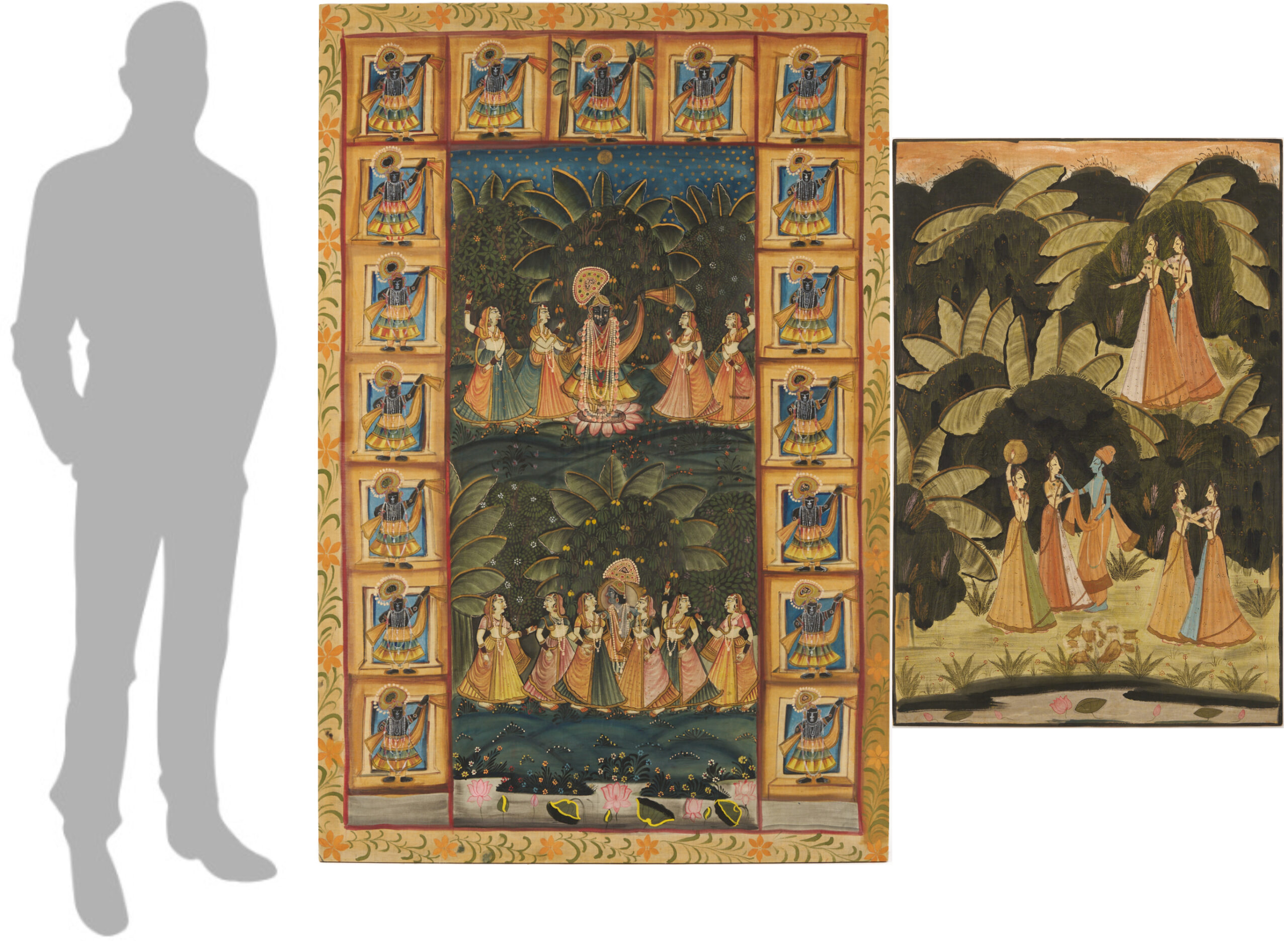 1st item: Large Indian Pichwai painting on fabric, featuring hand-painted scenes of Krishna and dancers in a moonlit wooded setting, bordered by vignettes and floral garlands. Mounted to a later wooden stretcher for display. Painting circa 1900. Unframed. 67 in. H x 44 1/2 In. W. 2nd item: Large, likely Indian, Hindu painting on fabric featuring figures in a wooded landscape. A body of water with flowering lotuses fills the foreground. Unframed, mounted to stretcher. 45 1/2 in. H x 30 1/4 in. W. 20th century.