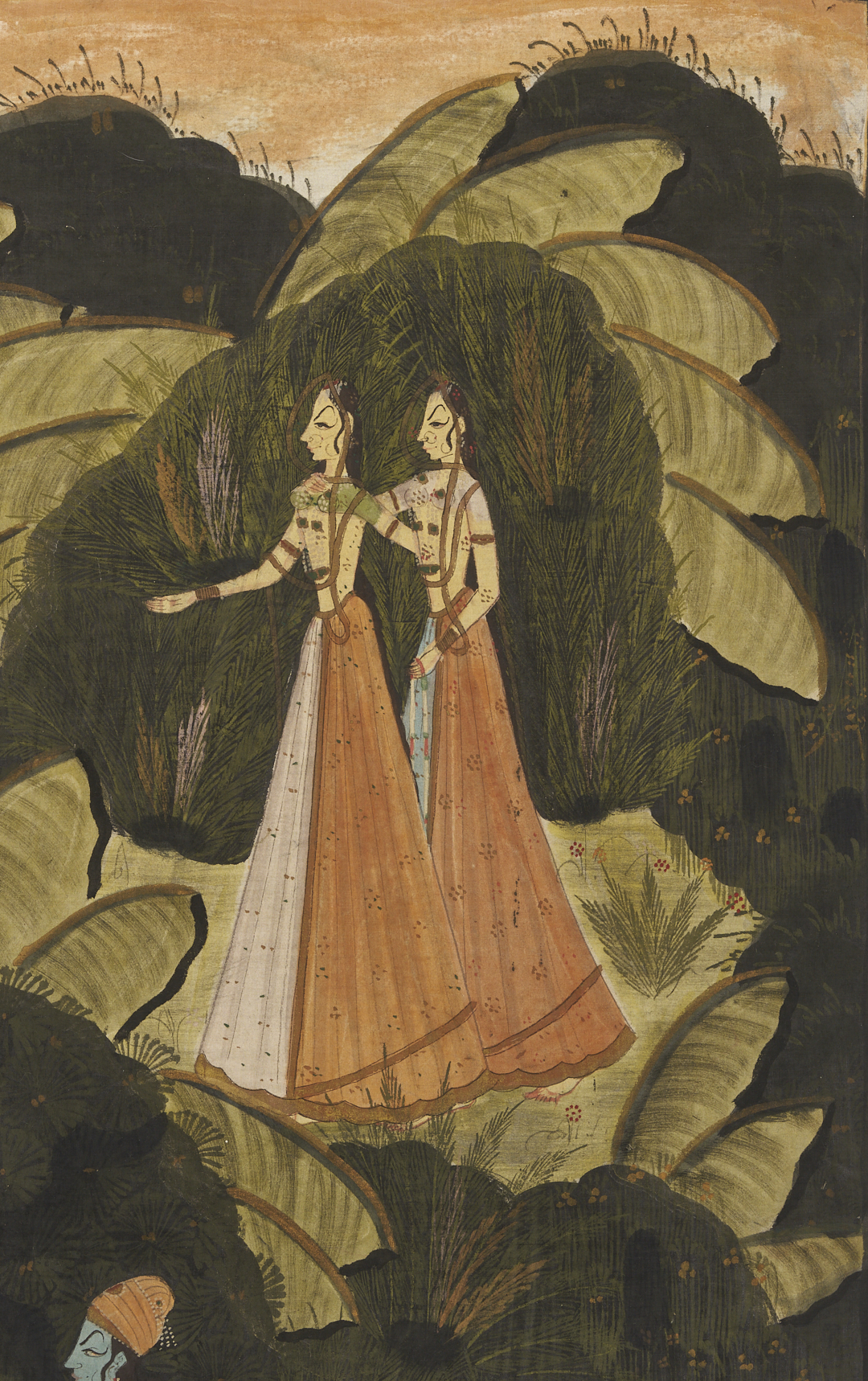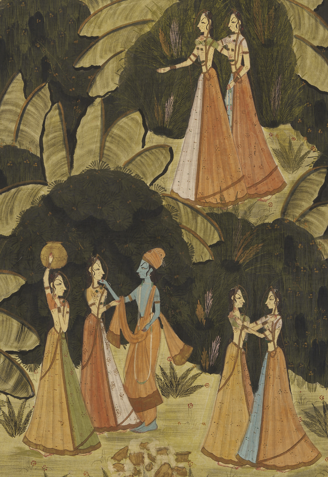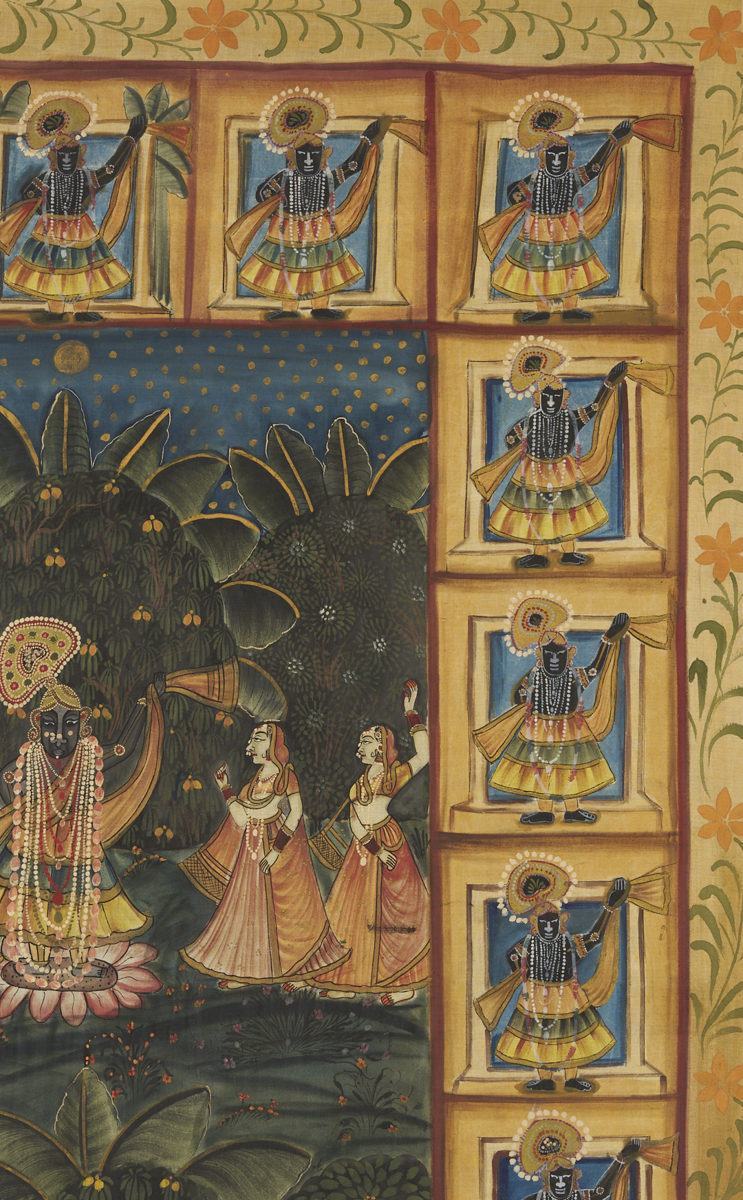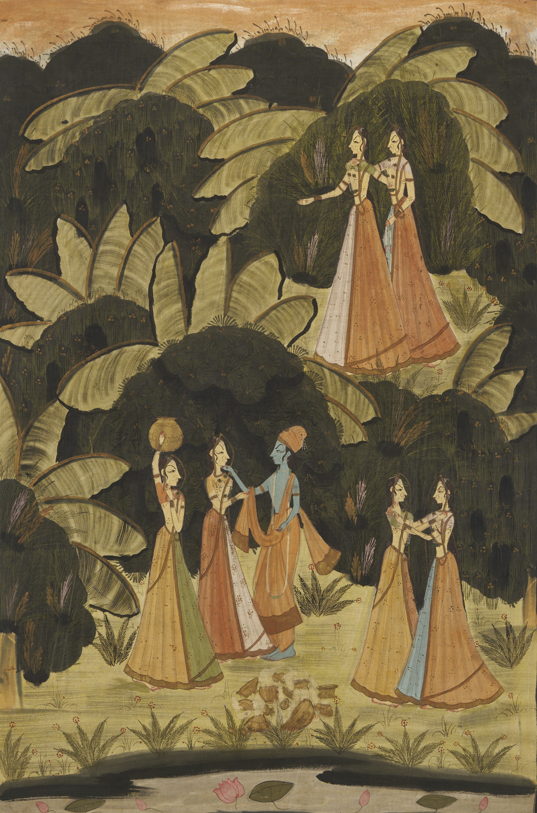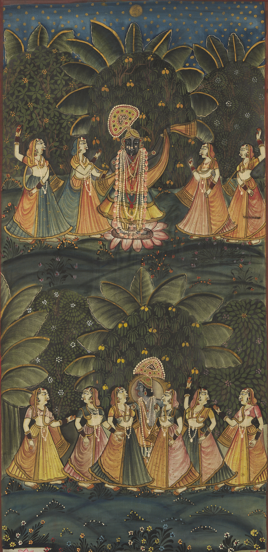 1st item: Large Indian Pichwai painting on fabric, featuring hand-painted scenes of Krishna and dancers in a moonlit wooded setting, bordered by vignettes and floral garlands. Mounted to a later wooden stretcher for display. Painting circa 1900. Unframed. 67 in. H x 44 1/2 In. W. 2nd item: Large, likely Indian, Hindu painting on fabric featuring figures in a wooded landscape. A body of water with flowering lotuses fills the foreground. Unframed, mounted to stretcher. 45 1/2 in. H x 30 1/4 in. W. 20th century.
