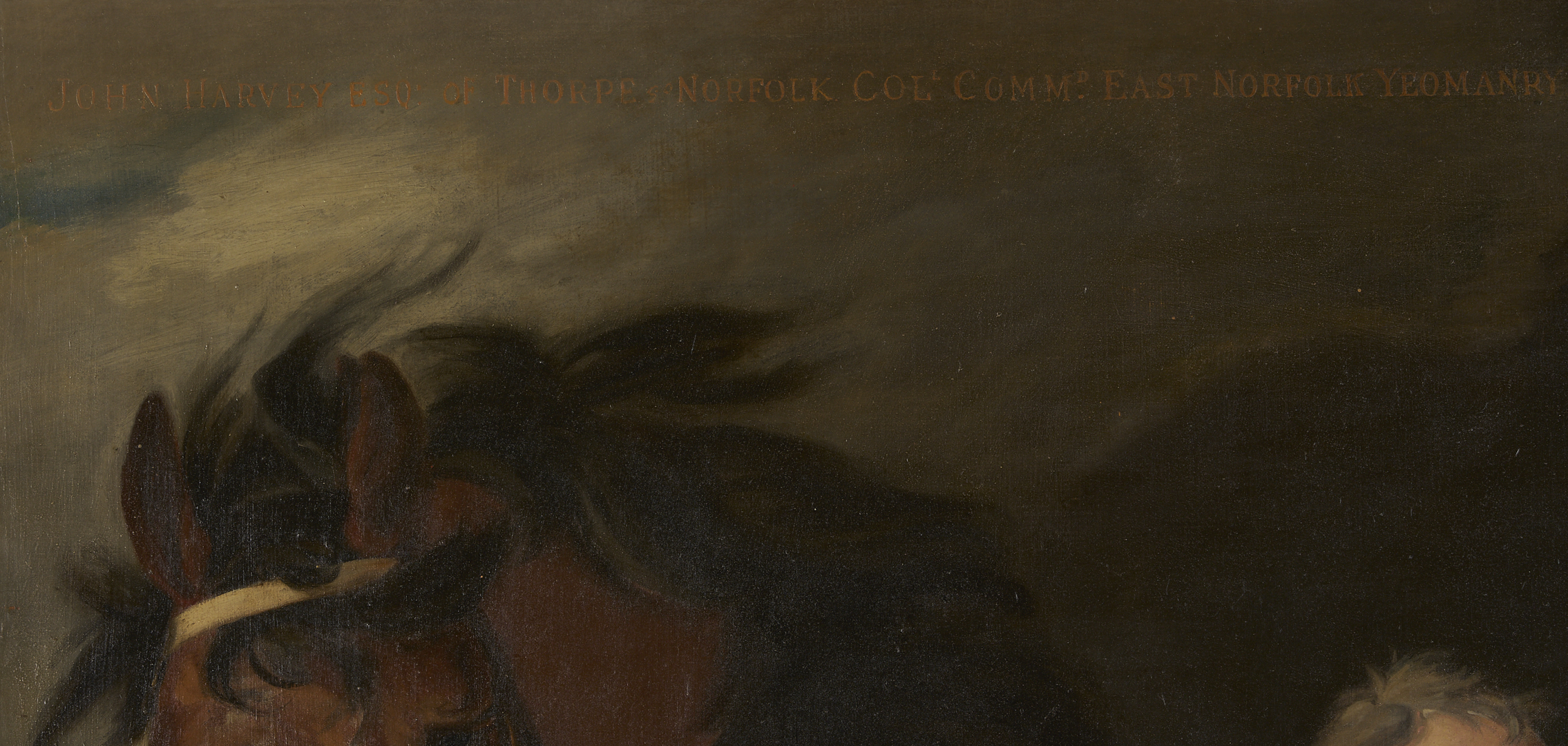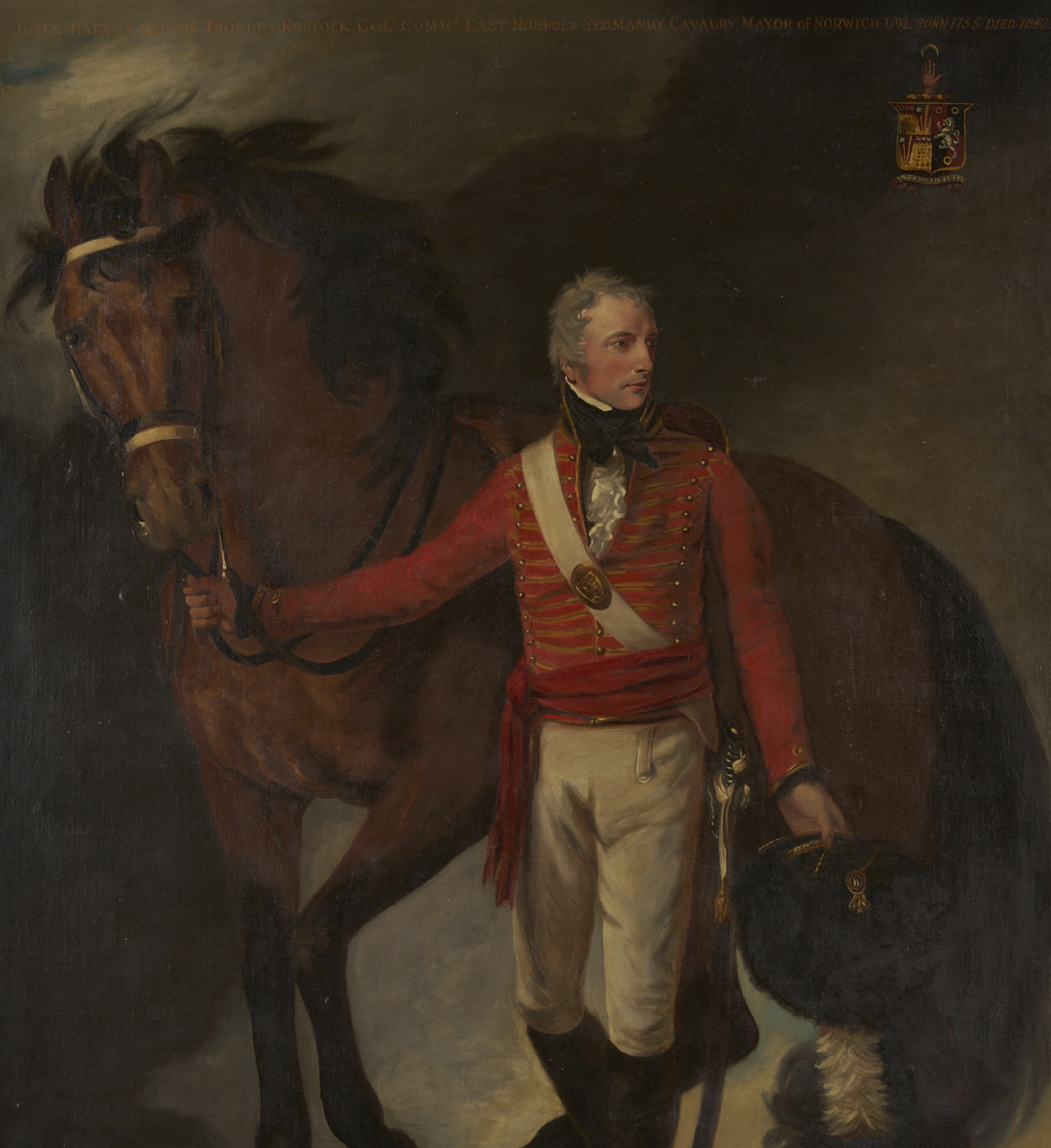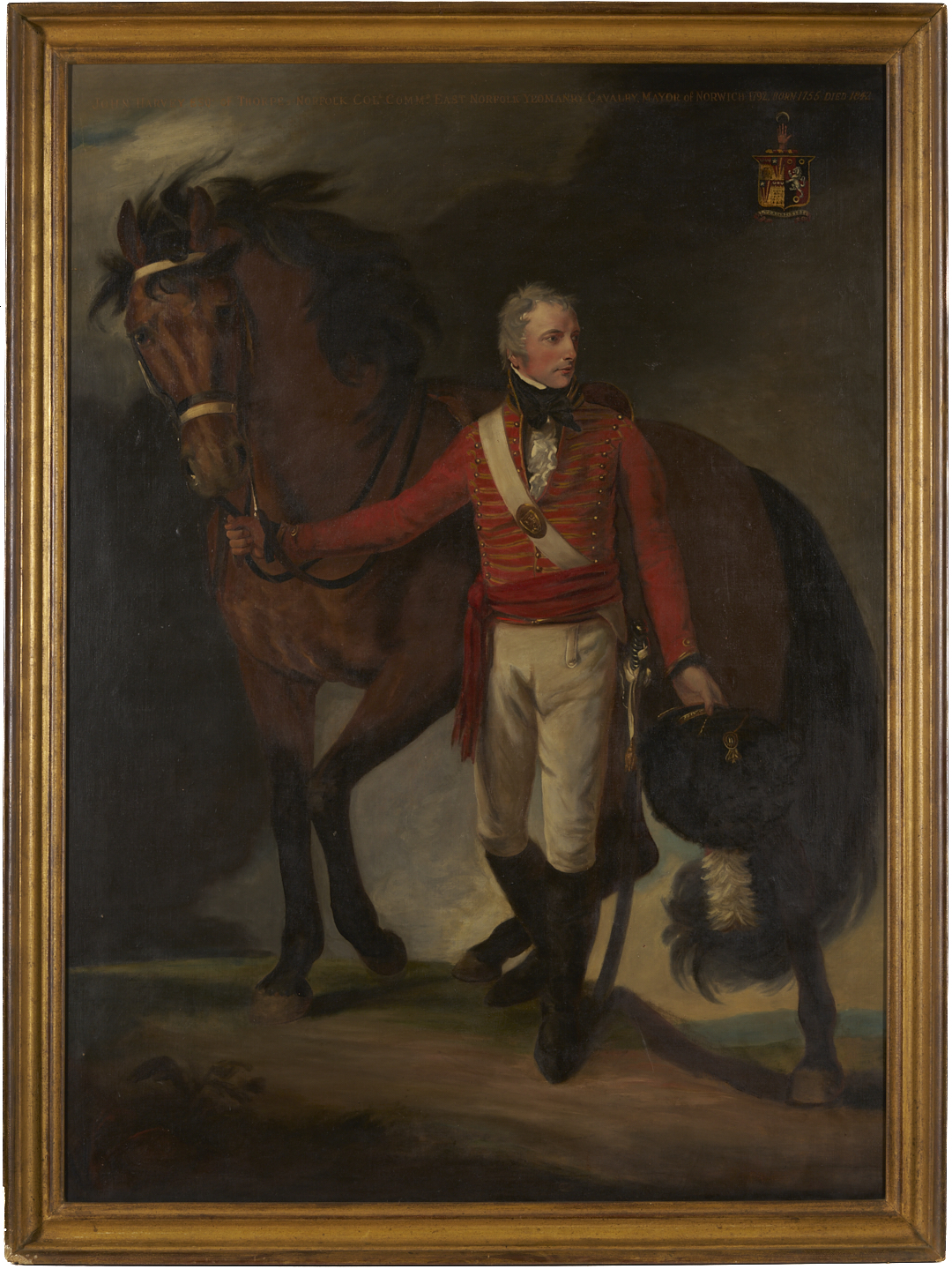 Marianne Harvey (British, 1787-1812) oil on canvas Romantic equestrian portrait of her father, John Harvey (1755–1842), Mayor of Norwich, after John Opie’s (British, 1761-1807) 1792 portrait in the Norwich Civic Portrait Collection, Norwich Castle Museum and Art Gallery, Norwich, England. Harvey stands in full dress uniform in a foggy, windswept landscape and holds the reigns of a large, seal brown horse as he turns to look to the viewer’s right. In his left hand he holds a bearskin cap. Text along the upper edge and above the Harvey family arms and motto, ALTERI. SI. TIBI, reads: “JOHN HARVEY ESQ: OF THORPE co. NORFOLK. COLL COMMD. EAST NORFOLK YEOMANDRY CALVARY. MAYOR of NORWICH 1792. BORN 1755 DIED 1842.” Partial handwritten label en verso reads: “John Harvey Esq. of Thorpe Lodge [illegible] Norwich / born 1755 – died 1842/ Colonel of Norwich Lt. Horse Volunteers/ Mard. Frances Dau. of / Sir Roger Kerrison [illegilble] of Norfolk / had fifteen children / Copied by his dau. Maria[anne?]…” “Additional partial label to stretcher reads “H/K…son Harvey,” plus W. A. Smith, London (1871-1888) framemaker’s label to stretcher. Housed in a painted and giltwood frame. Sight: 54 in. H x 39 in. W. Framed: 59 1/2 in. H x 44 1/4 in. W. Note: As the label en verso attributes this portrait to John Harvey’s daughter Marianne, who died in 1812, the text with Harvey’s 1842 death date must have been added later by another hand. A circa 1807 painting of a pike from the collection of Rainthorpe Hall, Norfolk, attributed to Marianne, was sold in Bonhams’ 2004 “The Contents of the Old Rectory, Banningham, Norfolk” sale. Historical Note: “Like many in his family, John [Harvey] was a textile merchant. He was responsible for the introduction of one of Norwich’s best known ‘exports’, the Norwich Shawl. He was a philanthropist and, when employment decreased and the price of bread increased, he, along with The Rev Gee Smyth, started a subscription to supply provisions and coals to the poor at greatly reduced prices. He revived horse racing on Mousehold Heath and started the ‘Thorpe Water frolic’ which is depicted in a painting by Joseph Stannard…In 1779 he bought Thorpe Lodge, was Mayor in 1792 & High Sheriff in 1842.” (Source: Norwich Heritage Projects)