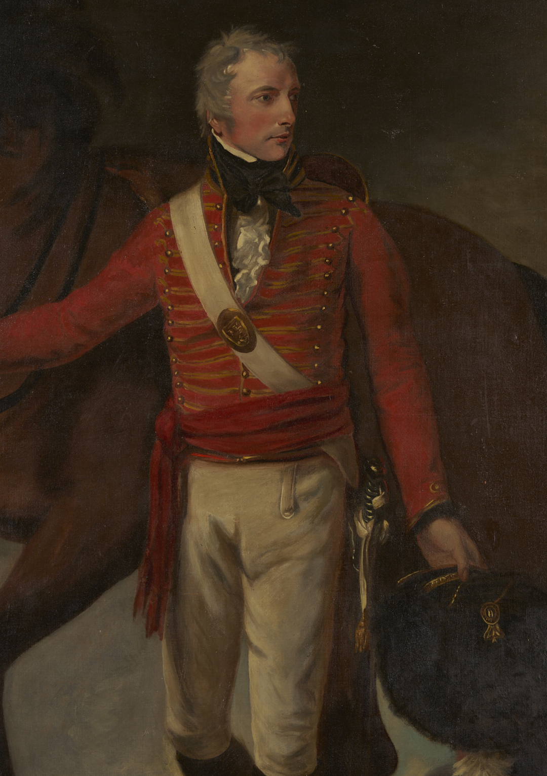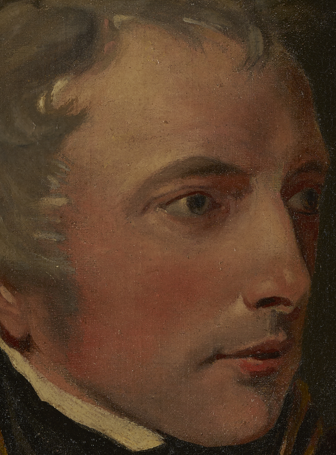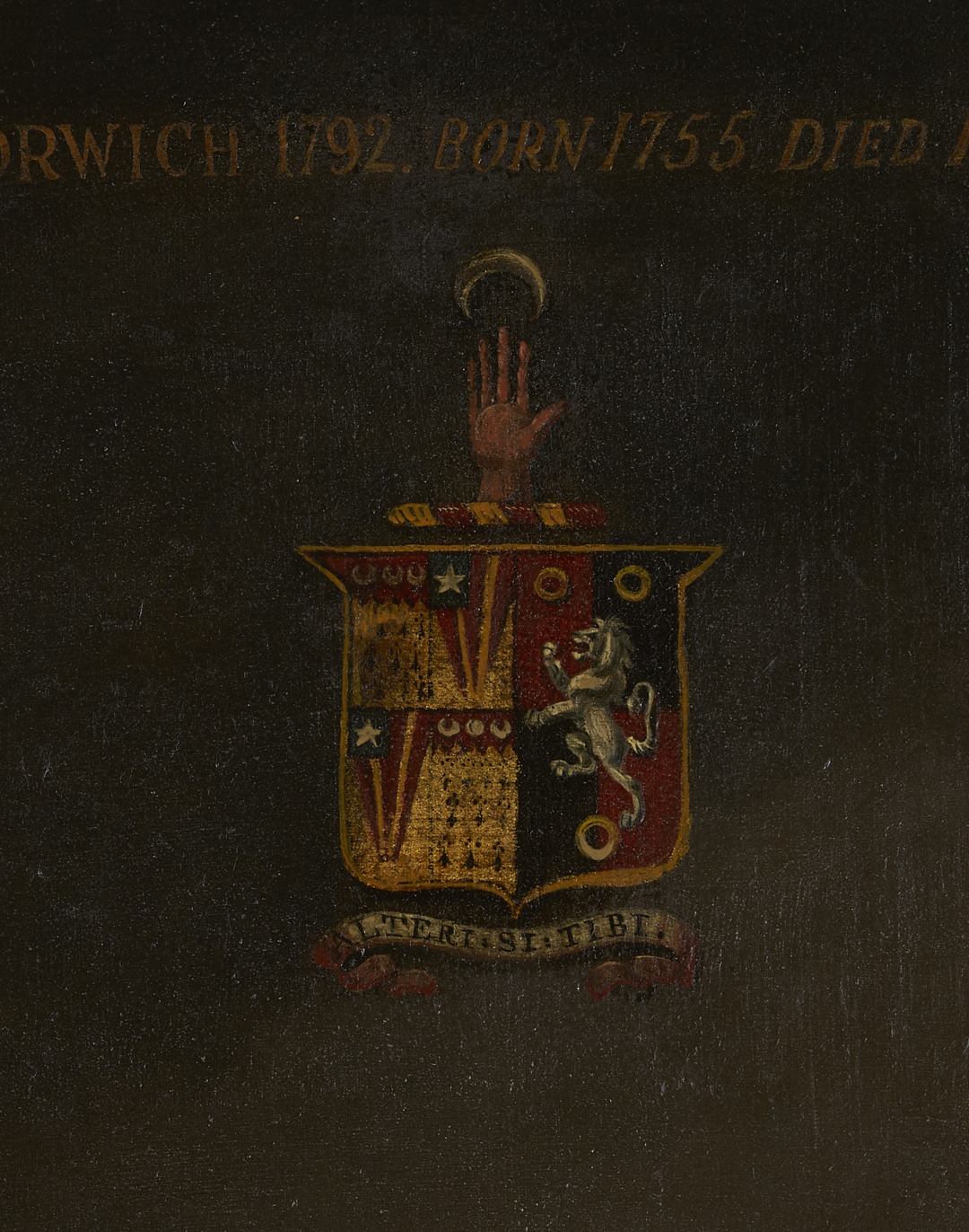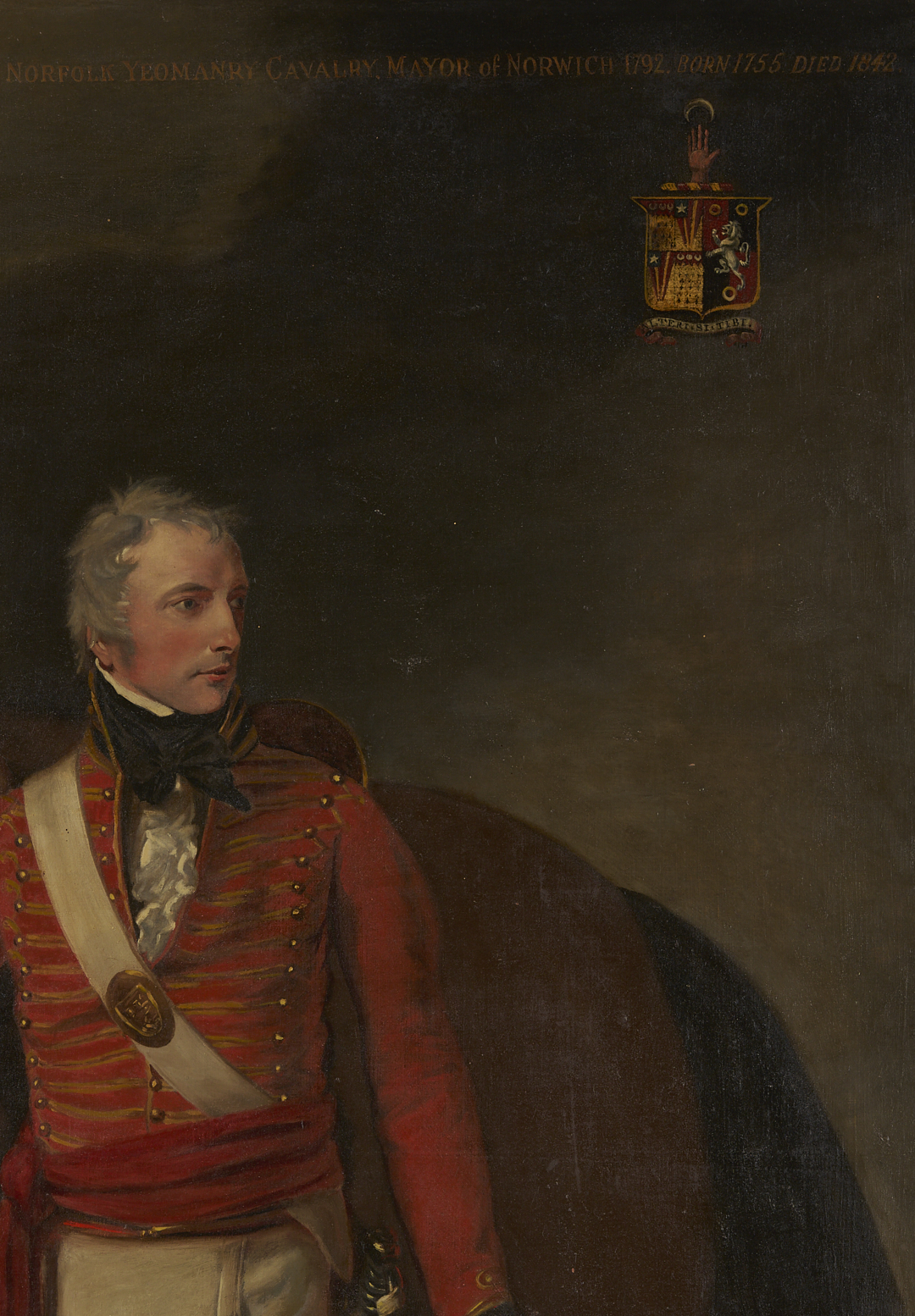 Marianne Harvey (British, 1787-1812) oil on canvas Romantic equestrian portrait of her father, John Harvey (1755–1842), Mayor of Norwich, after John Opie’s (British, 1761-1807) 1792 portrait in the Norwich Civic Portrait Collection, Norwich Castle Museum and Art Gallery, Norwich, England. Harvey stands in full dress uniform in a foggy, windswept landscape and holds the reigns of a large, seal brown horse as he turns to look to the viewer’s right. In his left hand he holds a bearskin cap. Text along the upper edge and above the Harvey family arms and motto, ALTERI. SI. TIBI, reads: “JOHN HARVEY ESQ: OF THORPE co. NORFOLK. COLL COMMD. EAST NORFOLK YEOMANDRY CALVARY. MAYOR of NORWICH 1792. BORN 1755 DIED 1842.” Partial handwritten label en verso reads: “John Harvey Esq. of Thorpe Lodge [illegible] Norwich / born 1755 – died 1842/ Colonel of Norwich Lt. Horse Volunteers/ Mard. Frances Dau. of / Sir Roger Kerrison [illegilble] of Norfolk / had fifteen children / Copied by his dau. Maria[anne?]…” “Additional partial label to stretcher reads “H/K…son Harvey,” plus W. A. Smith, London (1871-1888) framemaker’s label to stretcher. Housed in a painted and giltwood frame. Sight: 54 in. H x 39 in. W. Framed: 59 1/2 in. H x 44 1/4 in. W. Note: As the label en verso attributes this portrait to John Harvey’s daughter Marianne, who died in 1812, the text with Harvey’s 1842 death date must have been added later by another hand. A circa 1807 painting of a pike from the collection of Rainthorpe Hall, Norfolk, attributed to Marianne, was sold in Bonhams’ 2004 “The Contents of the Old Rectory, Banningham, Norfolk” sale. Historical Note: “Like many in his family, John [Harvey] was a textile merchant. He was responsible for the introduction of one of Norwich’s best known ‘exports’, the Norwich Shawl. He was a philanthropist and, when employment decreased and the price of bread increased, he, along with The Rev Gee Smyth, started a subscription to supply provisions and coals to the poor at greatly reduced prices. He revived horse racing on Mousehold Heath and started the ‘Thorpe Water frolic’ which is depicted in a painting by Joseph Stannard…In 1779 he bought Thorpe Lodge, was Mayor in 1792 & High Sheriff in 1842.” (Source: Norwich Heritage Projects)