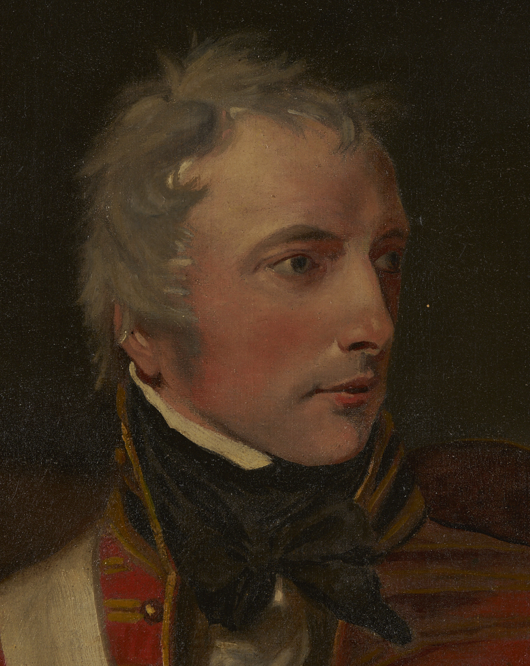 CONDITION: Overall very good condition. With pinpoint punctures to sky at lower right, between hat and saber, and to ground at lower left, where a nail has been driven through the back of the stretcher. Negligible horizontal abrasion with loss to pigment layer in sky along upper left edge, 3/4 inch long. Minor accretion to horse’s lower front left leg, 3/16 inch long. Some negligible, scattered specks of pigment, primarily white, throughout.