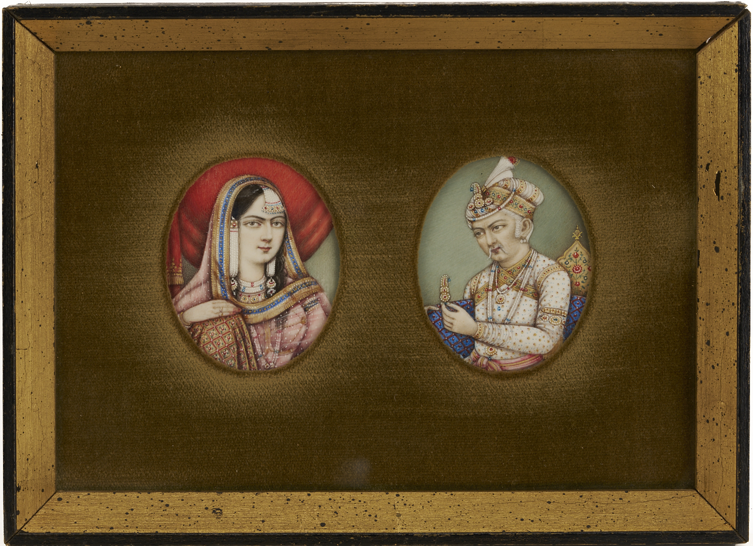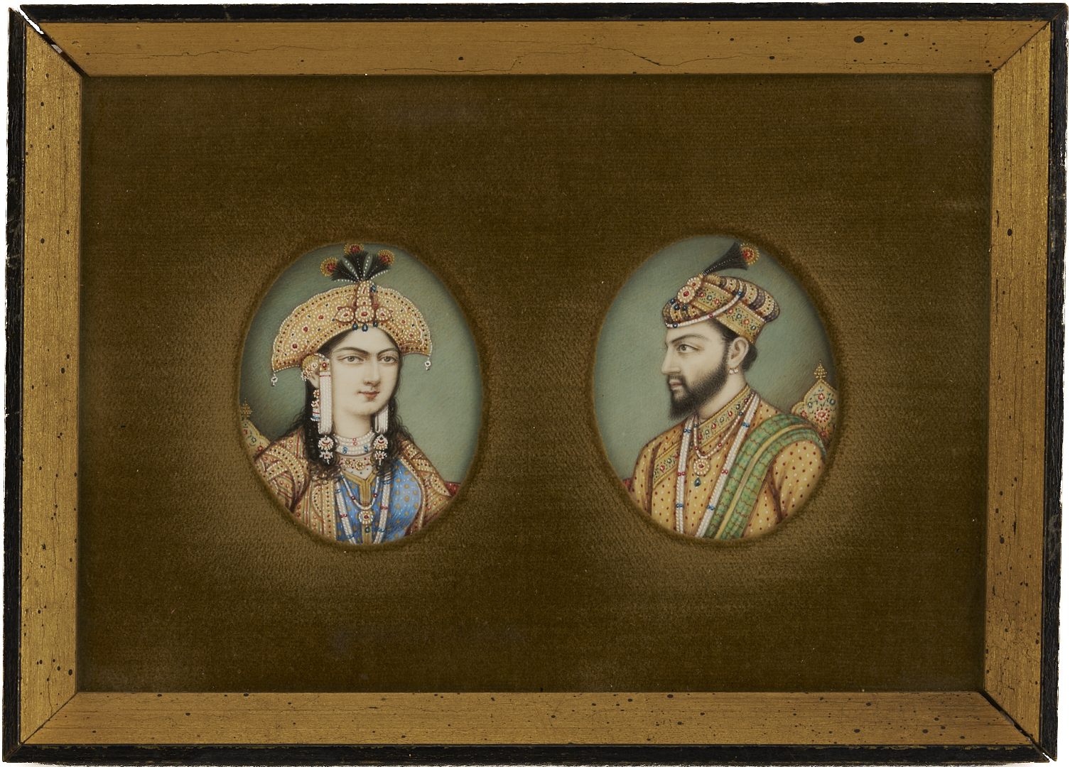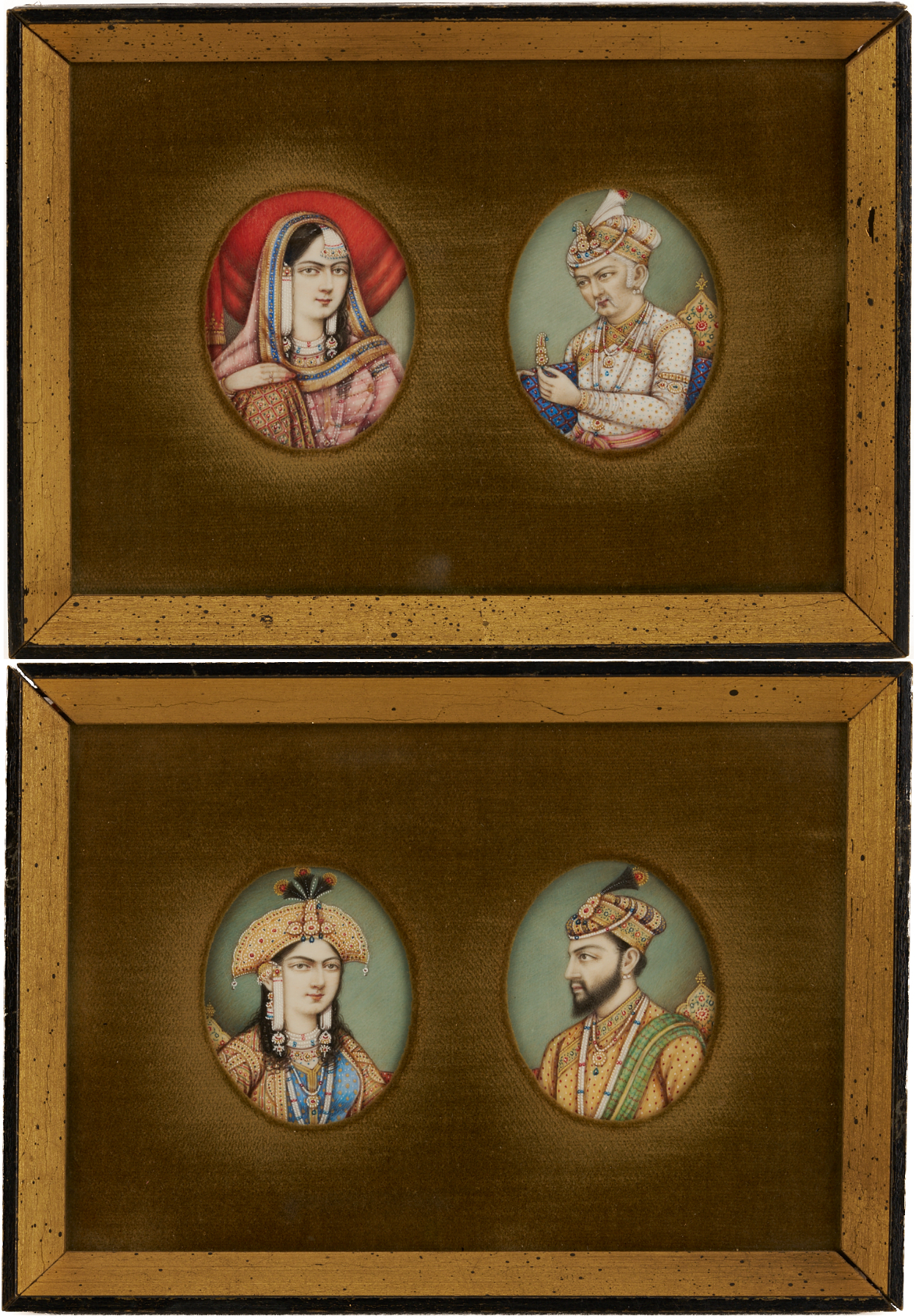 Anglo-Indian School, early 20th century, two (2) framed pairs of miniature watercolor portraits depicting the busts of 2 Indian noblemen and 2 women. Remnants of labels en verso refer to the subjects as the wife of Shah Jahan and his wife, Mumtaz Mahal (wearing the headdress with feathers) and Jahan’s father, Akbar along with Akbar’s wife (in pink dress). All framed within oval apertures of olive velvet mats under glass in 2 gilt and ebonized frames. Sight: 2 in. H x 1 3/4 in. W. Frames: 5 1/2 in. H x 7 3/4 in. W. Note: Mumtaz Mahal was born Arjumand Banu Begum (1593-1631) and was the chief consort of Mughal Emperor Shah Jahan (1592-1666). She died in childbirth at the age of 38, and Jahan commissioned the The Taj Mahal, often cited as one of the Wonders of the World, as her tomb and a monument to their eternal love. As with other Mughal royal ladies, no contemporary likenesses of her were accepted, but numerous imagined portraits were created after her death, particularly from the 19th century.