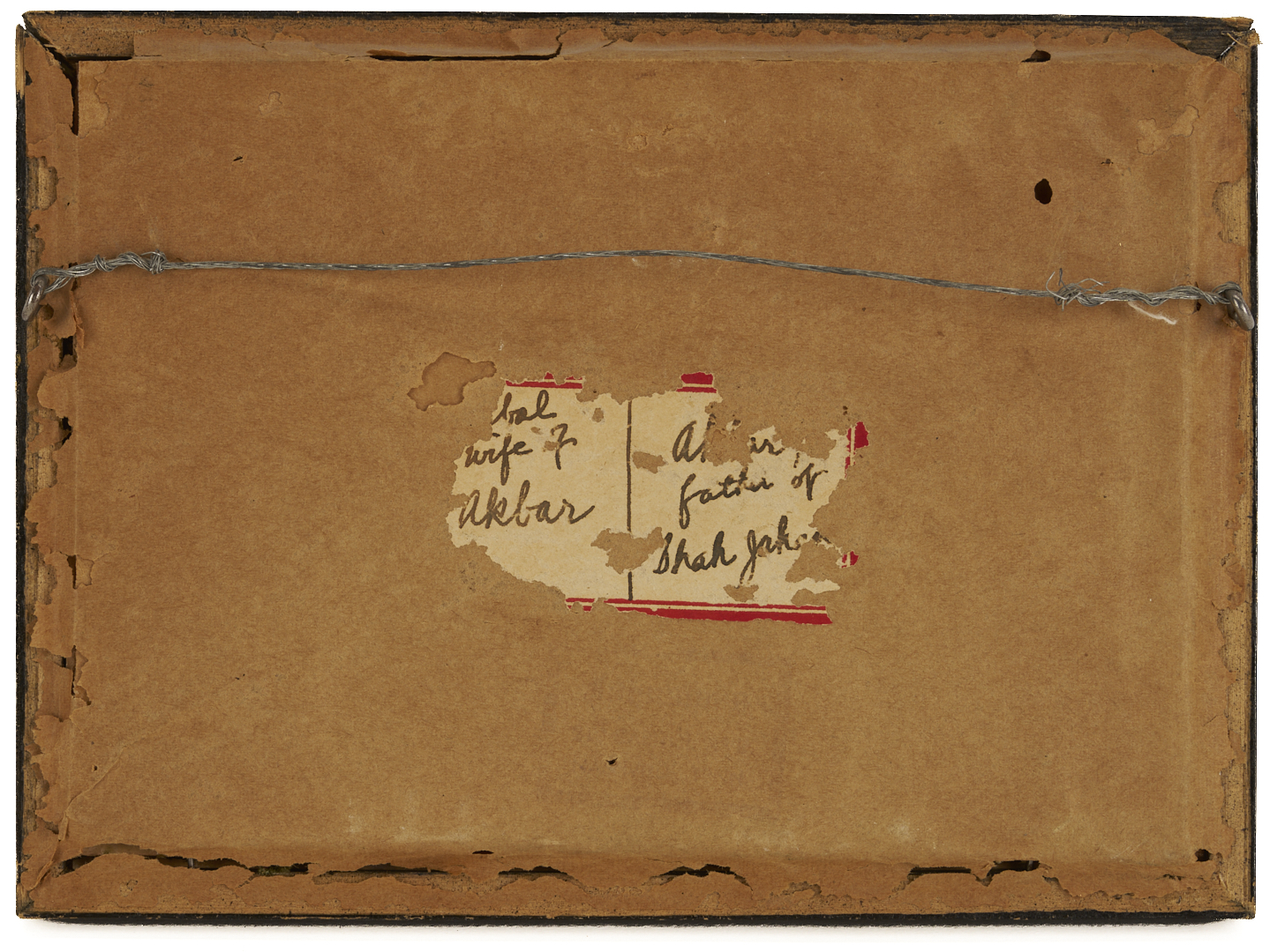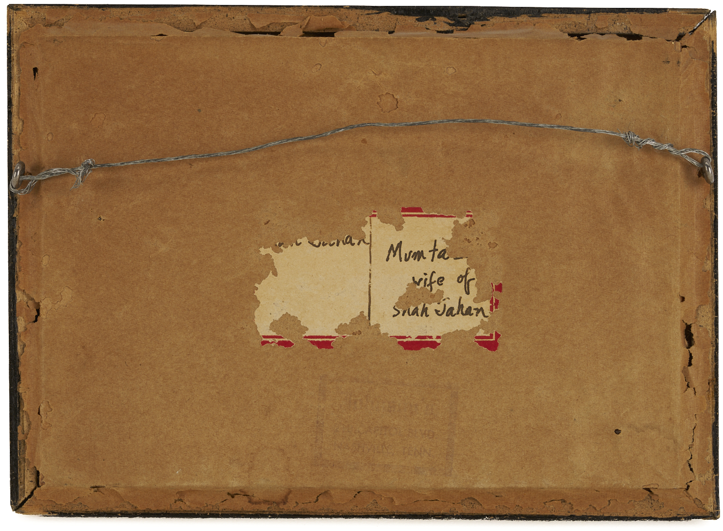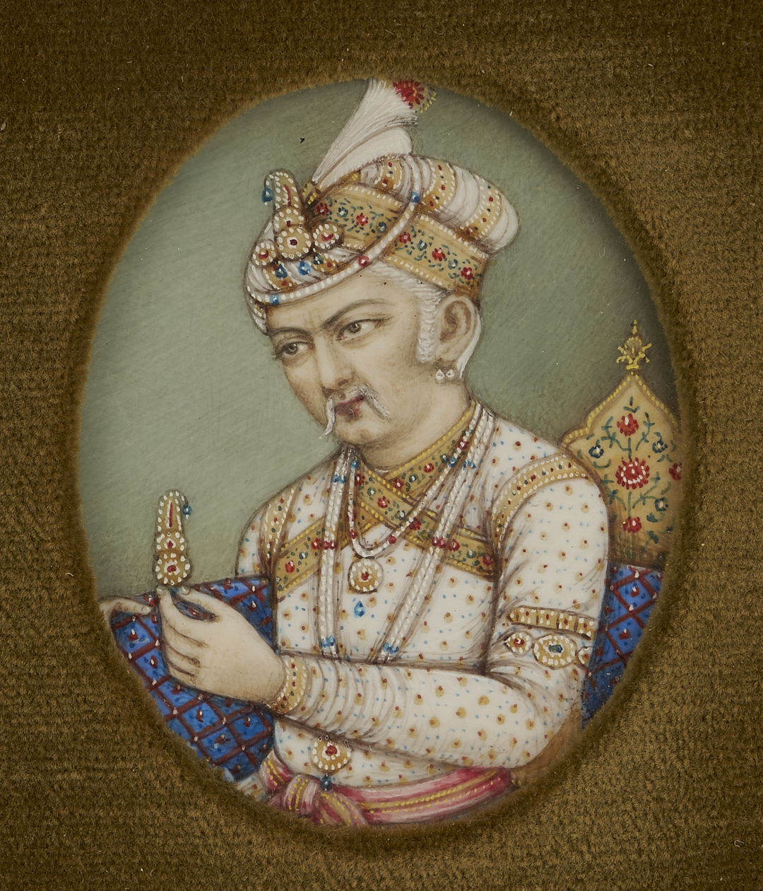 Anglo-Indian School, early 20th century, two (2) framed pairs of miniature watercolor portraits depicting the busts of 2 Indian noblemen and 2 women. Remnants of labels en verso refer to the subjects as the wife of Shah Jahan and his wife, Mumtaz Mahal (wearing the headdress with feathers) and Jahan’s father, Akbar along with Akbar’s wife (in pink dress). All framed within oval apertures of olive velvet mats under glass in 2 gilt and ebonized frames. Sight: 2 in. H x 1 3/4 in. W. Frames: 5 1/2 in. H x 7 3/4 in. W. Note: Mumtaz Mahal was born Arjumand Banu Begum (1593-1631) and was the chief consort of Mughal Emperor Shah Jahan (1592-1666). She died in childbirth at the age of 38, and Jahan commissioned the The Taj Mahal, often cited as one of the Wonders of the World, as her tomb and a monument to their eternal love. As with other Mughal royal ladies, no contemporary likenesses of her were accepted, but numerous imagined portraits were created after her death, particularly from the 19th century.