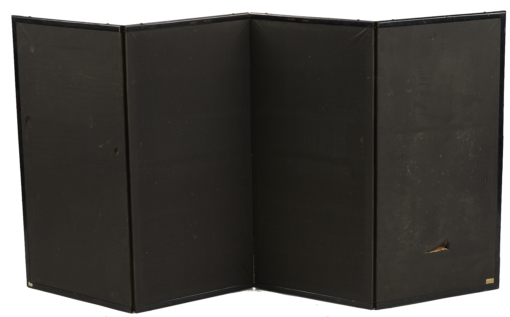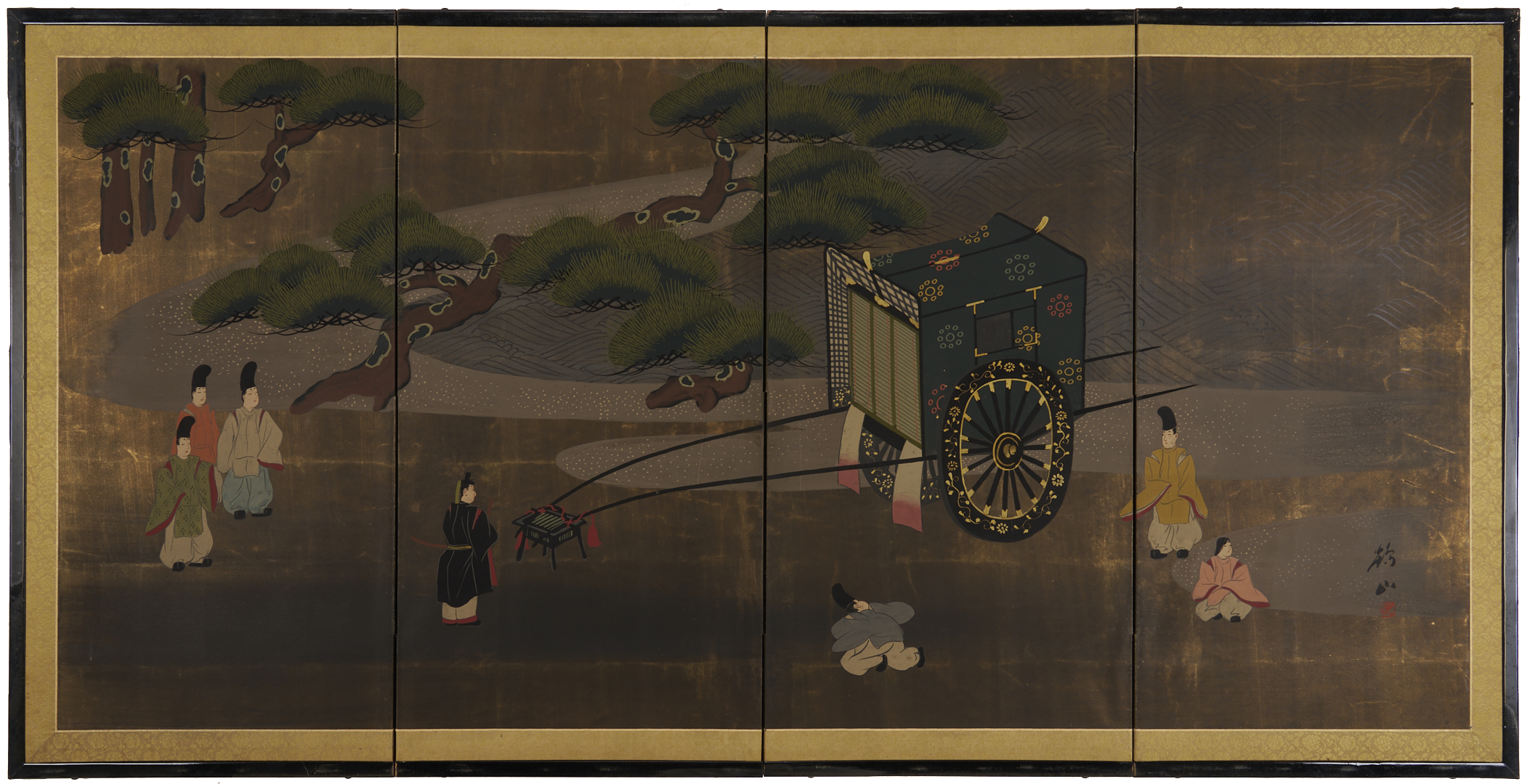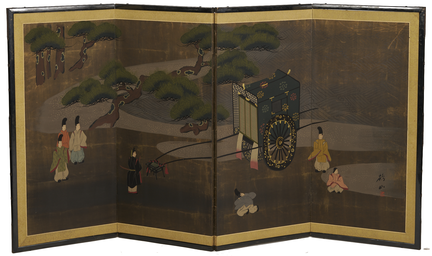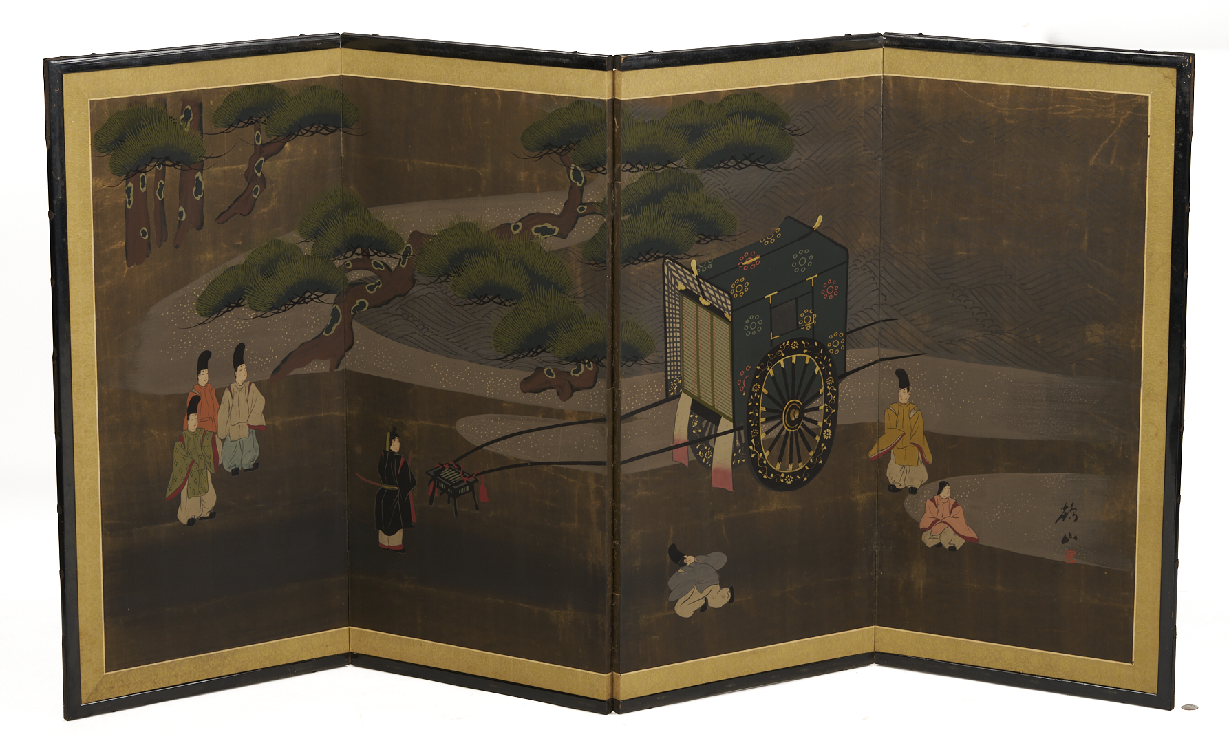 Japanese four-paneled folding screen painting depicting seven figures in a tree-filled landscape with a large, ornate rikshaw at center right. Inscribed and sealed to lower right. With Oriental Specialties, Madison, Wisconsin sticker affixed to backing. Mounted to an ebonized wood frame with gilt border surrounding image. 36 1/4 in. H x 72 in. W (18 in. W folded). Early to mid-20th century.