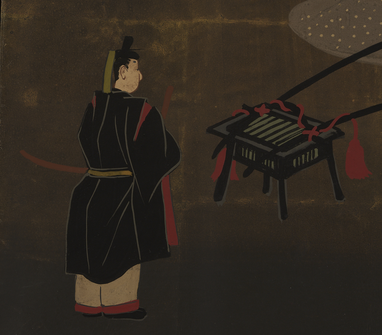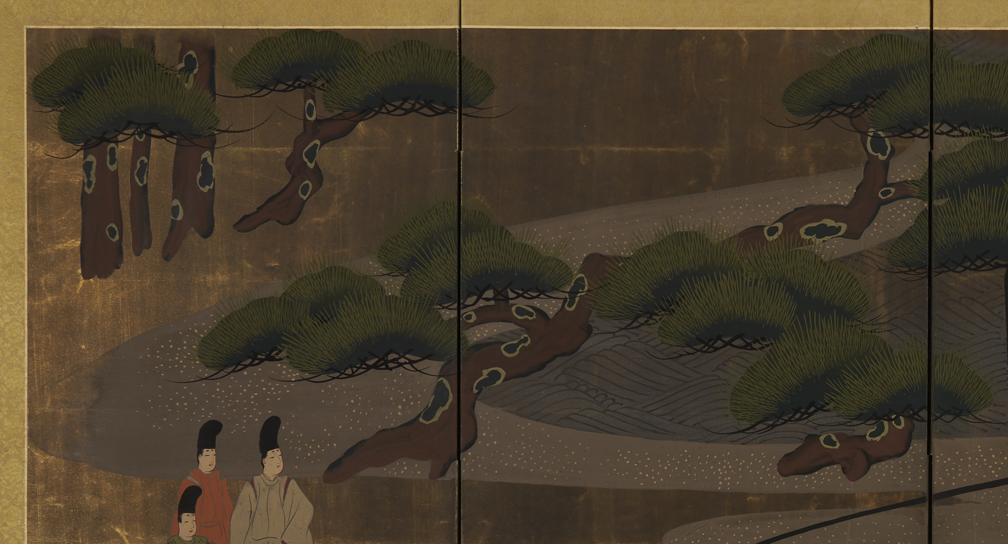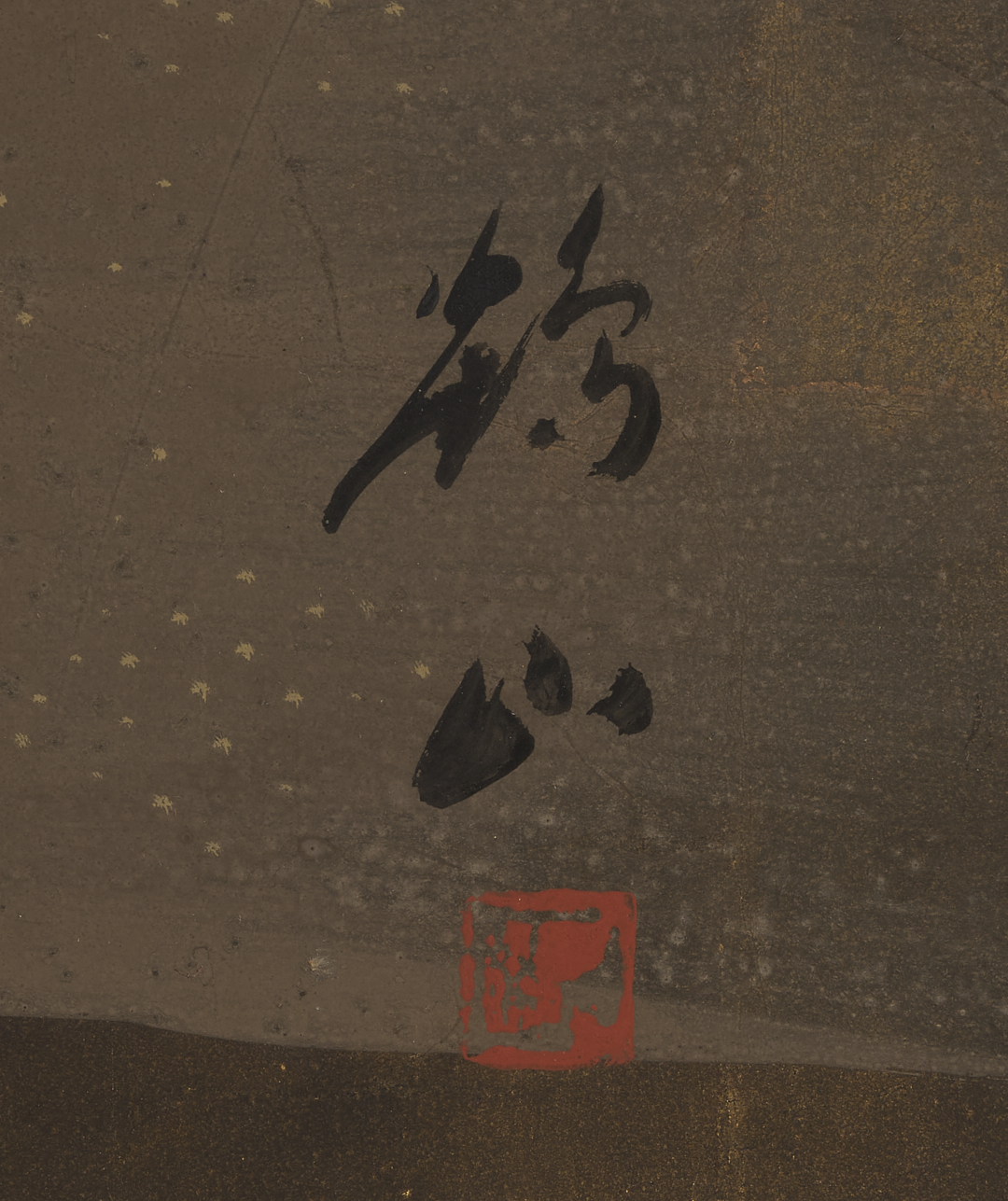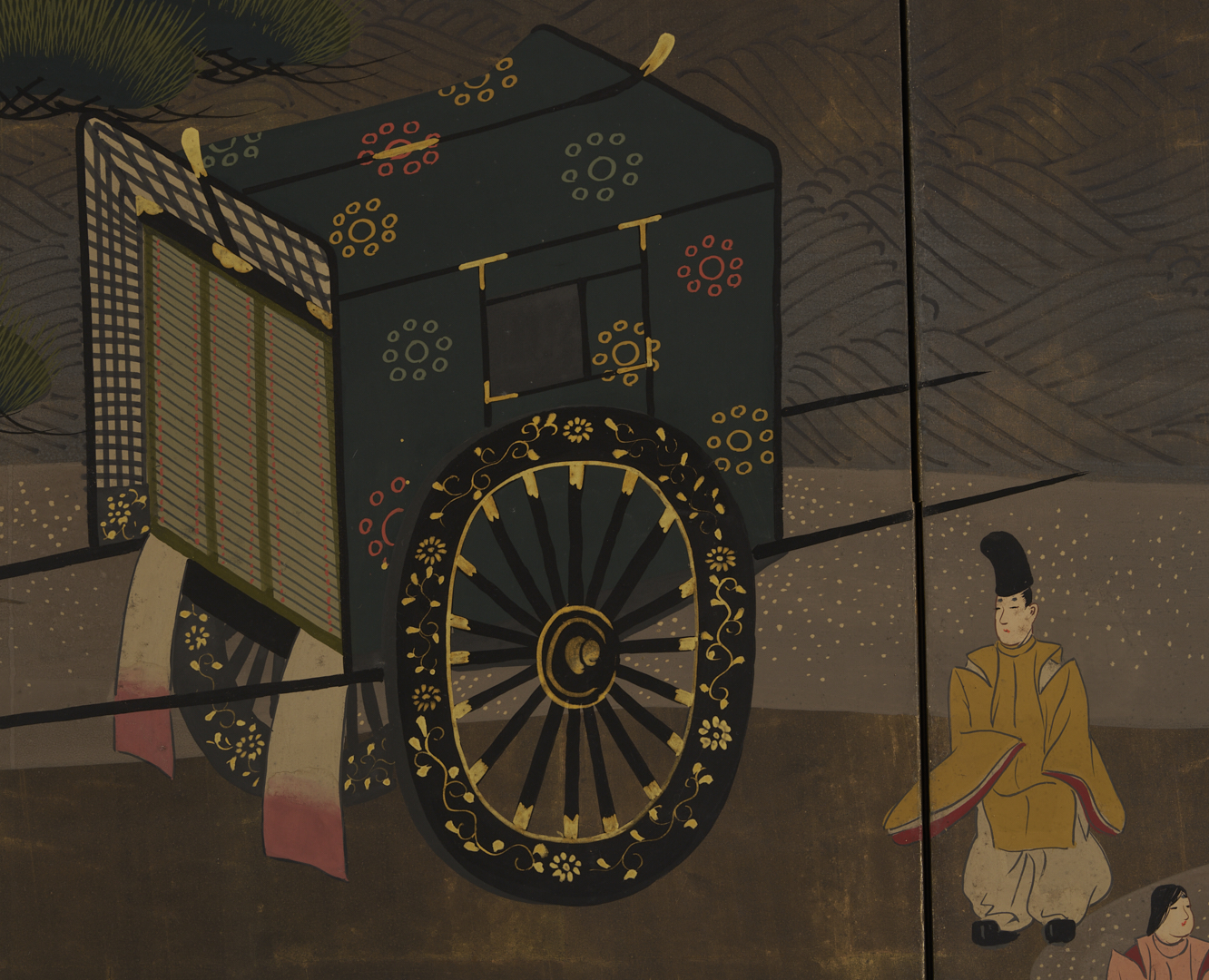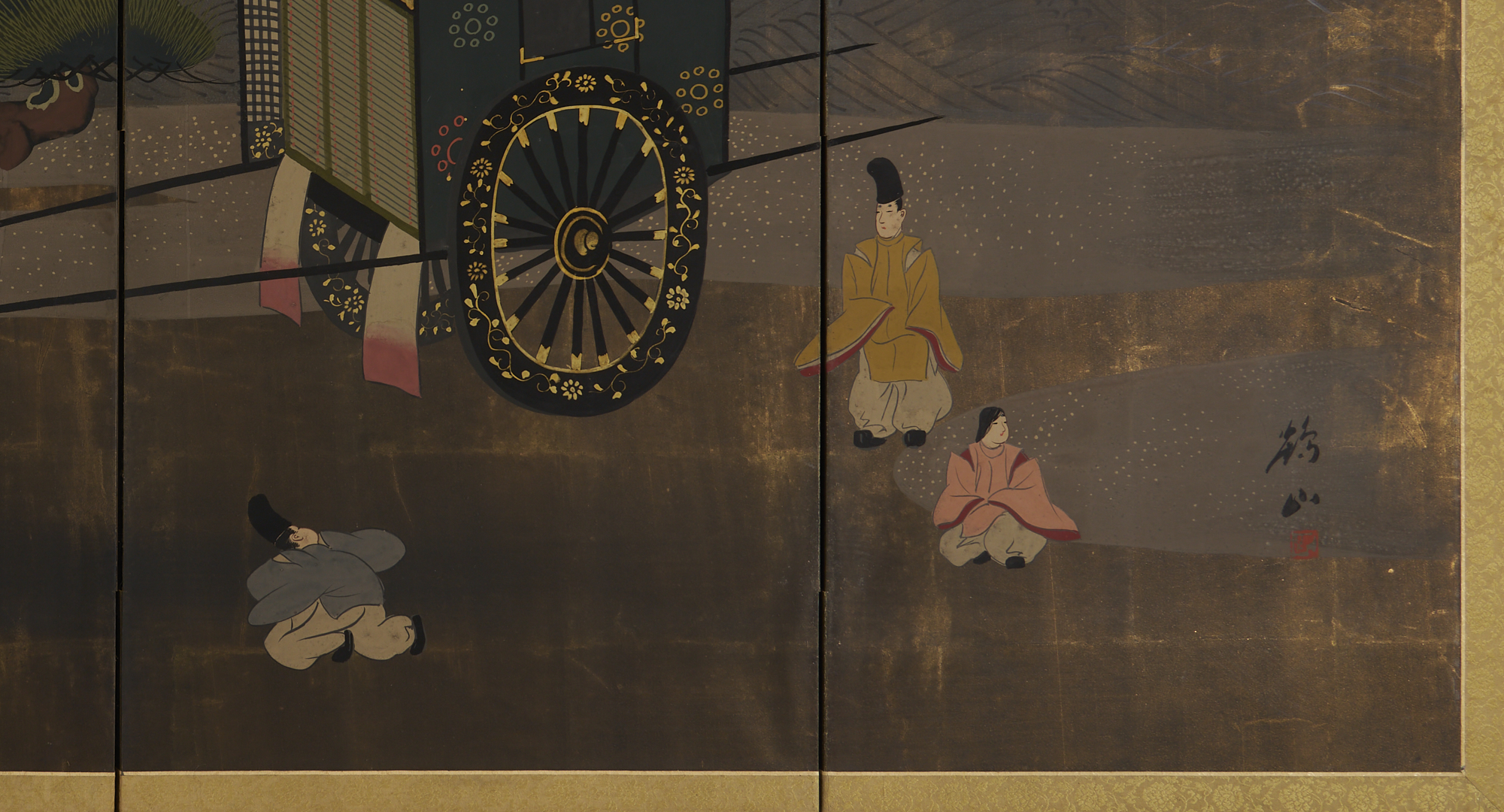 Japanese four-paneled folding screen painting depicting seven figures in a tree-filled landscape with a large, ornate rikshaw at center right. Inscribed and sealed to lower right. With Oriental Specialties, Madison, Wisconsin sticker affixed to backing. Mounted to an ebonized wood frame with gilt border surrounding image. 36 1/4 in. H x 72 in. W (18 in. W folded). Early to mid-20th century.