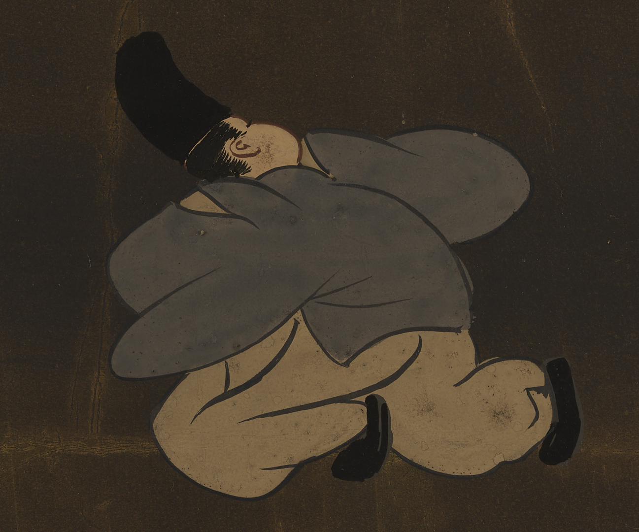 Overall very good condition. With scattered spotting or minor abrasions to screen plus minor discoloration primarily to background. Backing with surface grime and punctures, does not affect painting.