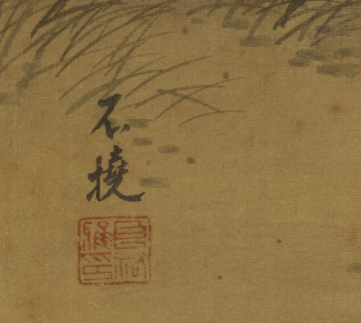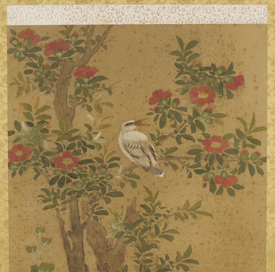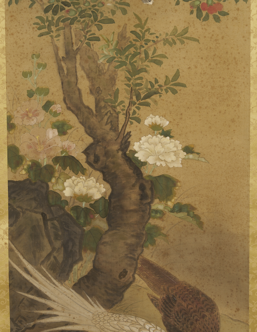 Chinese watercolor on silk scroll painting depicting birds in a landscape setting, signed in calligraphy lower left. Mounted to grasscloth and framed under glass in a shadowbox frame with molded wood edges. Scroll: approximately 40 in. H x 16 in. W. Frame: 65 in. H x 30 in. W. Early to mid 20th century.
