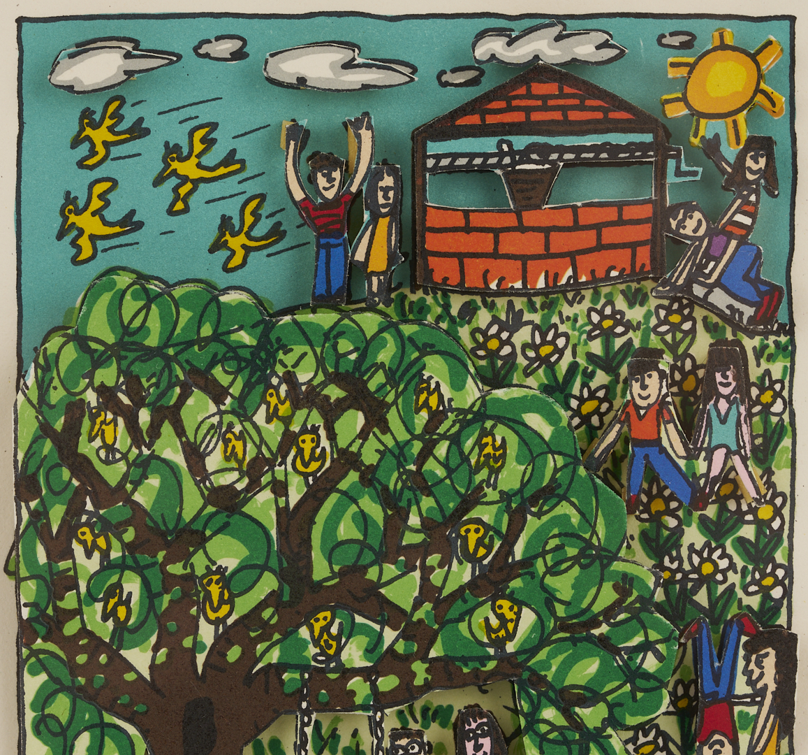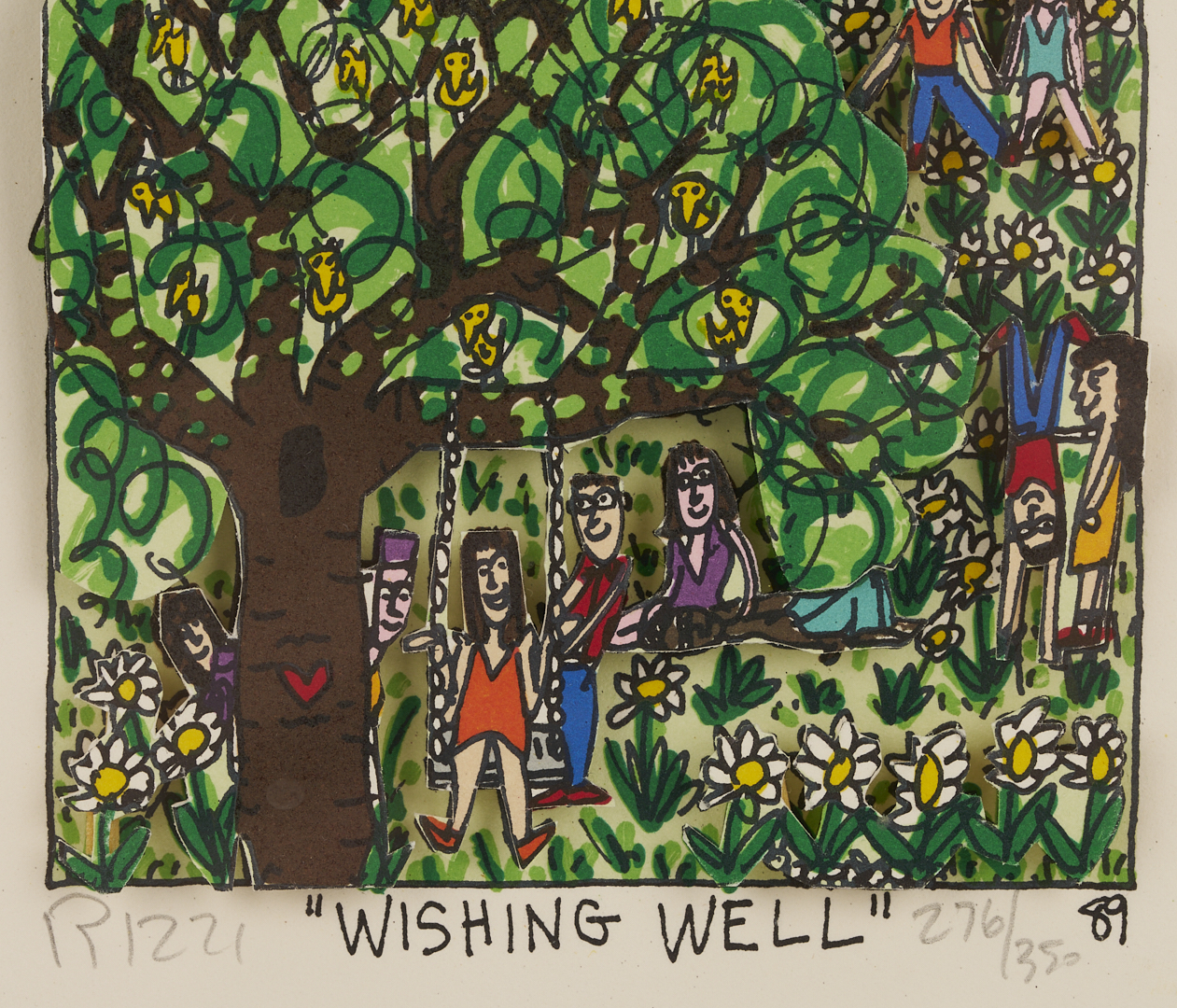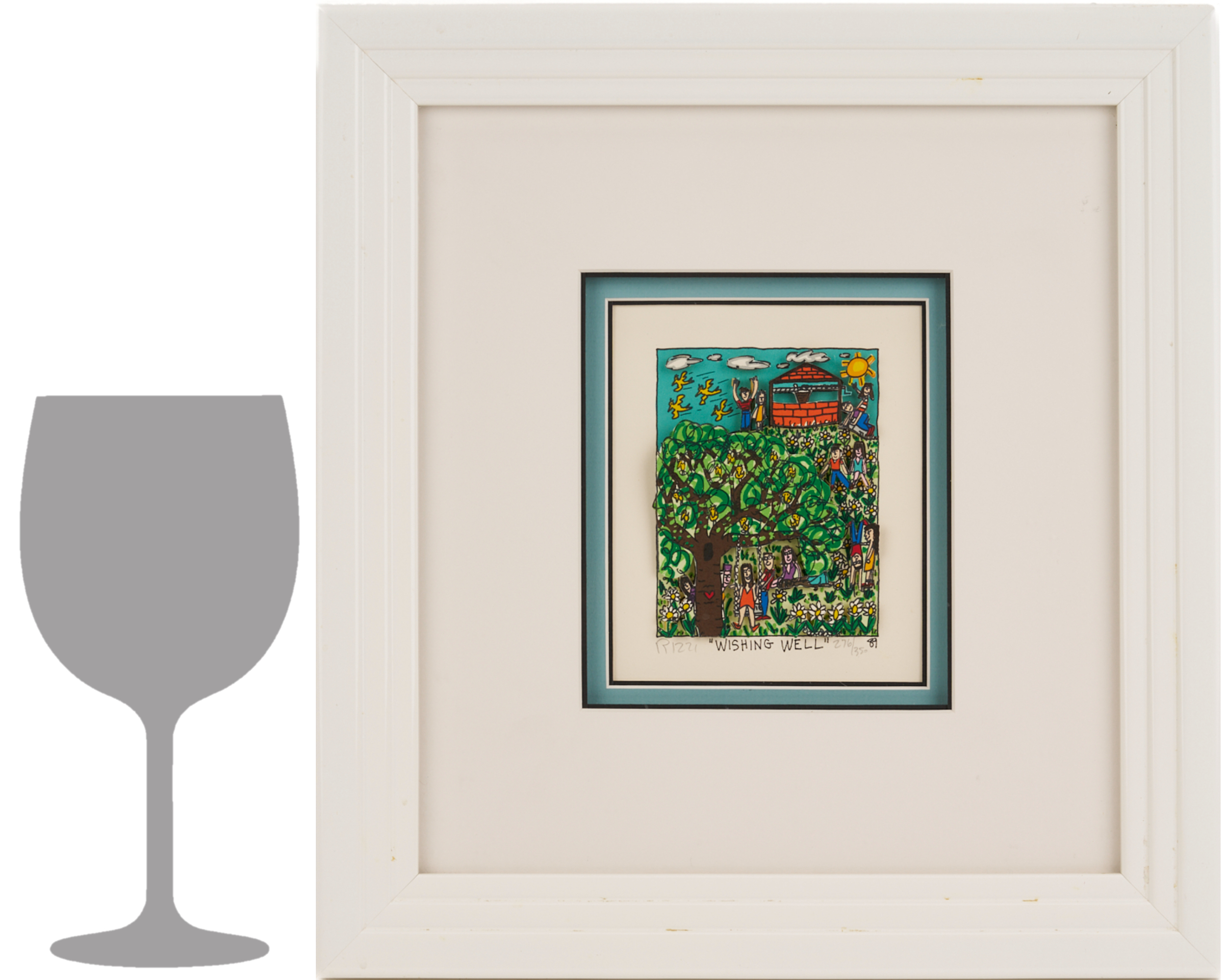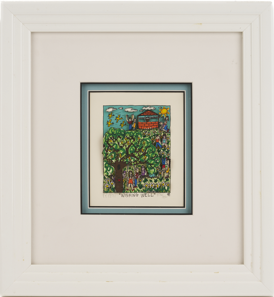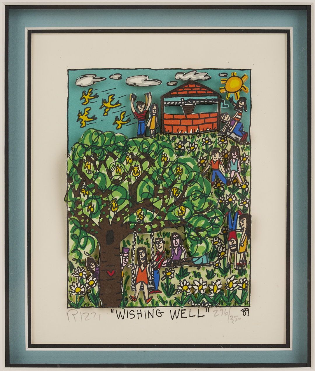 James Rizzi (American, 1950-2011), “Wishing Well,” 1989, 3D Screenprint in Colors on BFK Rives Paper, signed “Rizzi” lower left and numbered 276/350 lower right. Framed and matted under plexiglass in a white frame. Sight: 5 3/4 in. H x 4 5/8 in. W. Frame: 14 in. H x 13 in. W.