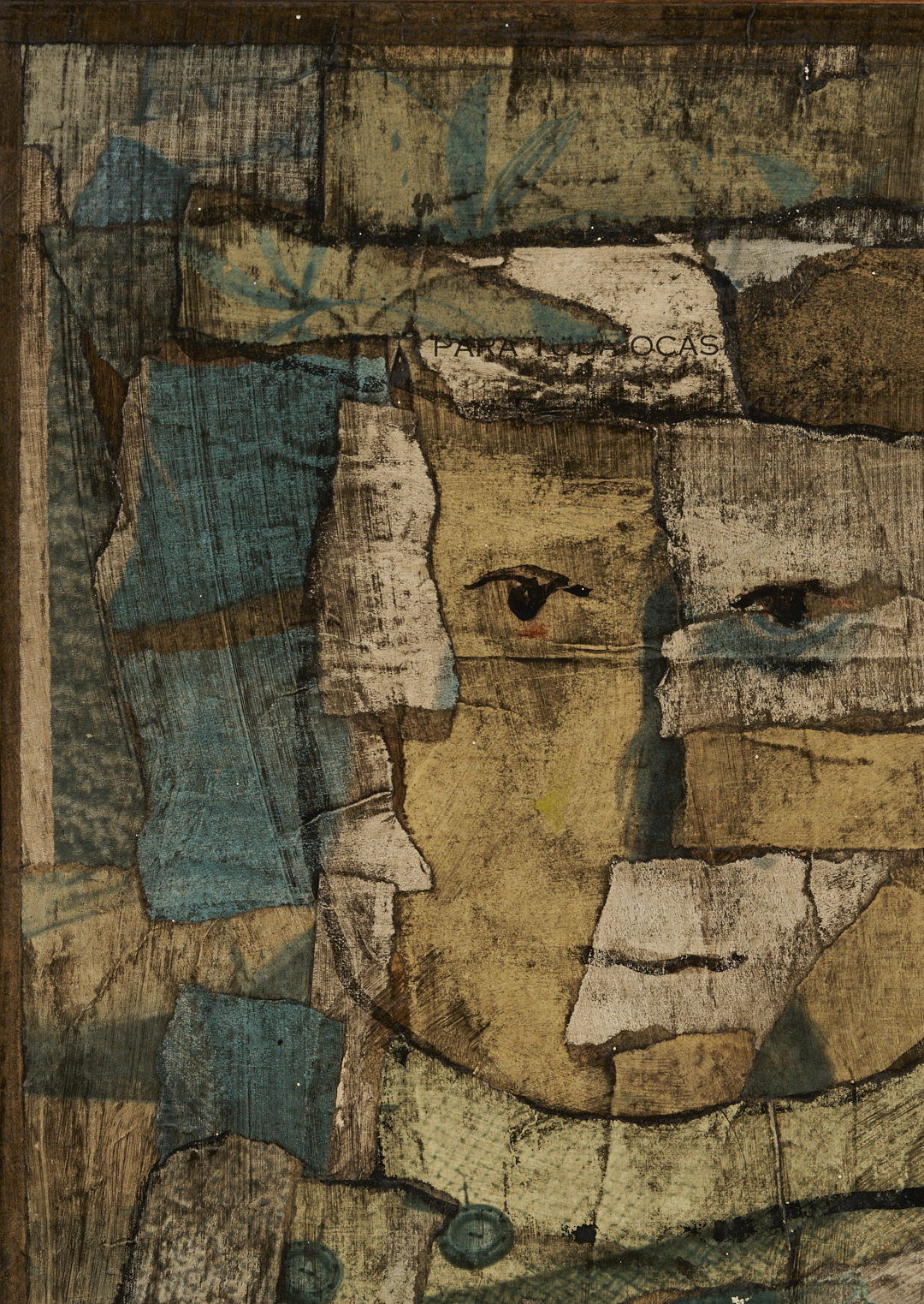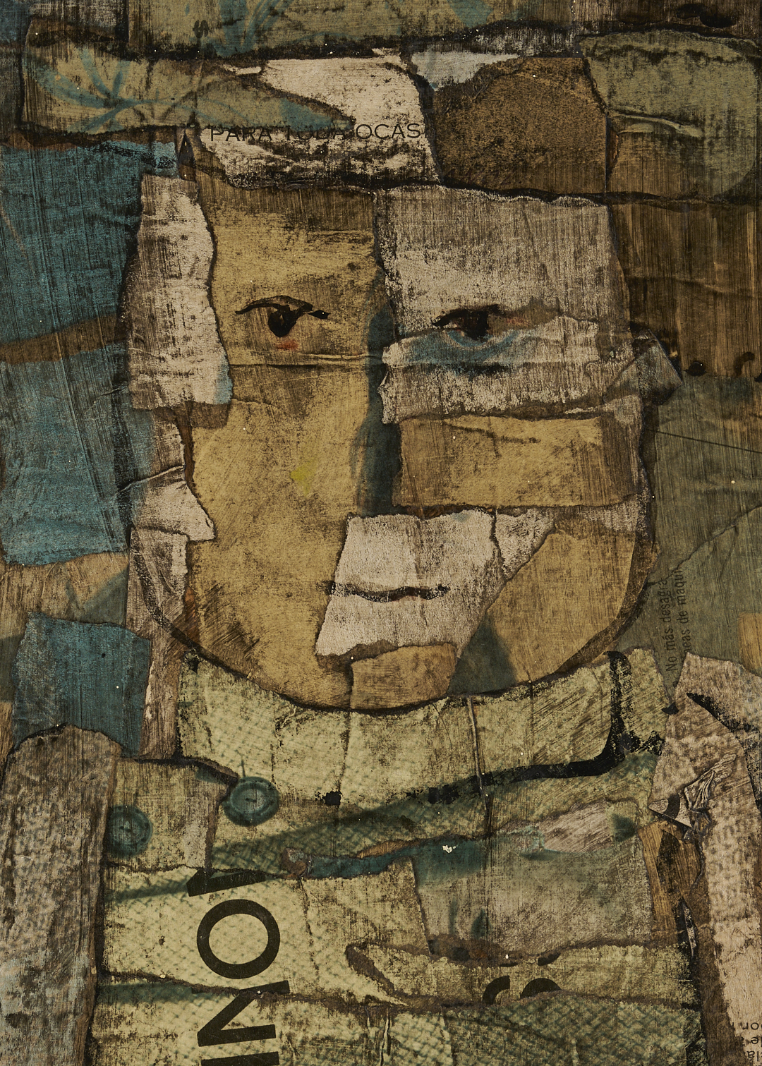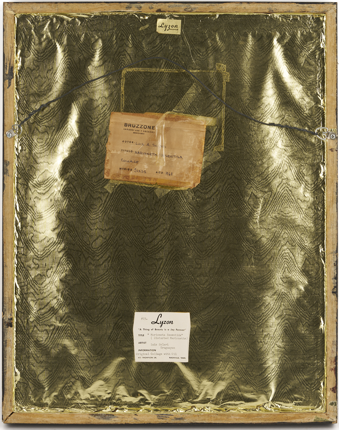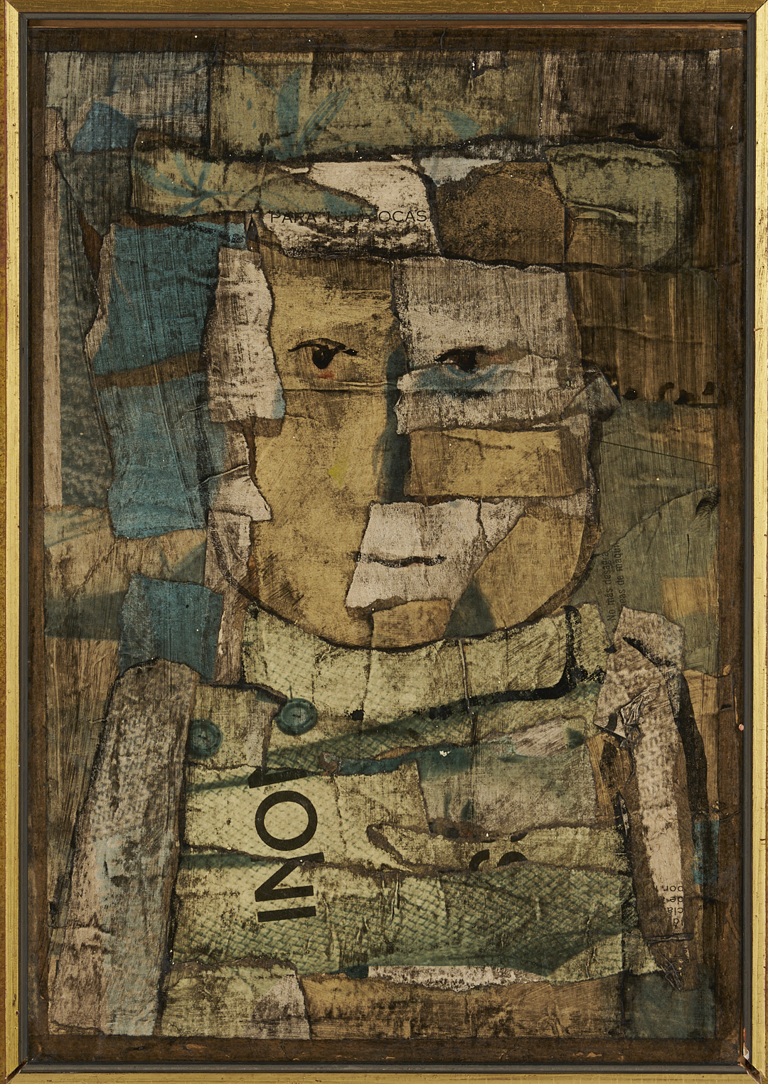 Louis Alberto Solari (Uruguay, 1918-1993) collage with painting, “Marionetta Resentida” (Resentful Marionette), 1968. A half-length figure with a wide hat — painted atop a collage of found paper, some with text — looks directly at the viewer. With Lyzon, Nashville, and Bruzzone, Montevideo gallery labels affixed to verso. Double-framed in painted and giltwood frames with giltwood mount. Sight: 14 1/4 in. H x 9 3/4 in. W. Framed: 21 3/4 in. H x 17 1/4 in. W.
