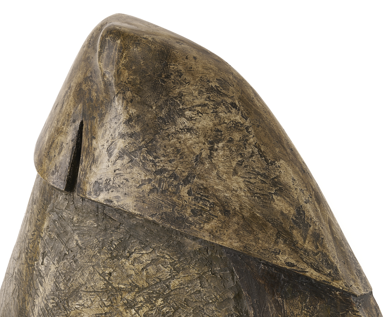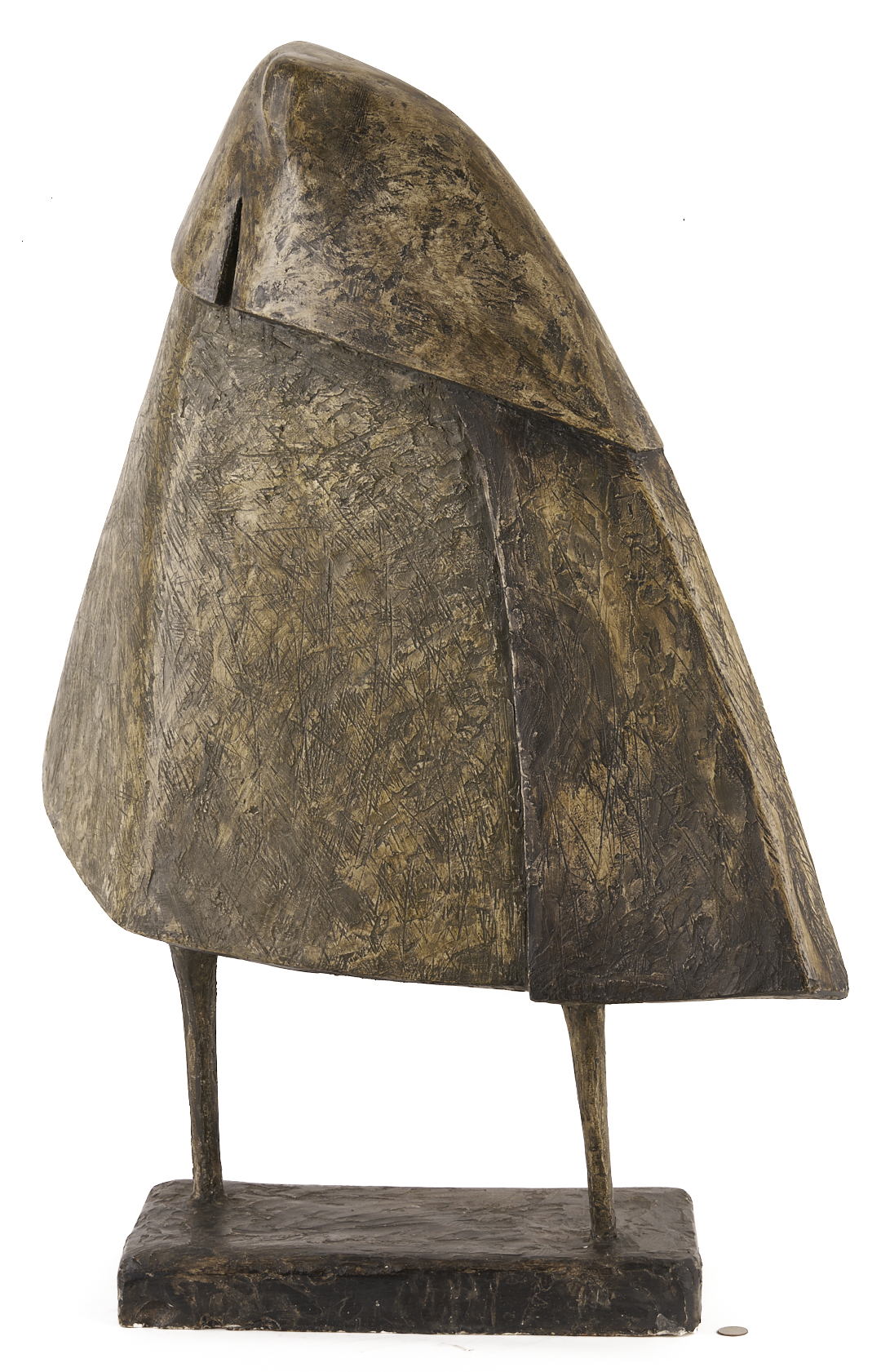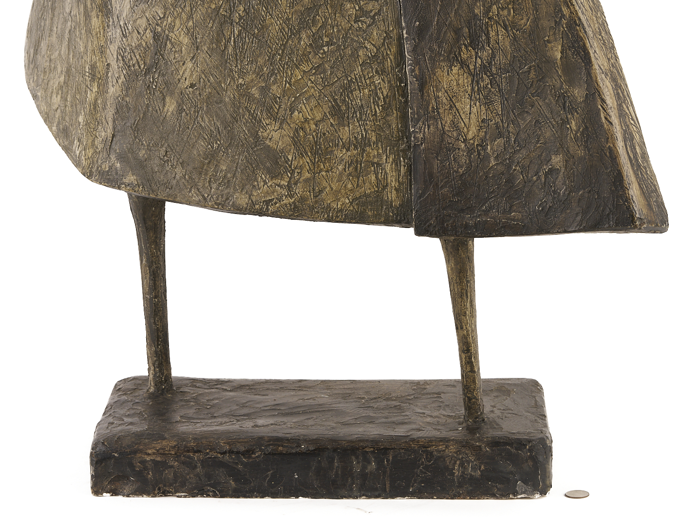 Large modernist abstract textured ceramic sculpture depicting an indeterminate figure, possibly hooded, supported on two leg-like supports and mounted to a rectangular base. Unsigned. 39 1/2 in. H x 36 in. W x 17 1/2 in. D. Mid to late 20th century.