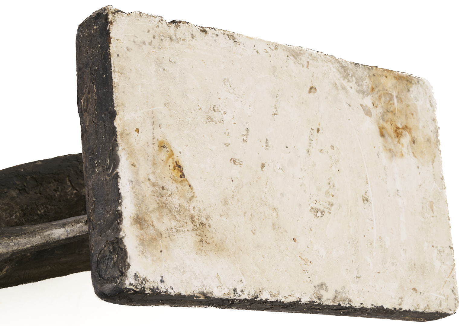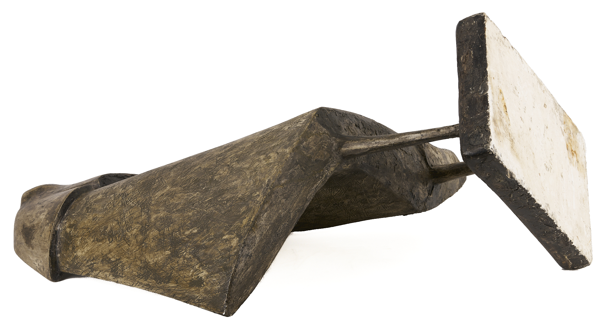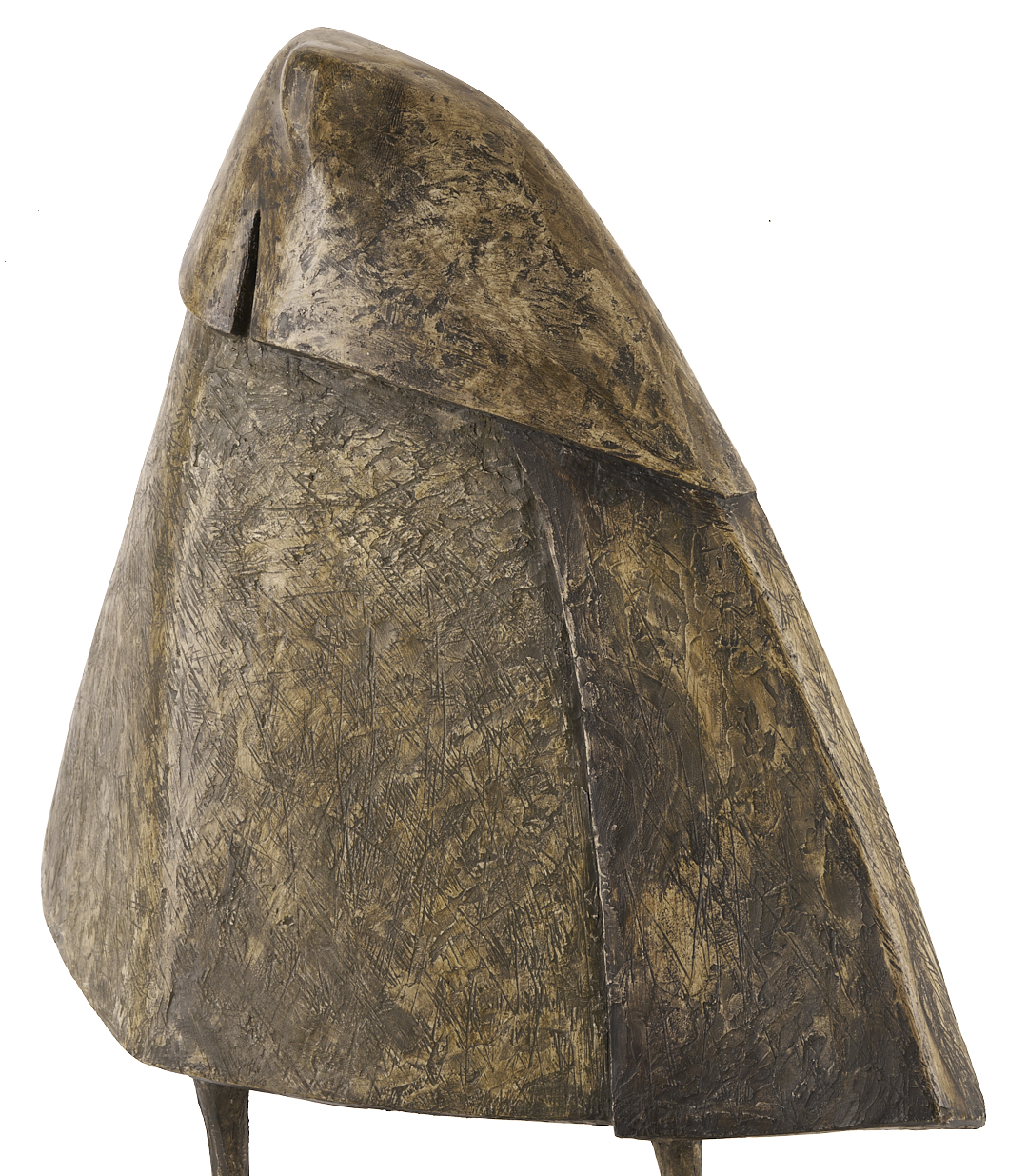Large modernist abstract textured ceramic sculpture depicting an indeterminate figure, possibly hooded, supported on two leg-like supports and mounted to a rectangular base. Unsigned. 39 1/2 in. H x 36 in. W x 17 1/2 in. D. Mid to late 20th century.