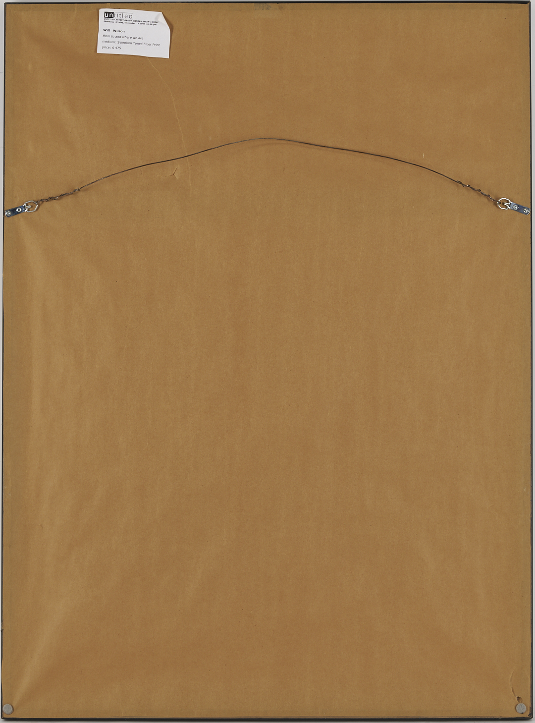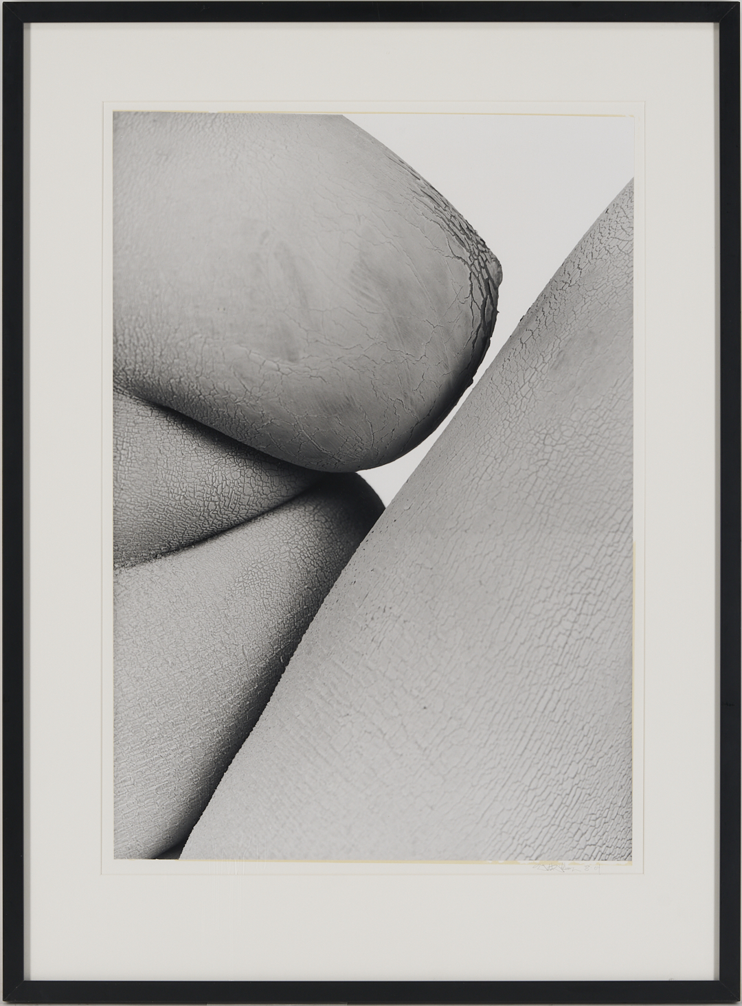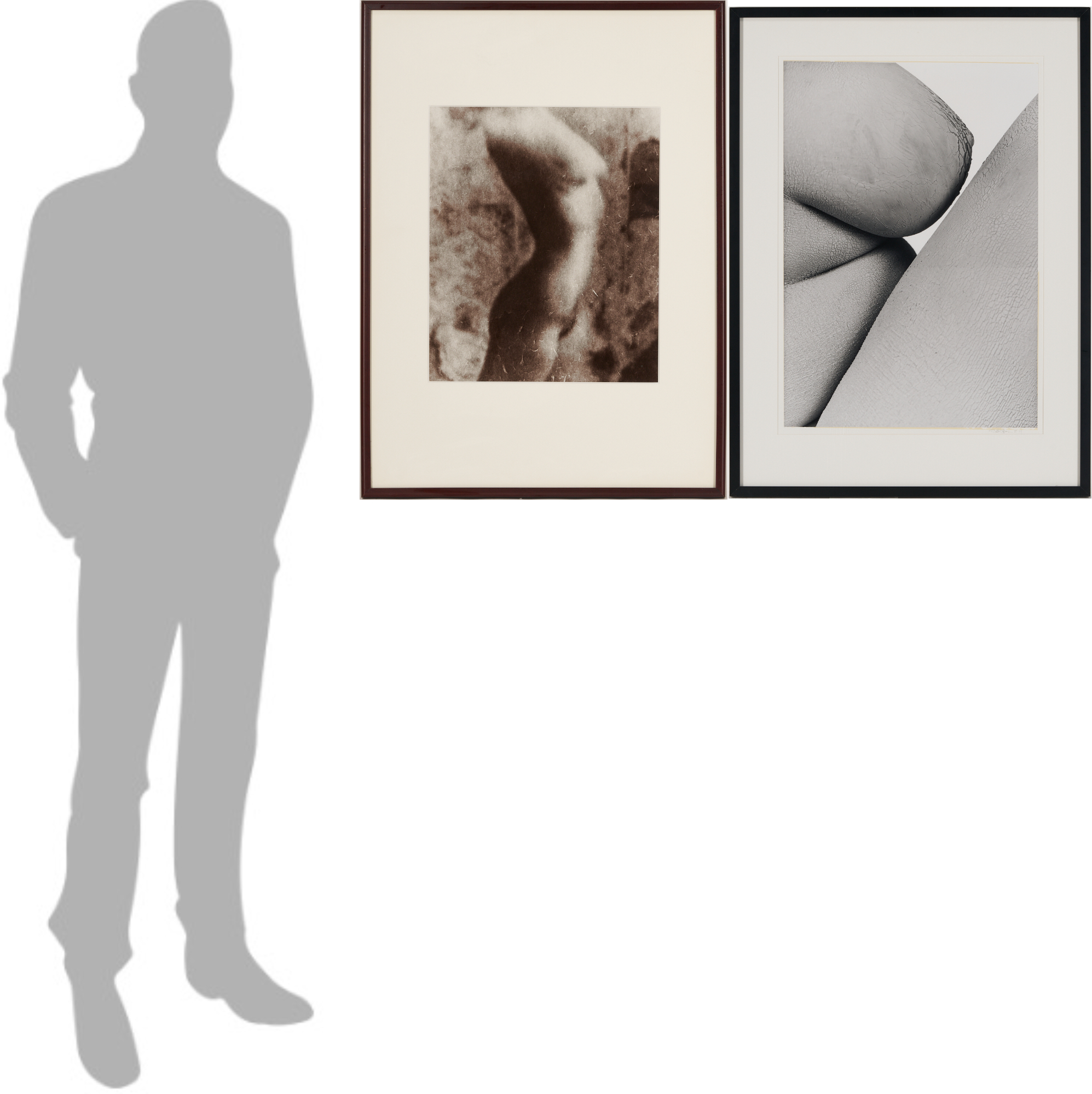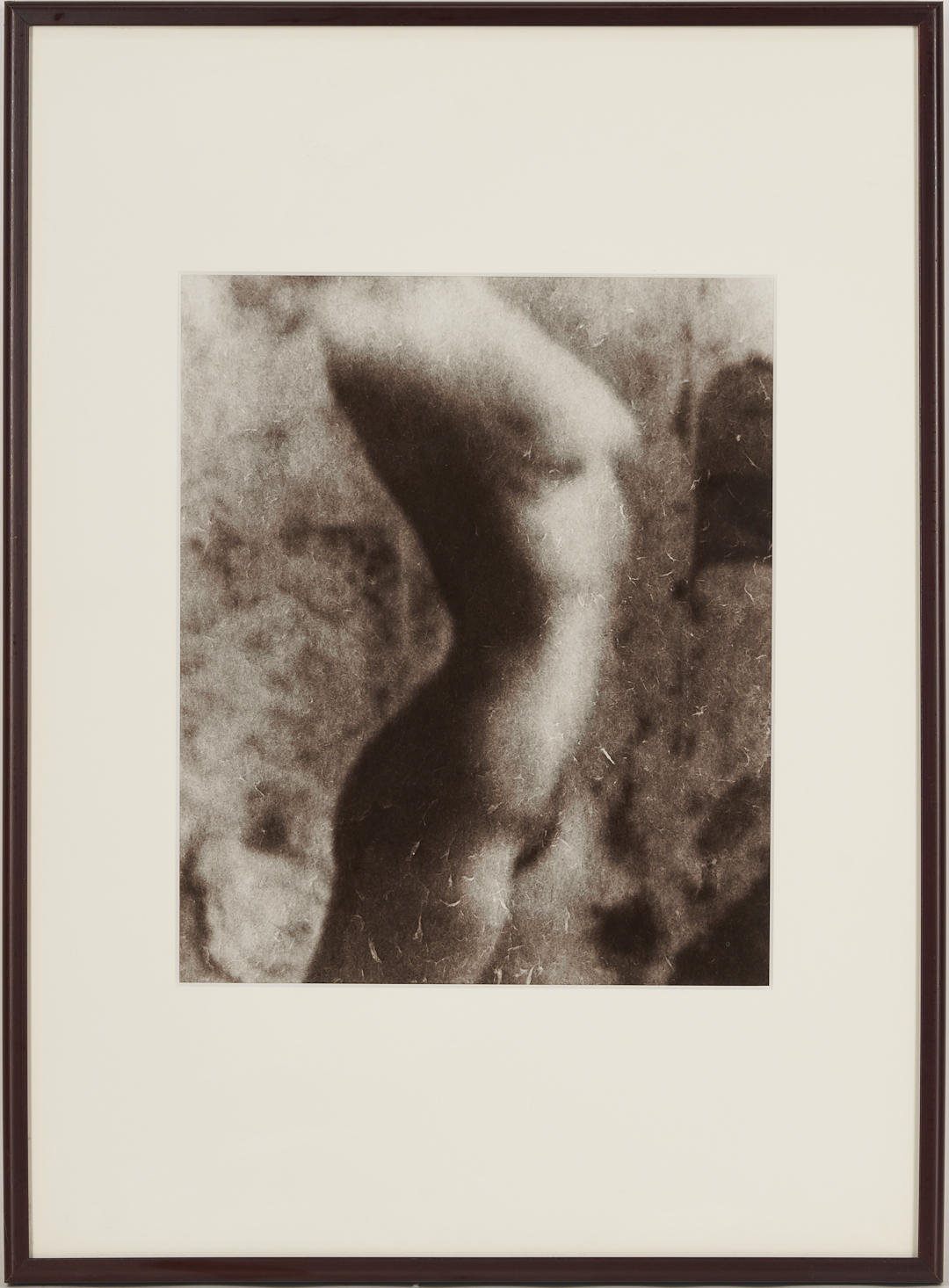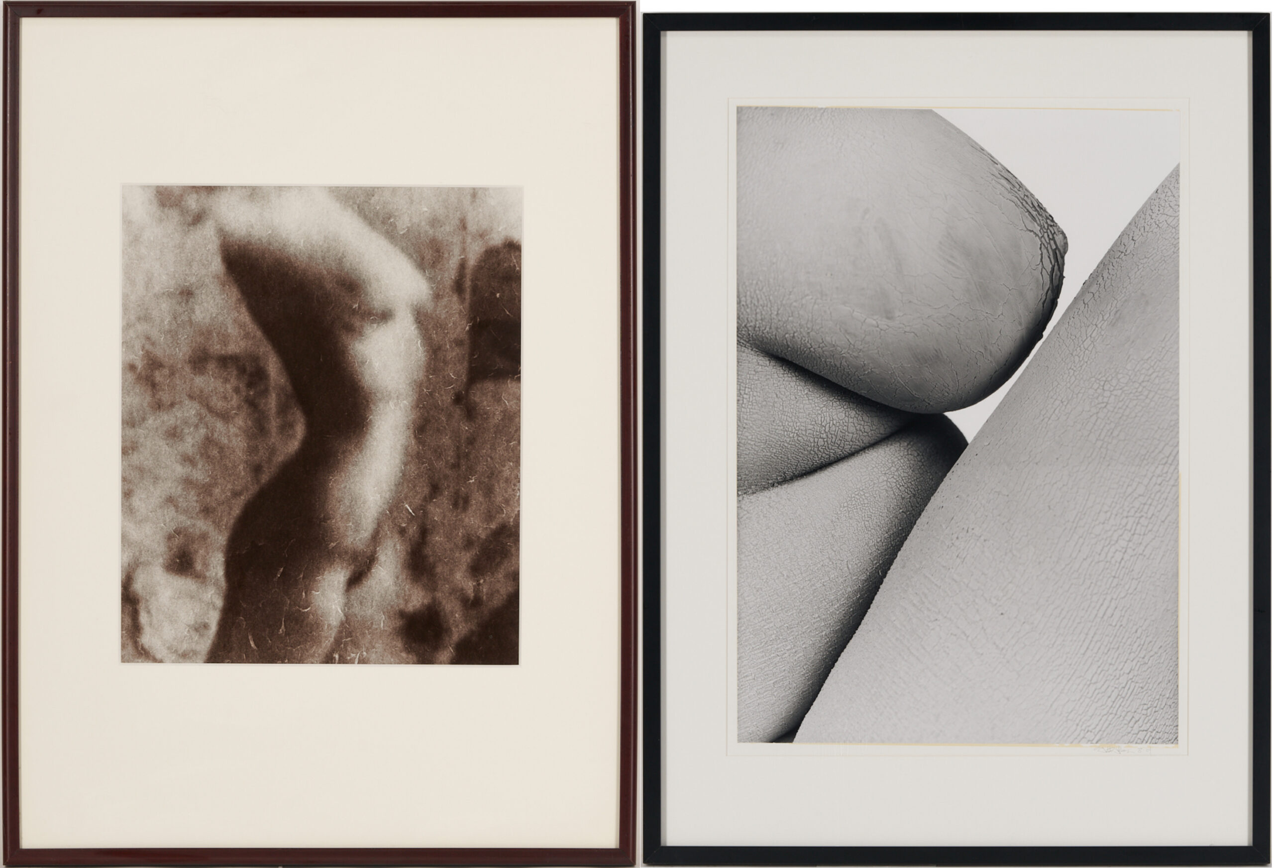 1st item: Stephen Coan (American, 20th/21st century) black and white silver gelatin photograph, “Rachel,” that depicts the blurred, nude torso of a female. Housed in a brown wood frame with a white mat. Sight: 18 in. H x 15 in. W. Framed: 33 in. H x 24 1/4 in. W. 2nd item: Will Wilson (Nashville, 20th/21st century) black and white selenium toned fiber print, “from to and where we are,” that depicts a woman’s breast, stomach, and thigh covered with crackled mud or a similar material, 2004. Signed and dated in pencil, lower right. Title card label from previous exhibition affixed to backing. Floated under glass in a metallic frame with white mat. Sheet: 28 1/2 in. H x 20 in. W. Framed: 32 1/2 in. H x 28 1/2 in. W.